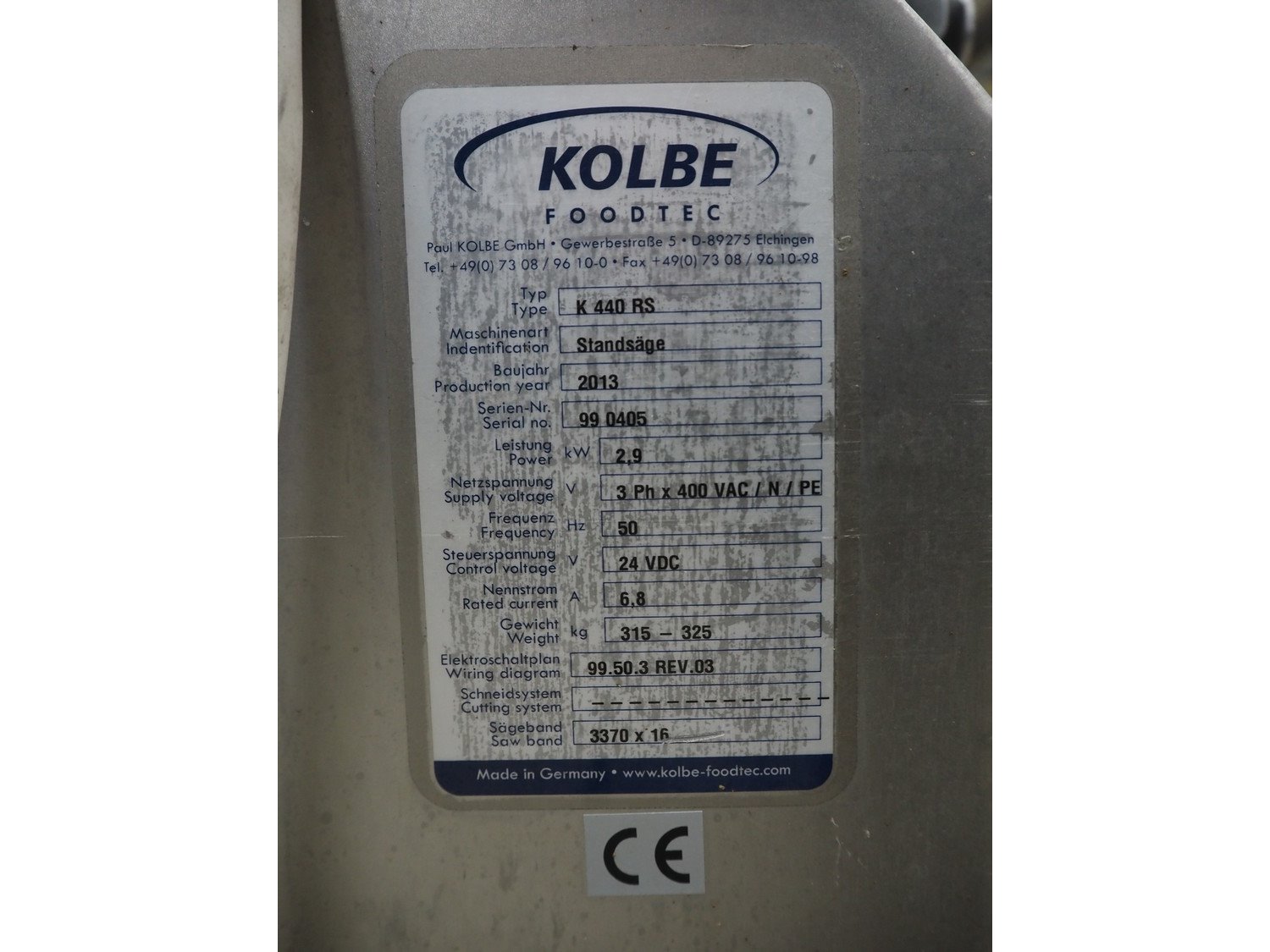 Kolbe bandsaw, type: K 440 RS, serial number: 99 0405, year of construction: 2013, 400 V, 3 Ph, 50 Hz, 6.8 A, 2.9 kW, weight: 315/325 kg, table dimensions: 900 mm x 840 mm, total dimensions: 1000 mm x 950 mm x 1850 mm. Kavel locatie: Looyenbeemd 11, 5652 BH Eindhoven, Nederland