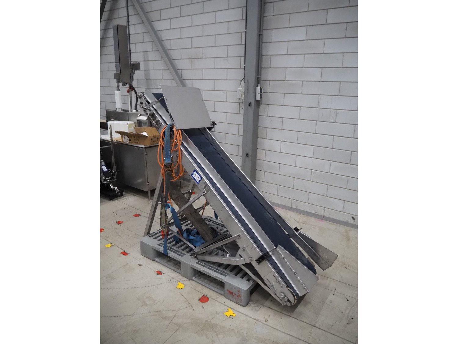 Wichelmann Metallbau elevating belt, plastic belt, belt width: 400 mm, elevating height: 1450 mm, total dimensions: 1750 mm x 620 mm x 1600 mm. Kavel locatie: Looyenbeemd 11, 5652 BH Eindhoven, Nederland