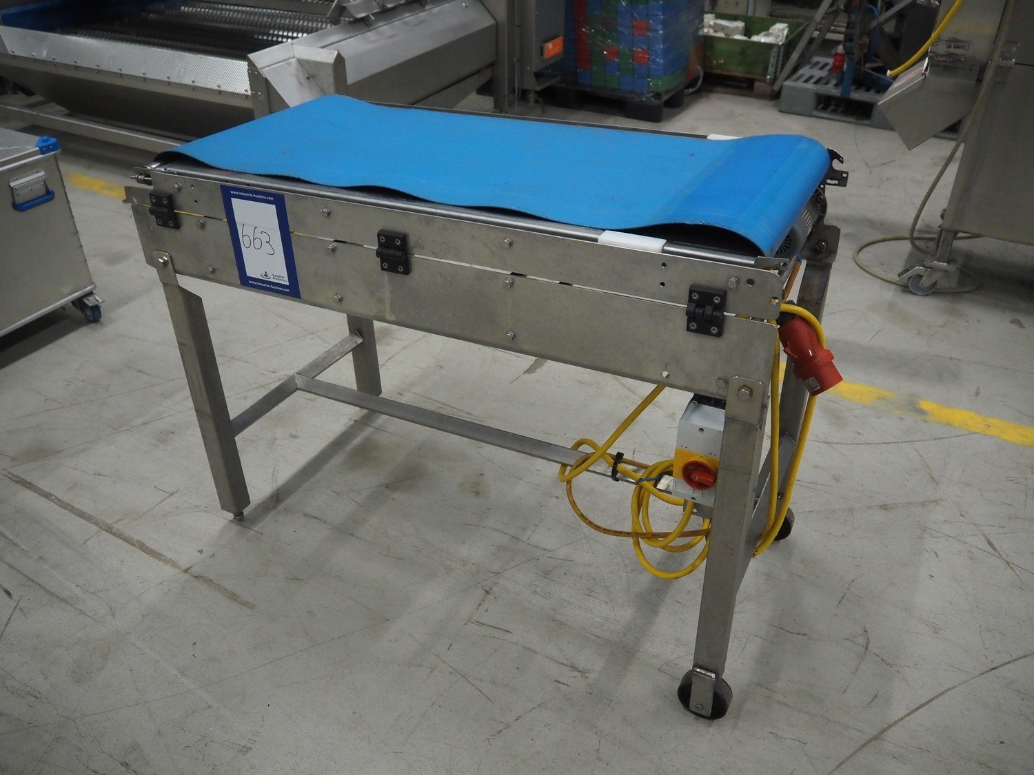 Mobile transport belt, plastic belt, belt width: 500 mm, total dimensions: 1300 mm x 650 mm x 1000 mm. Kavel locatie: Looyenbeemd 11, 5652 BH Eindhoven, Nederland