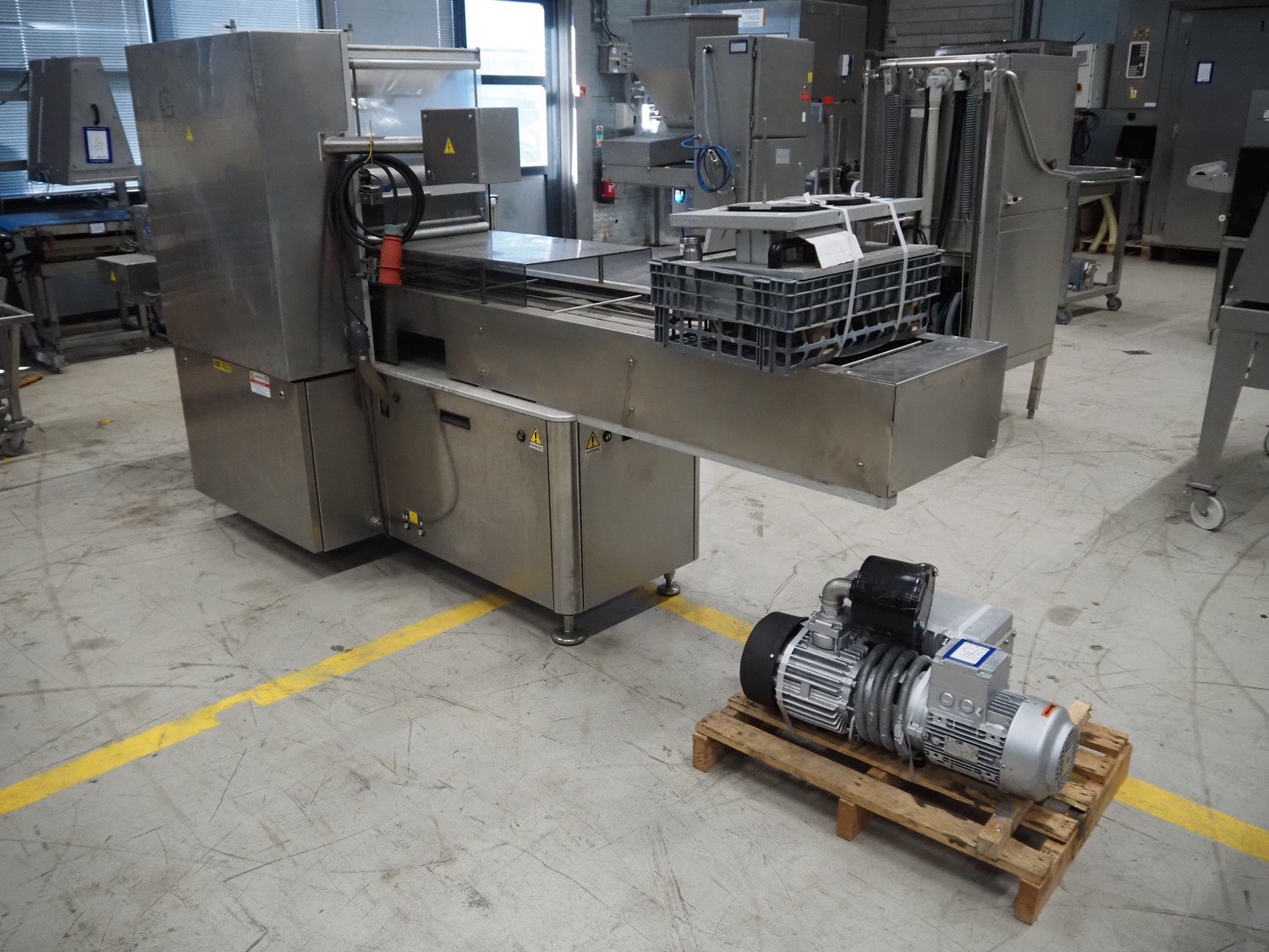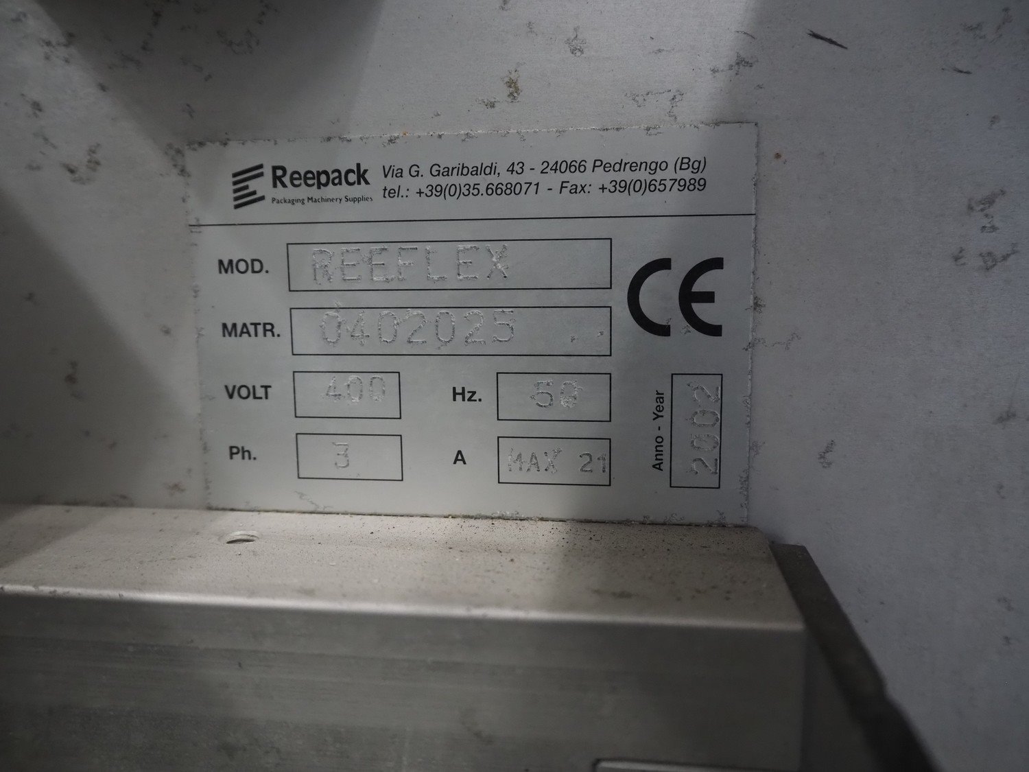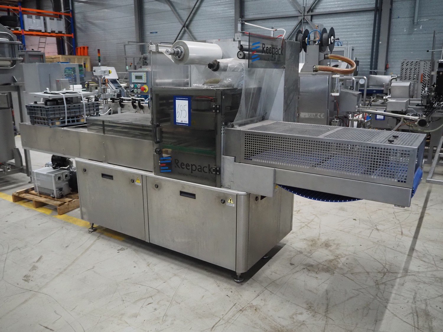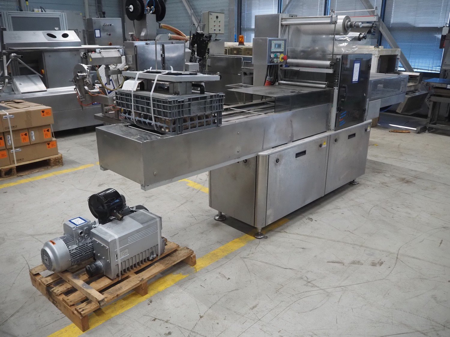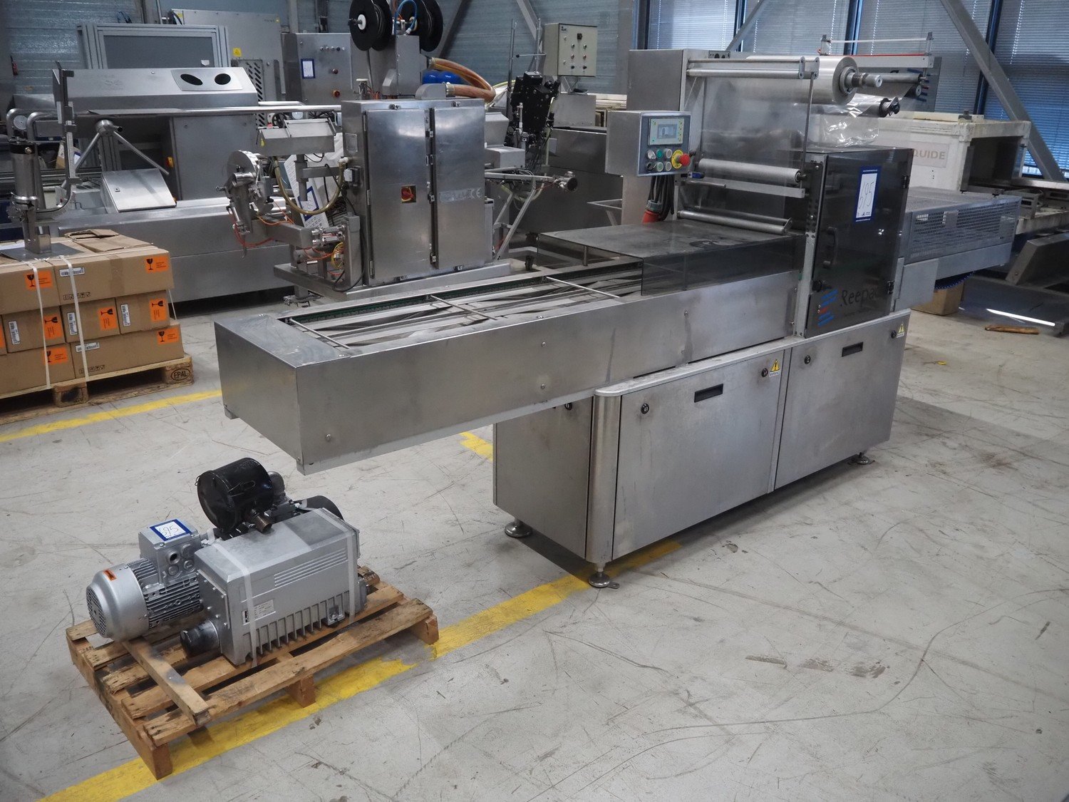 Reepack traysealer, model: Reeflex, serial number: 0402025, year of construction: 2002, 400 V, 3 Ph, 50 Hz, 21 A, s/s chain and pin conveyor, belt width: 360 mm, distance between dividers: 440 mm, divider height: 20 mm, 2 lanes, lane width: 140 mm, film width: 400 mm, dimensions dyes: (2x) 220 mm x 140 mm, plastic outfeed belt, belt width: 420 mm, total dimensions: 3550 mm x 900 mm x 1750 mm. With additional dye, dimensions dye: (2x) 220 mm x 140 mm, and Busch vacuum pump, type: RA 0100 E 503, number: 03018852, capacity: 100 m³ per hour. Kavel locatie: Looyenbeemd 11, 5652 BH Eindhoven, Nederland
