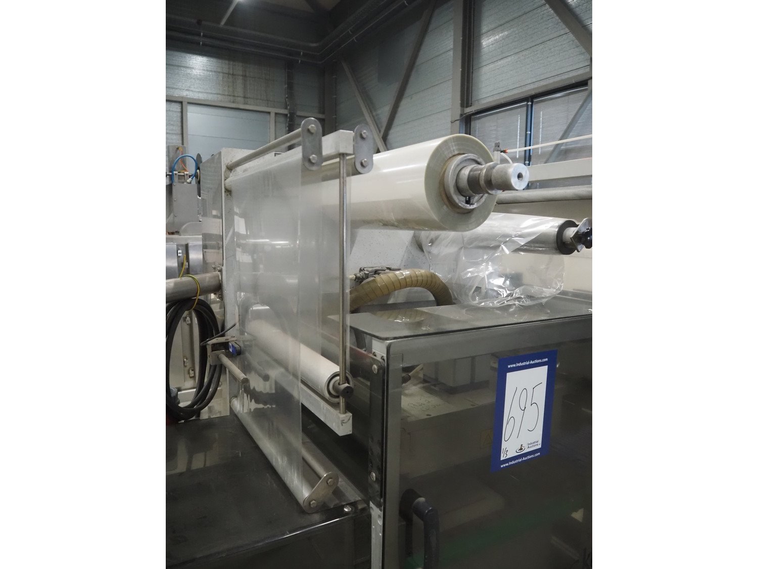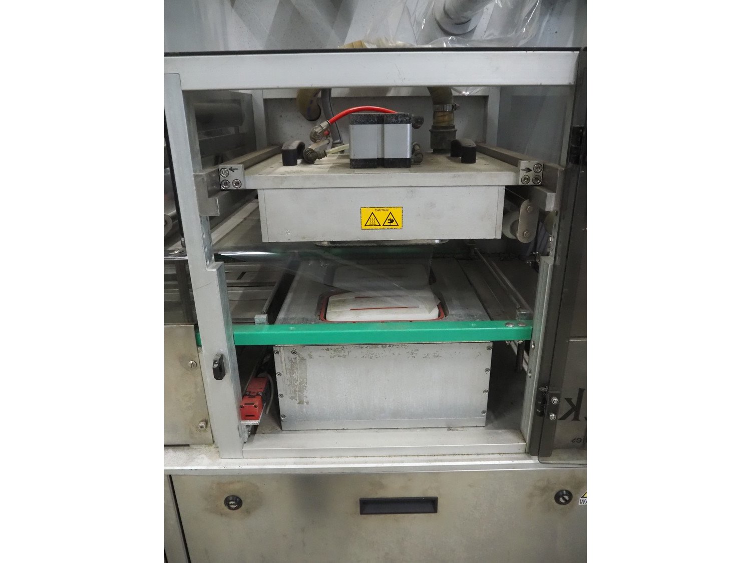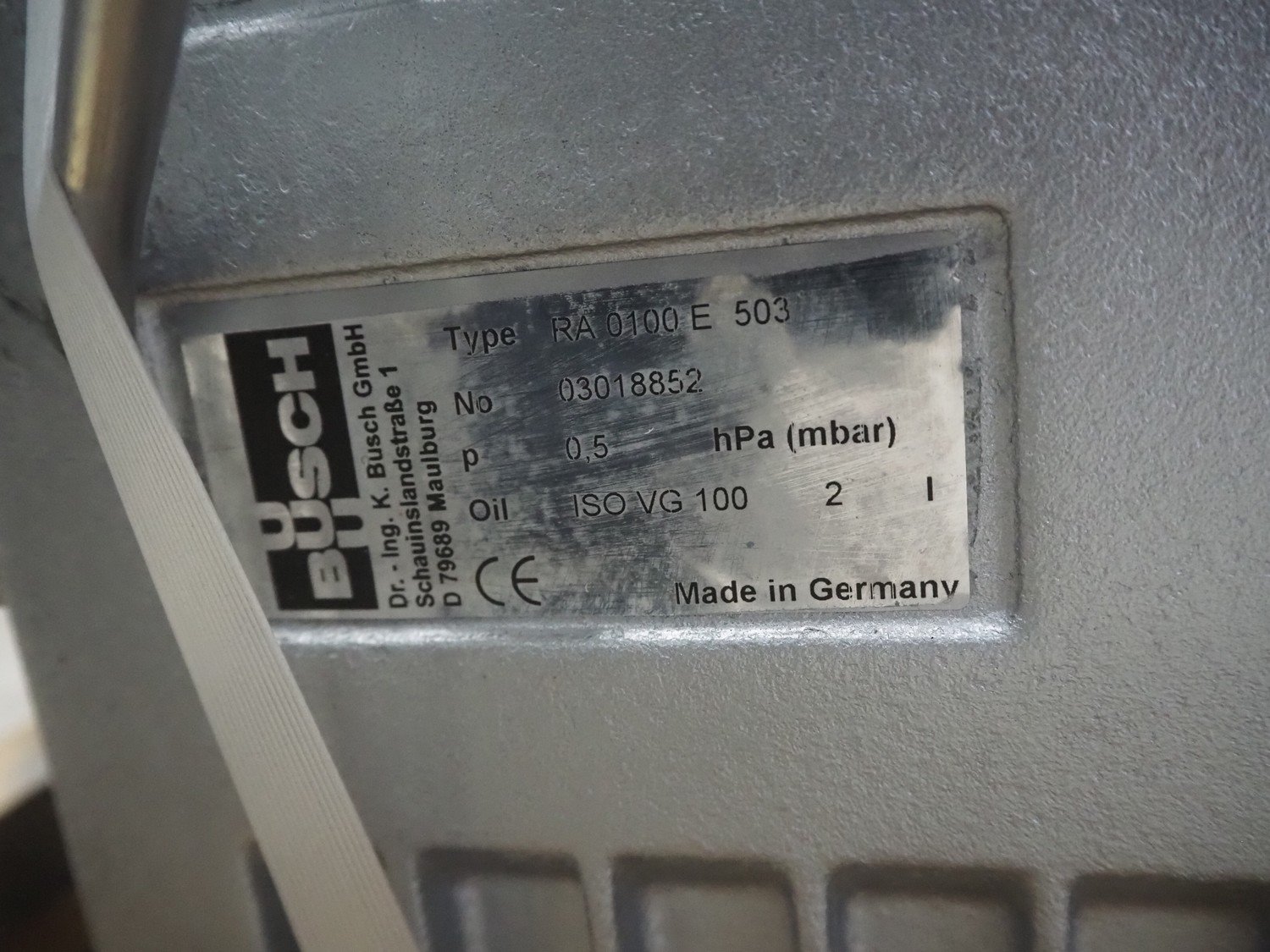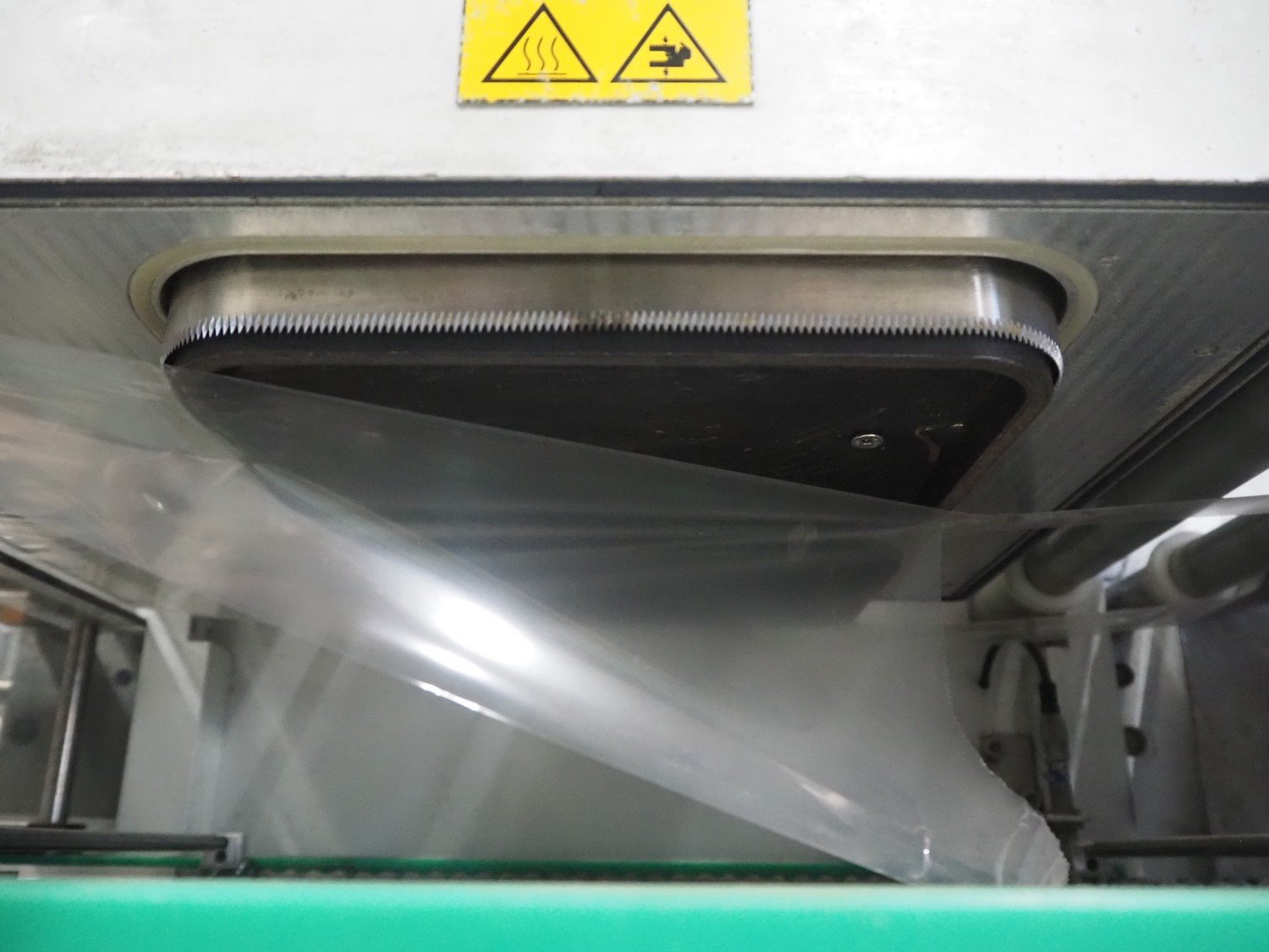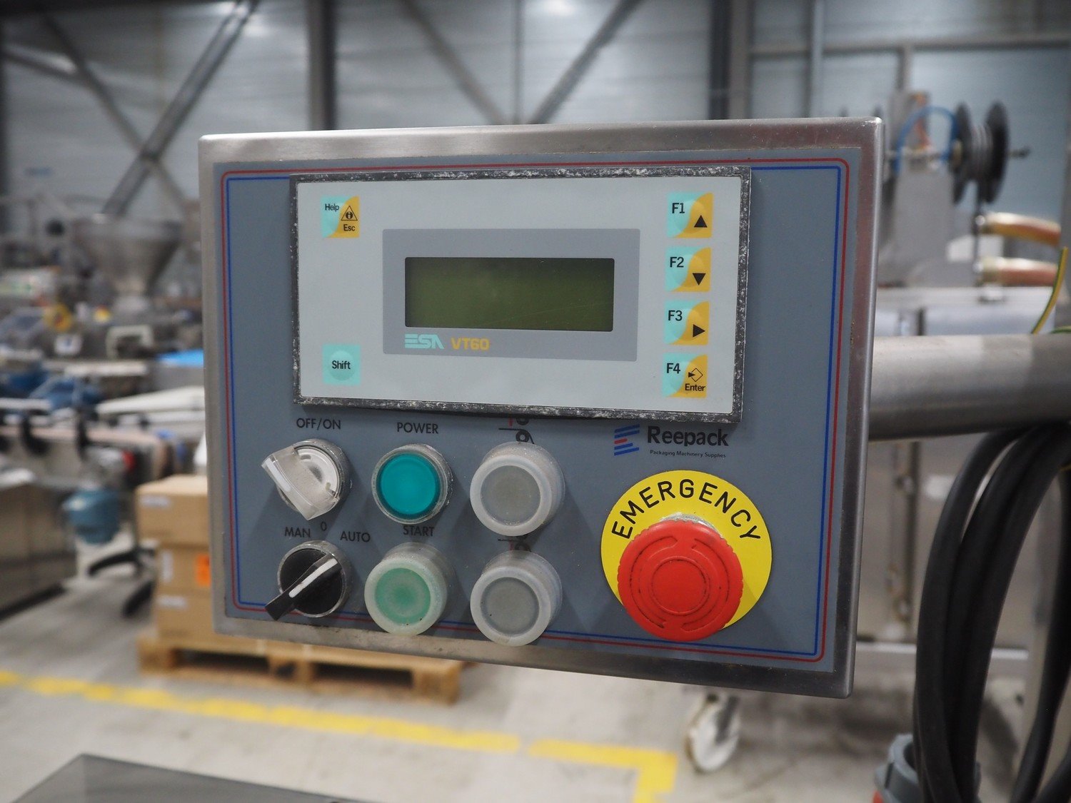 Reepack traysealer, model: Reeflex, serial number: 0402025, year of construction: 2002, 400 V, 3 Ph, 50 Hz, 21 A, s/s chain and pin conveyor, belt width: 360 mm, distance between dividers: 440 mm, divider height: 20 mm, 2 lanes, lane width: 140 mm, film width: 400 mm, dimensions dyes: (2x) 220 mm x 140 mm, plastic outfeed belt, belt width: 420 mm, total dimensions: 3550 mm x 900 mm x 1750 mm. With additional dye, dimensions dye: (2x) 220 mm x 140 mm, and Busch vacuum pump, type: RA 0100 E 503, number: 03018852, capacity: 100 m³ per hour. Kavel locatie: Looyenbeemd 11, 5652 BH Eindhoven, Nederland