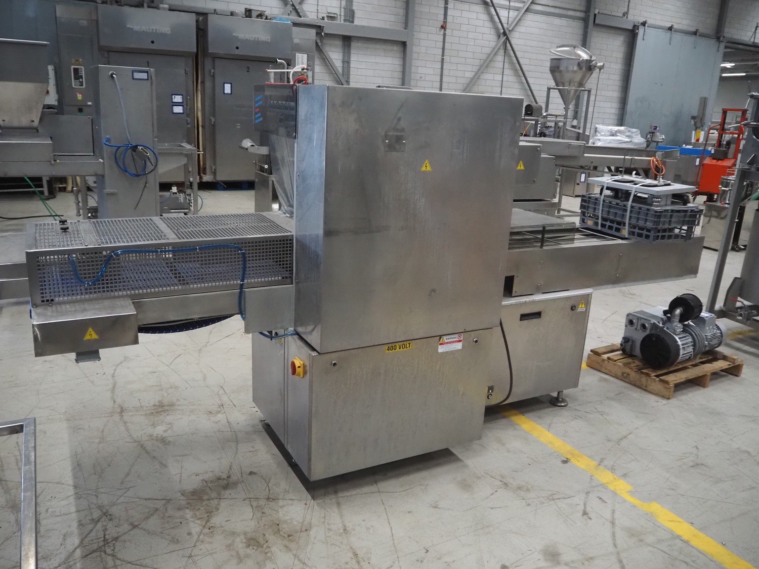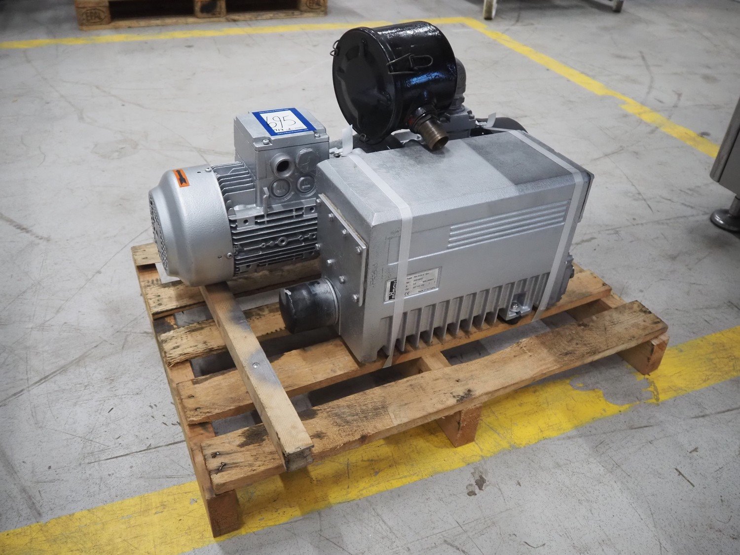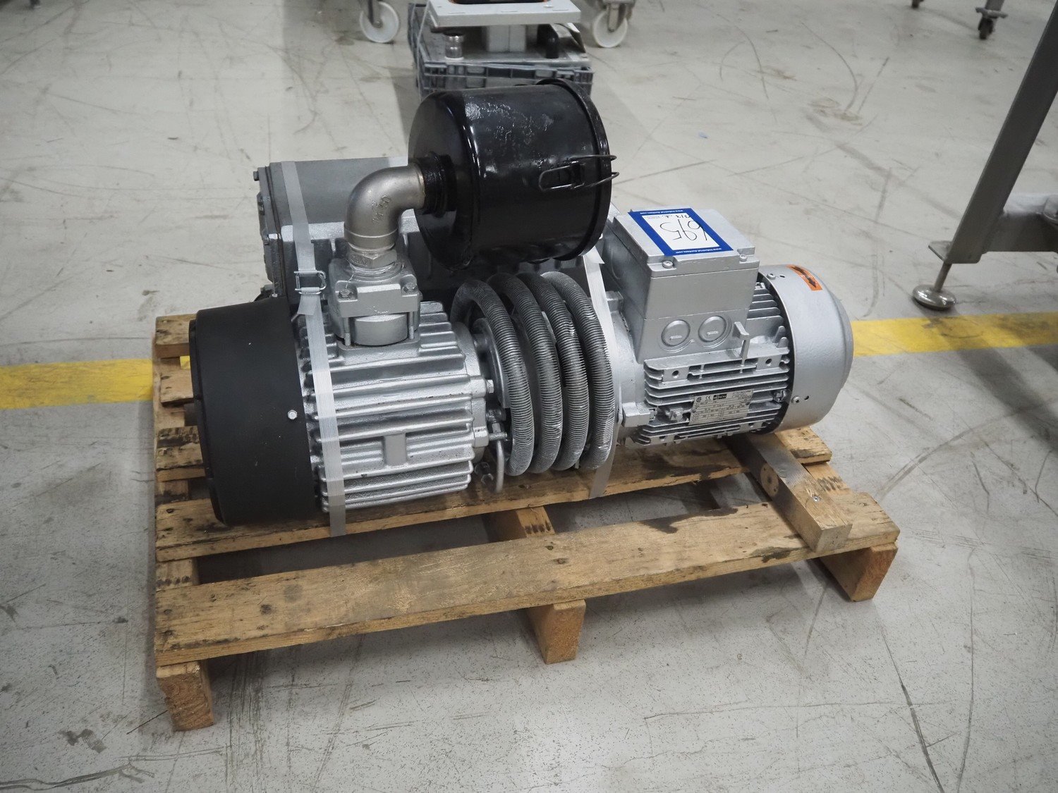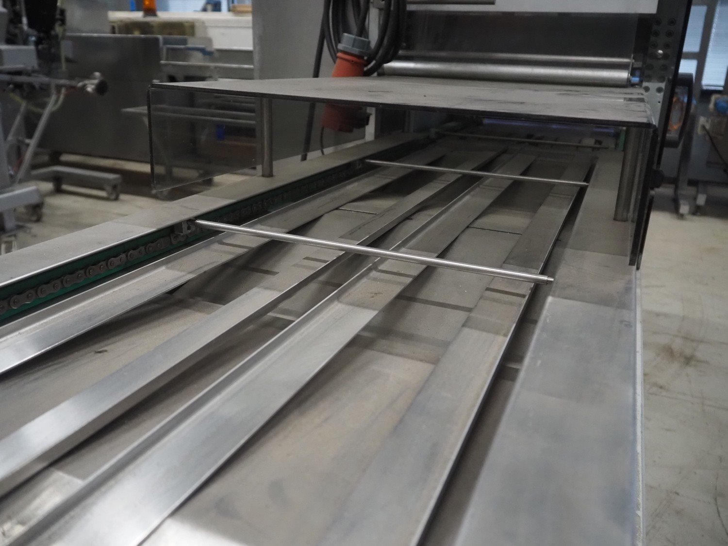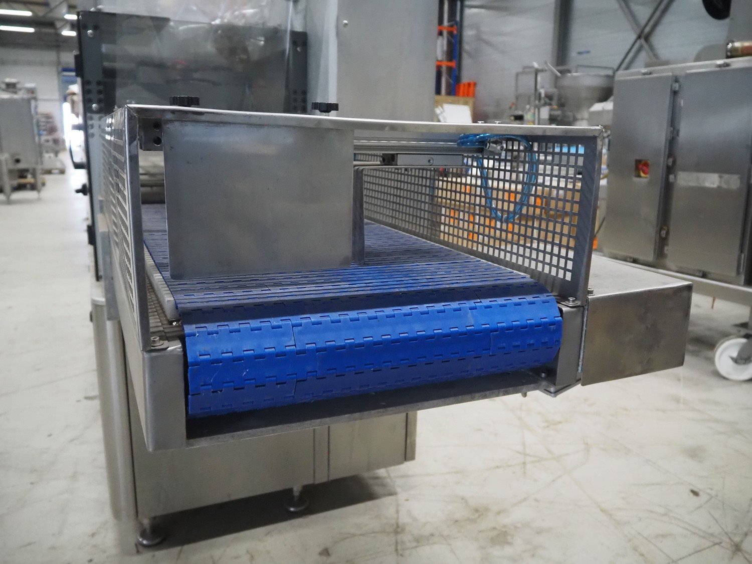 Reepack traysealer, model: Reeflex, serial number: 0402025, year of construction: 2002, 400 V, 3 Ph, 50 Hz, 21 A, s/s chain and pin conveyor, belt width: 360 mm, distance between dividers: 440 mm, divider height: 20 mm, 2 lanes, lane width: 140 mm, film width: 400 mm, dimensions dyes: (2x) 220 mm x 140 mm, plastic outfeed belt, belt width: 420 mm, total dimensions: 3550 mm x 900 mm x 1750 mm. With additional dye, dimensions dye: (2x) 220 mm x 140 mm, and Busch vacuum pump, type: RA 0100 E 503, number: 03018852, capacity: 100 m³ per hour. Kavel locatie: Looyenbeemd 11, 5652 BH Eindhoven, Nederland