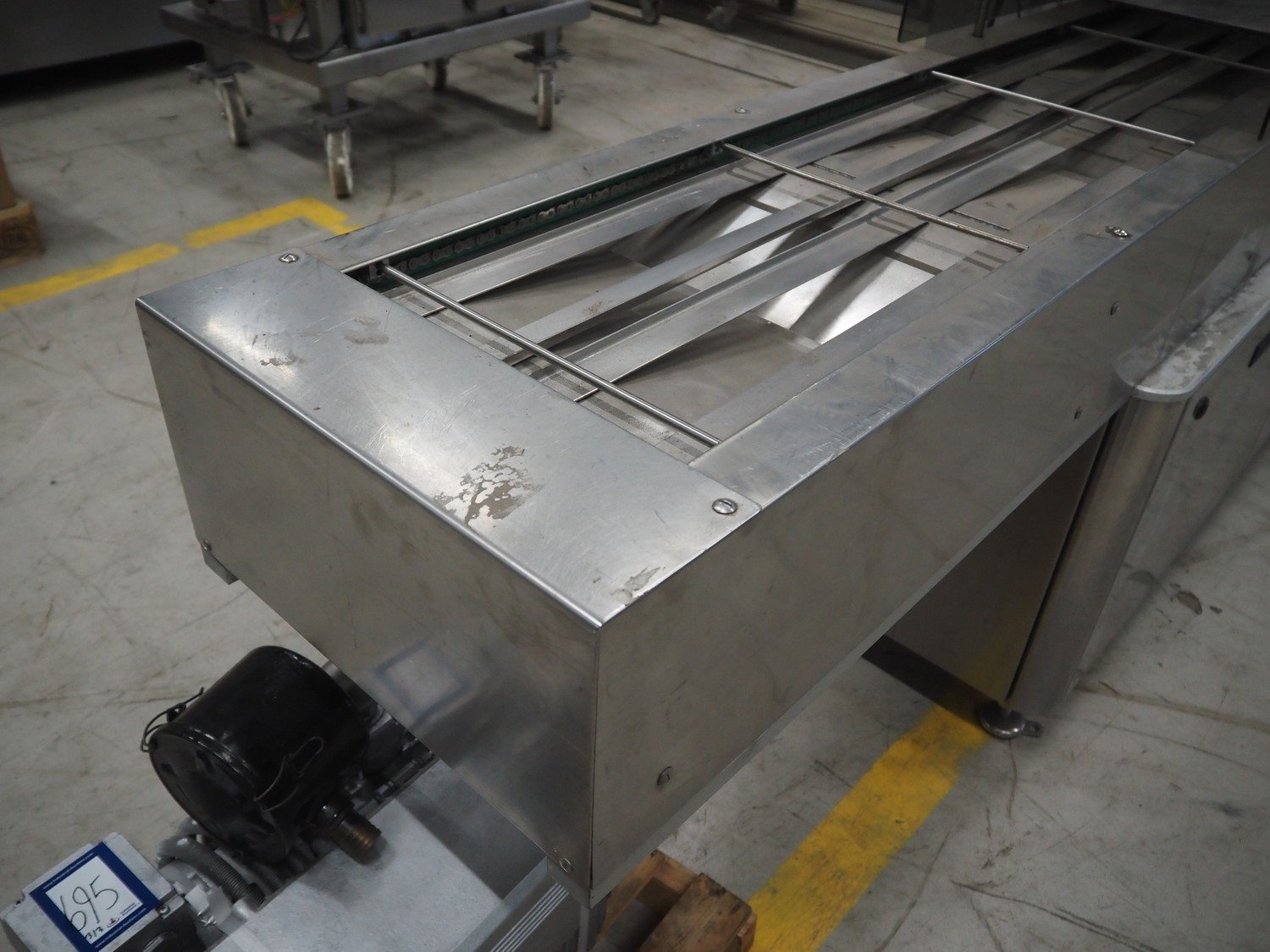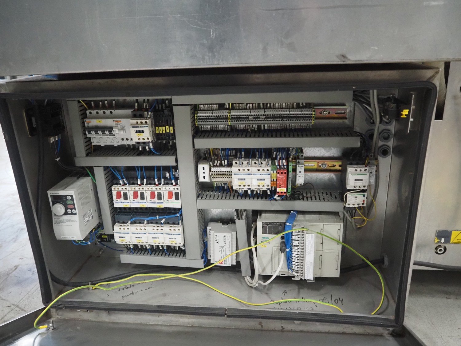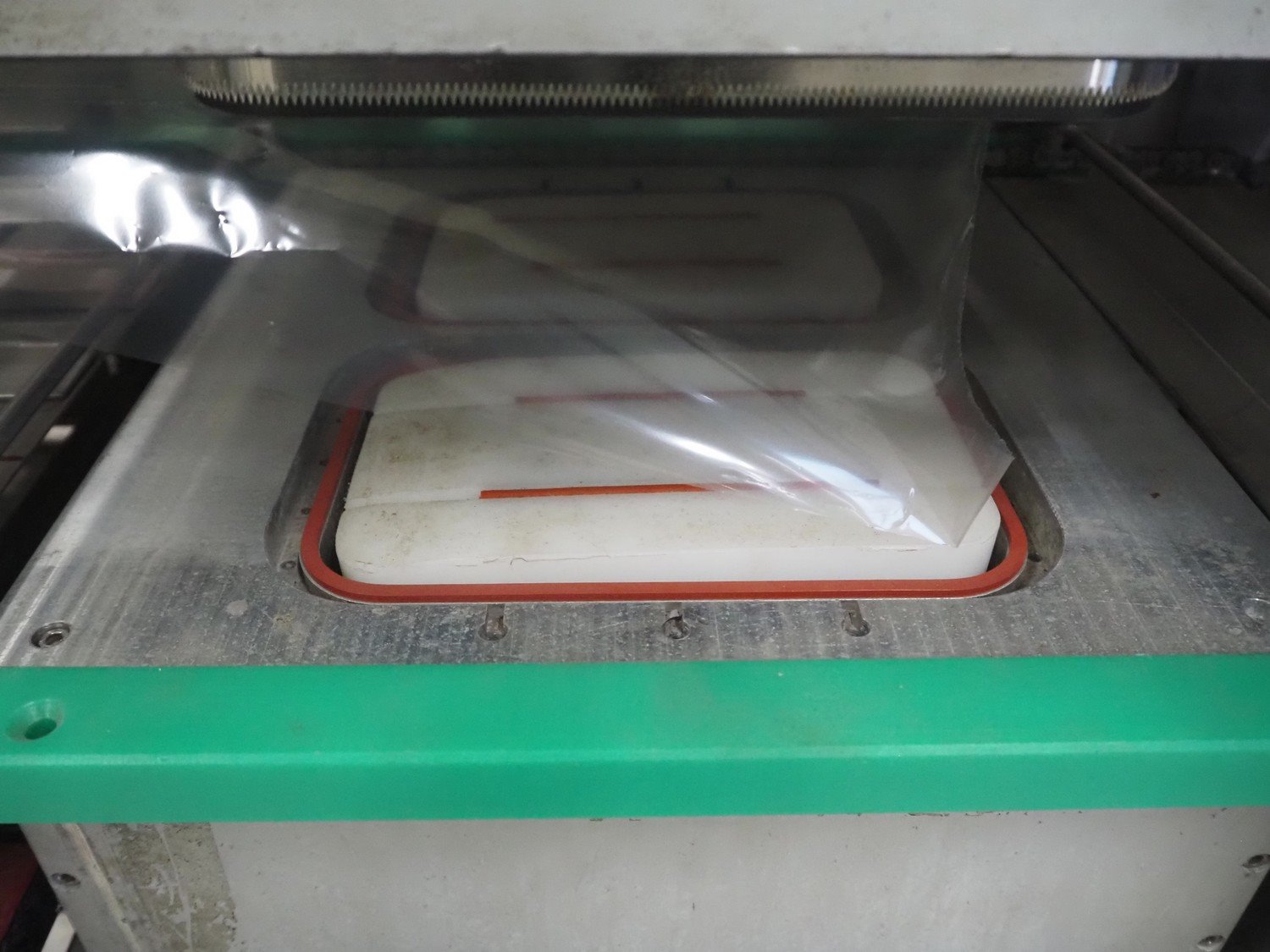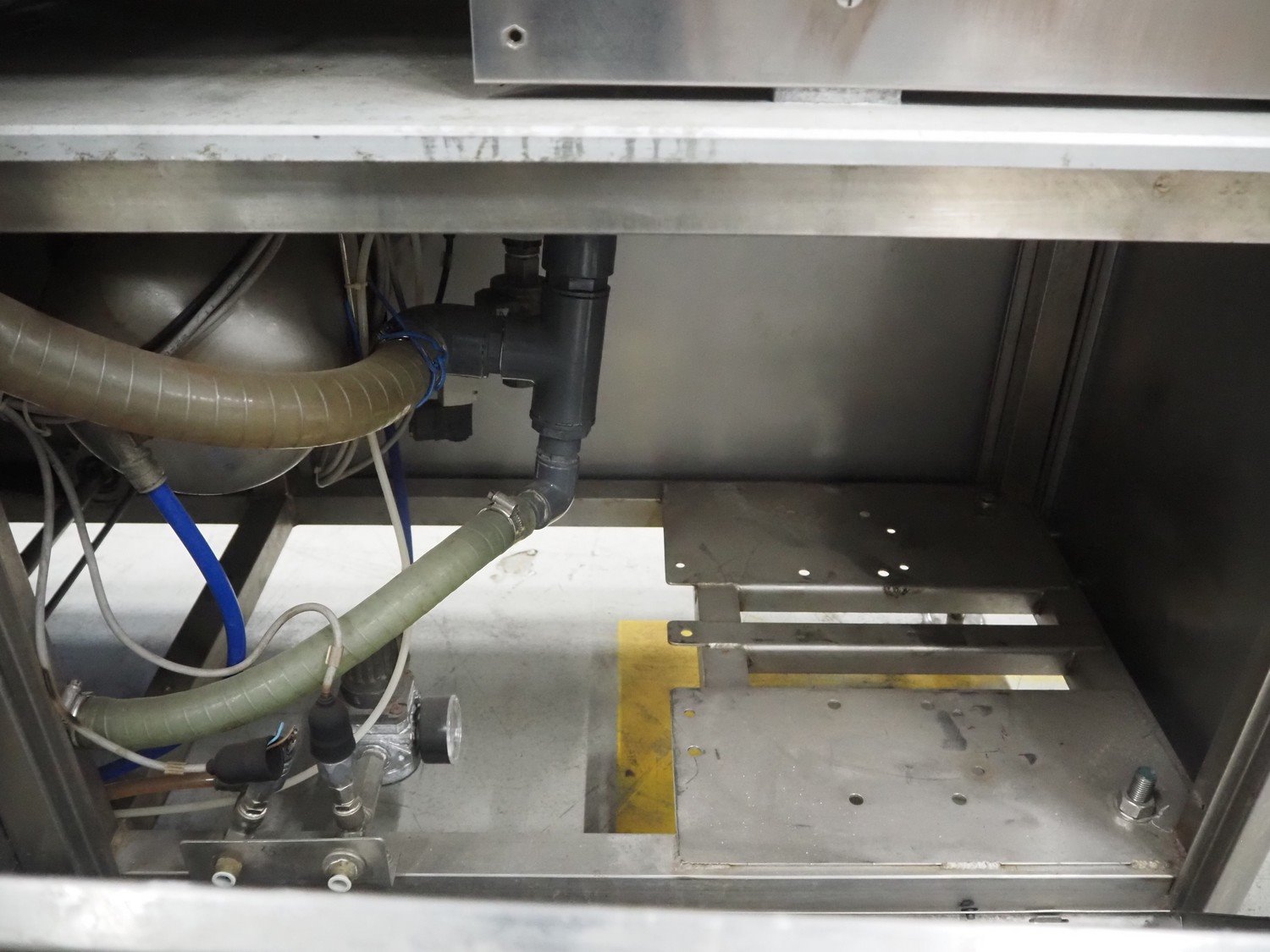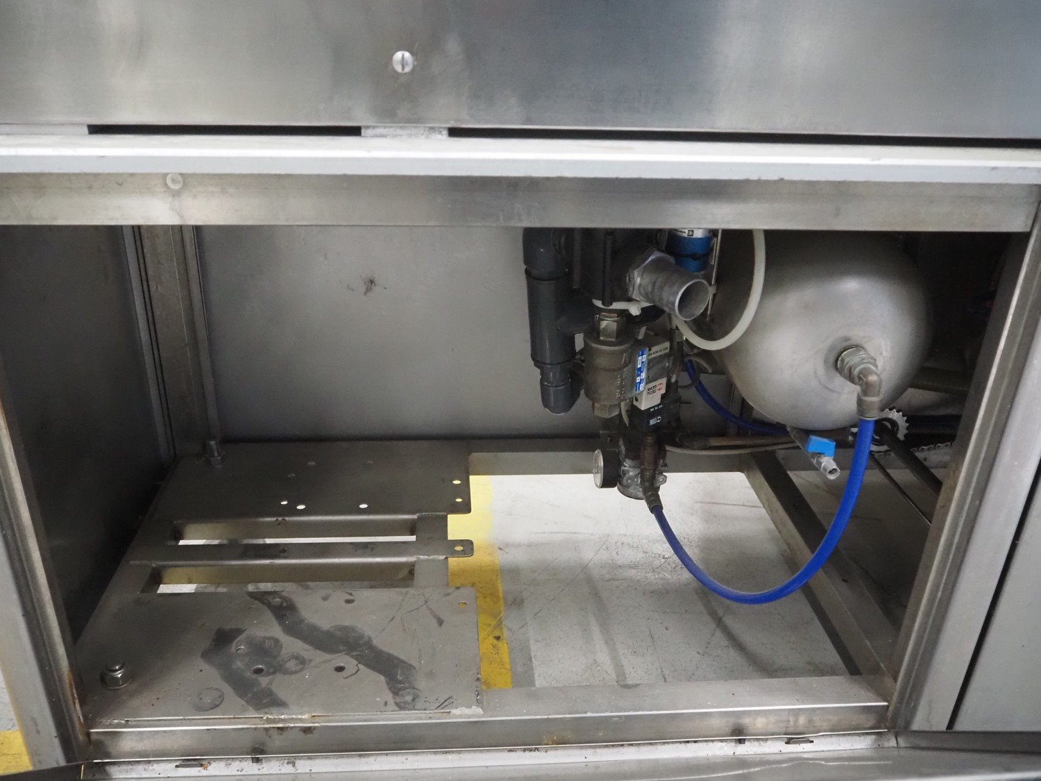 Reepack traysealer, model: Reeflex, serial number: 0402025, year of construction: 2002, 400 V, 3 Ph, 50 Hz, 21 A, s/s chain and pin conveyor, belt width: 360 mm, distance between dividers: 440 mm, divider height: 20 mm, 2 lanes, lane width: 140 mm, film width: 400 mm, dimensions dyes: (2x) 220 mm x 140 mm, plastic outfeed belt, belt width: 420 mm, total dimensions: 3550 mm x 900 mm x 1750 mm. With additional dye, dimensions dye: (2x) 220 mm x 140 mm, and Busch vacuum pump, type: RA 0100 E 503, number: 03018852, capacity: 100 m³ per hour. Kavel locatie: Looyenbeemd 11, 5652 BH Eindhoven, Nederland