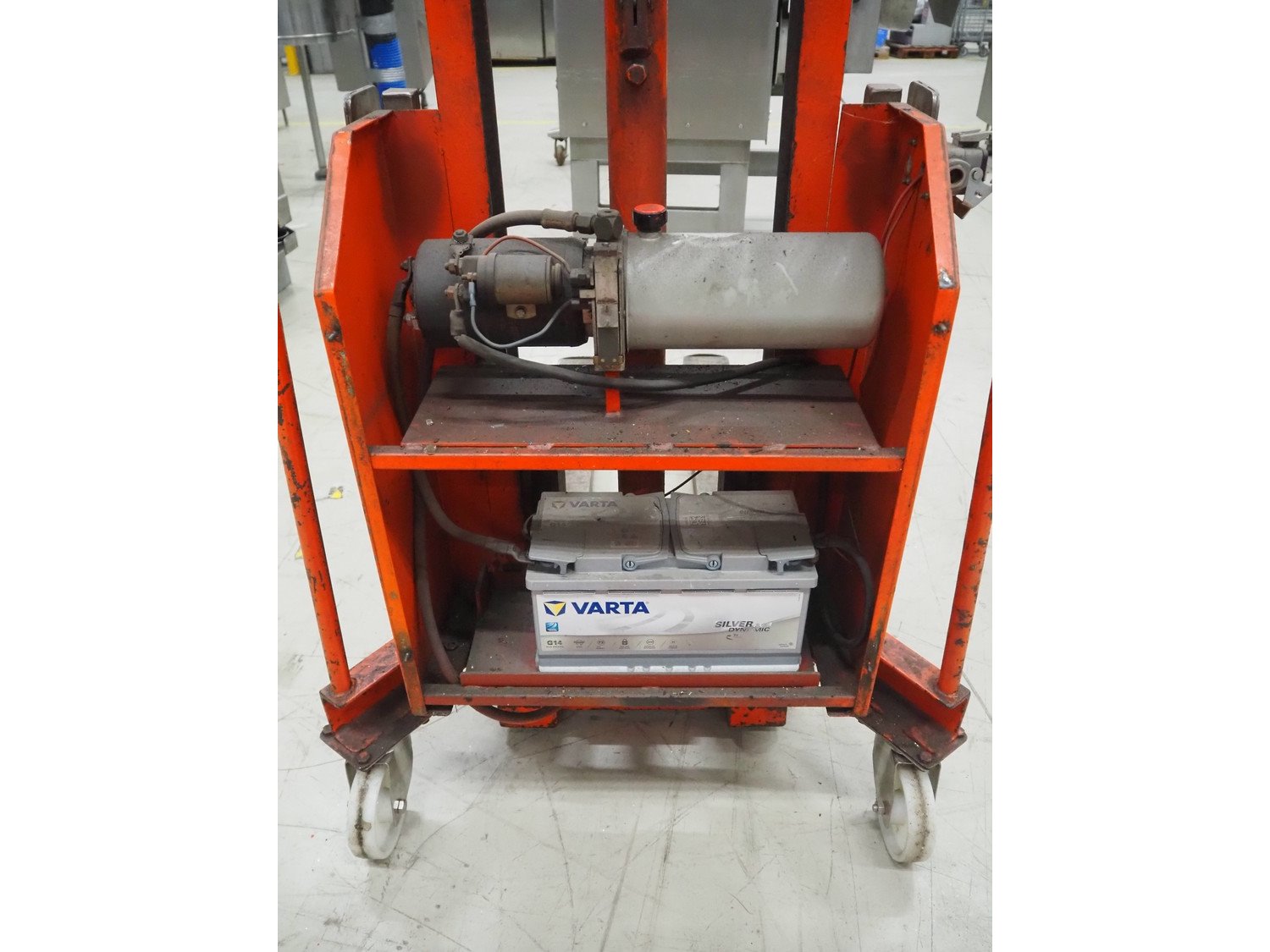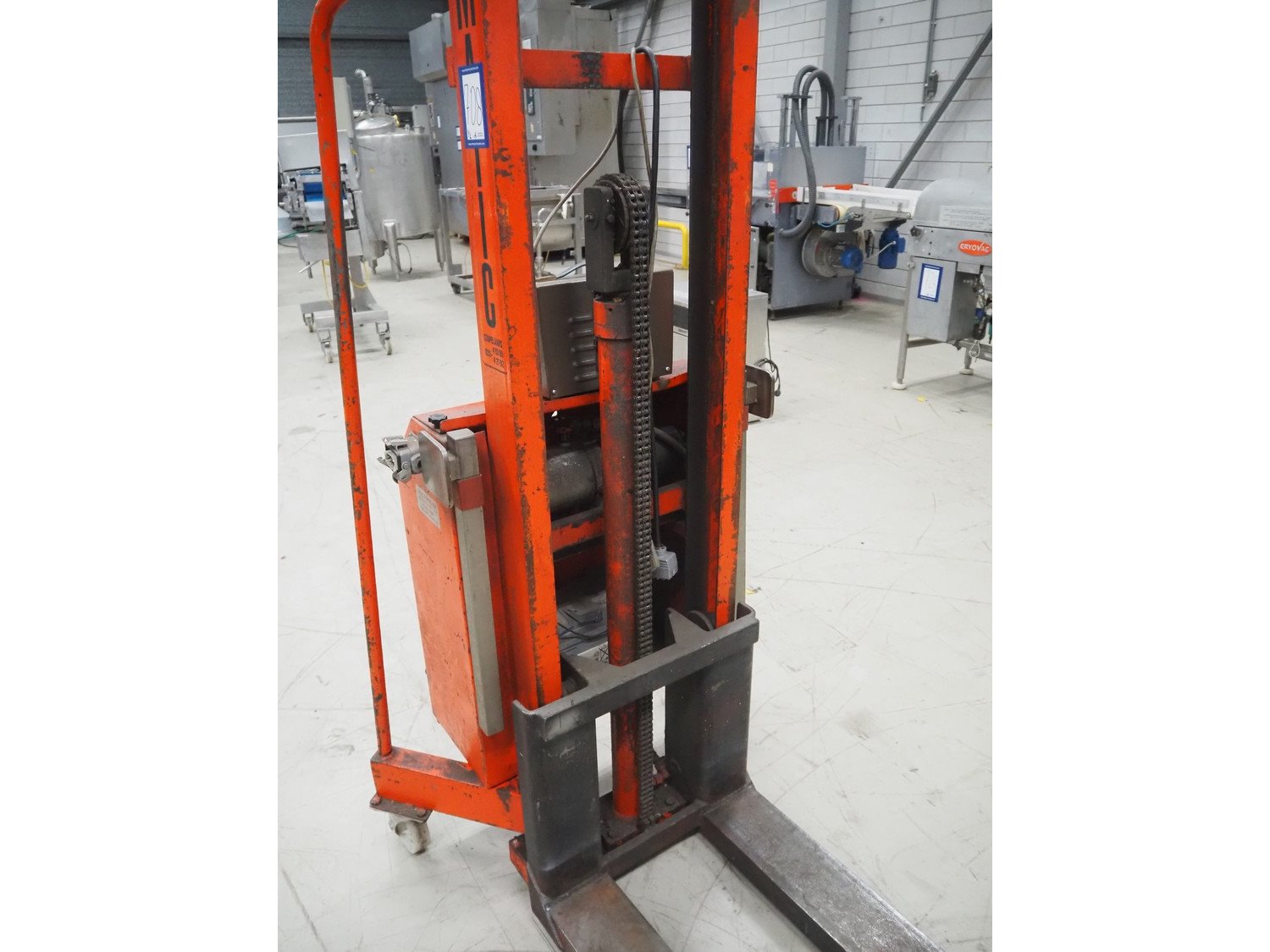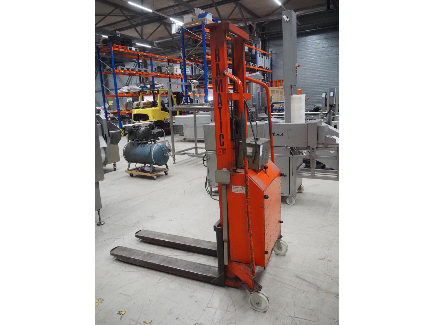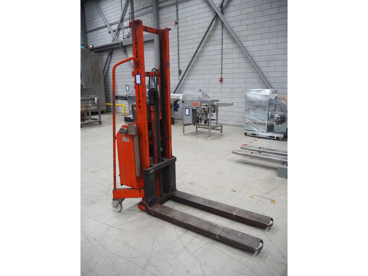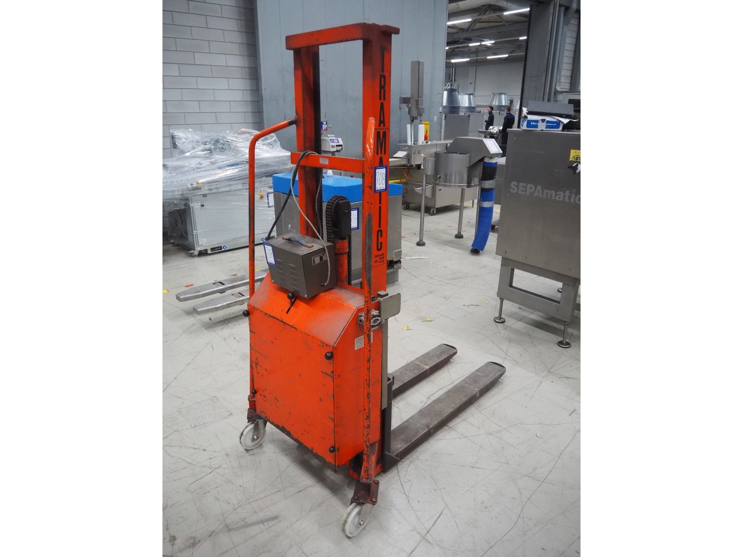 Tramatic electric pallet lifter, fork length: 1200 mm, lifting height: 1400 mm, total dimensions: 1650 mm x 900 mm x 2000 mm. Including De Drie B.V. battery charger, 220 V, 12 DC and VARTA battery. Kavel locatie: Looyenbeemd 11, 5652 BH Eindhoven, Nederland