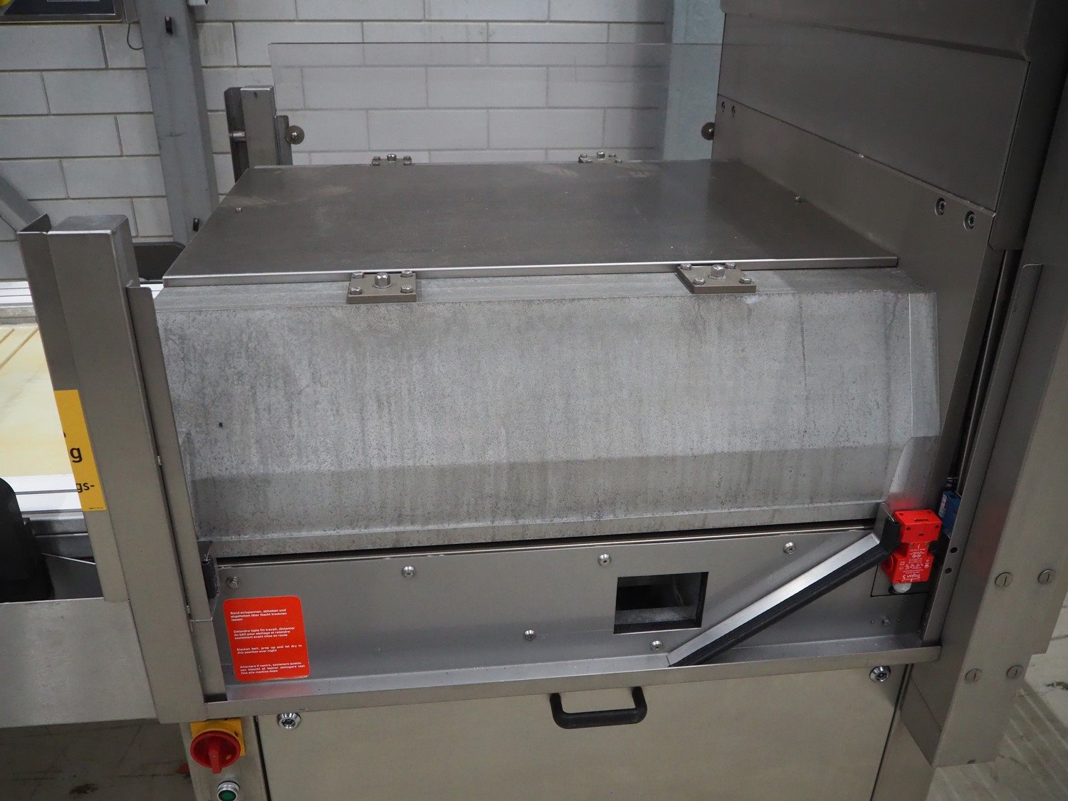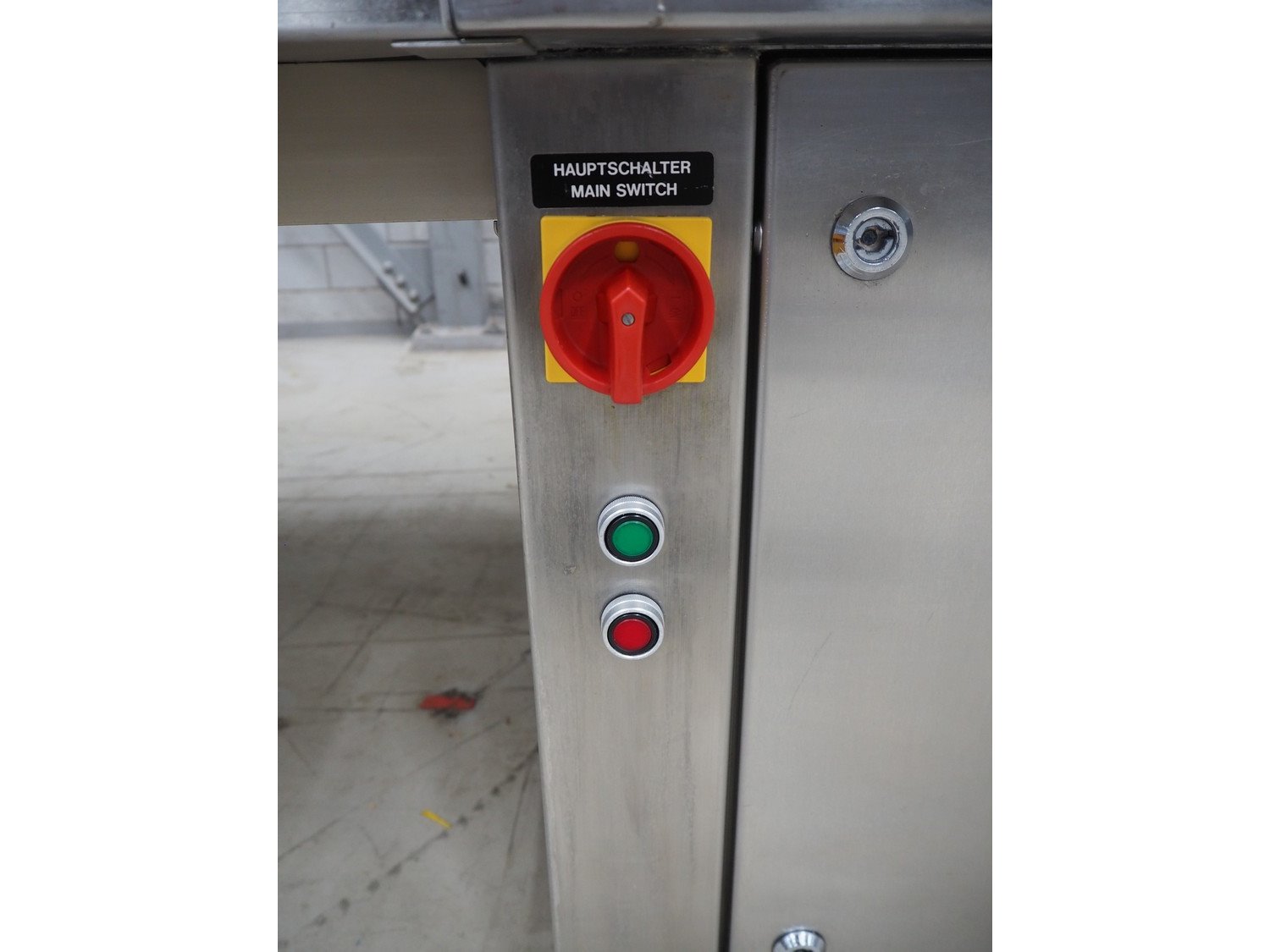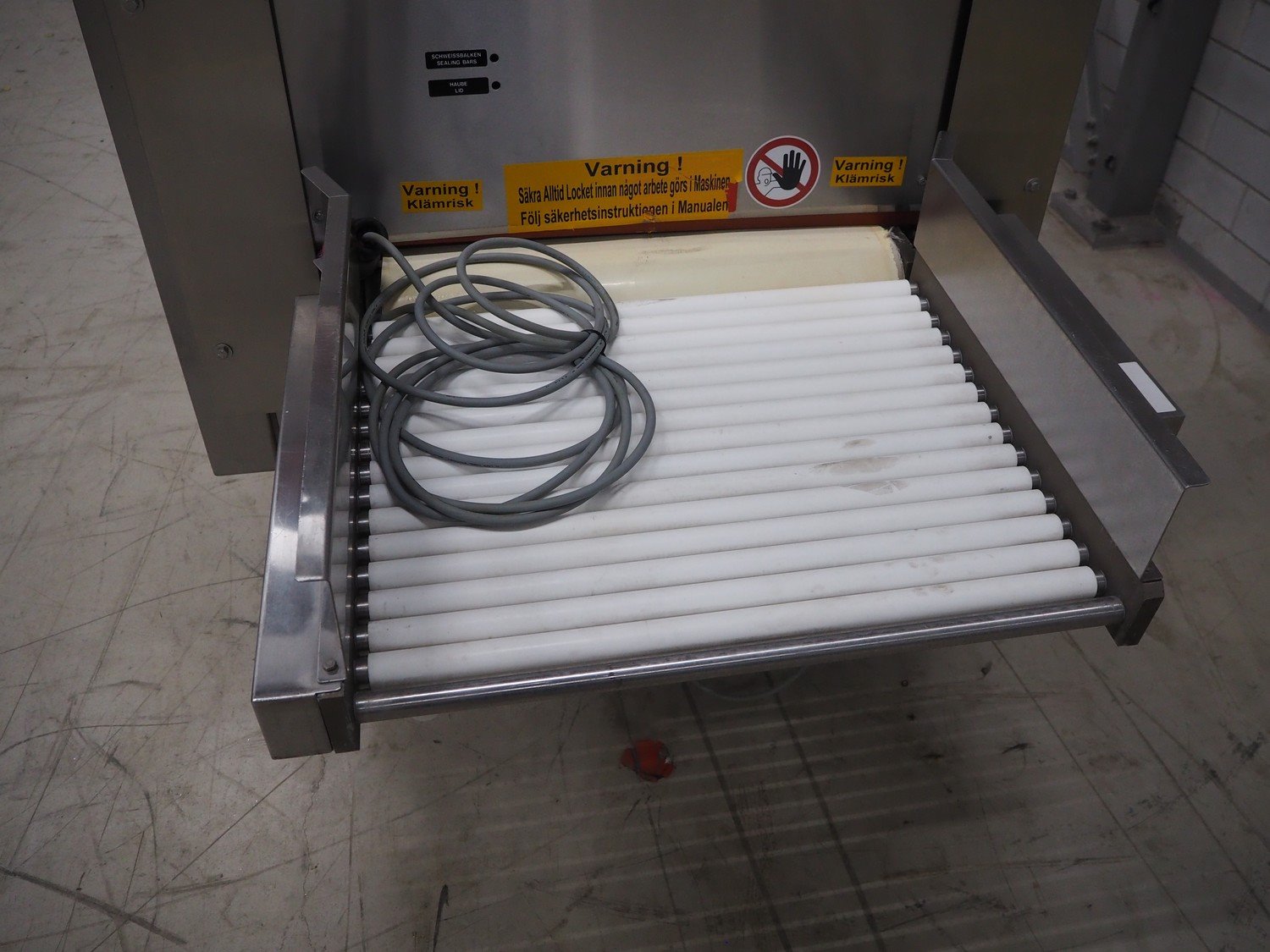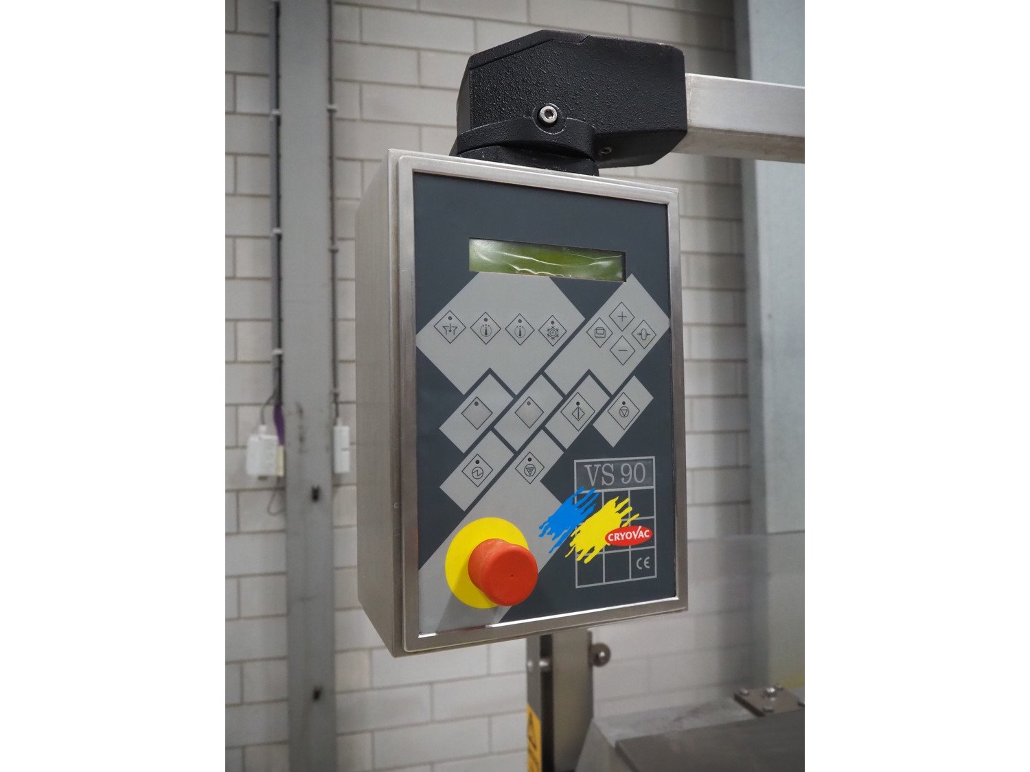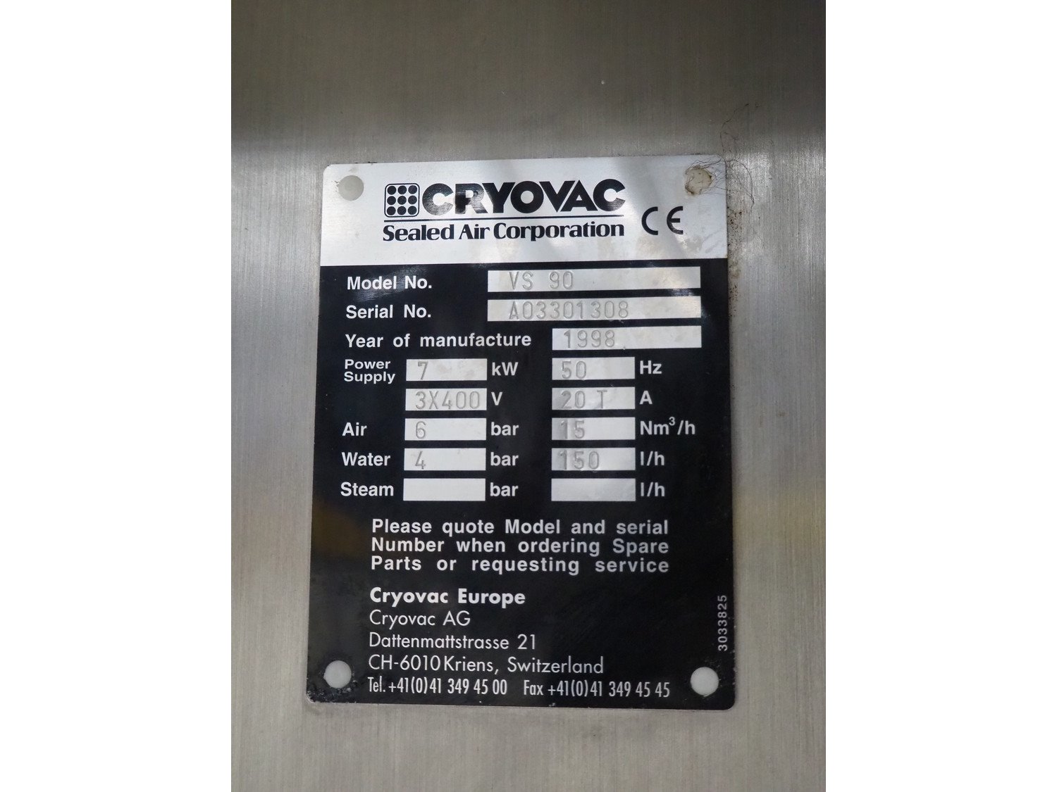 Cryovac belt vacuum machine, model: VS 90, serial number: A03301308, year of construction: 1998, 400 V, 3 Ph, 50 Hz, 20 A, 7 kW, 6/4 bar, plastic belt, belt width: 660 mm, plastic rollers, roller width: 660 mm, total dimensions: 3200 mm x 1300 mm x 1940 mm. Without vacuum pump. Kavel locatie: Looyenbeemd 11, 5652 BH Eindhoven, Nederland