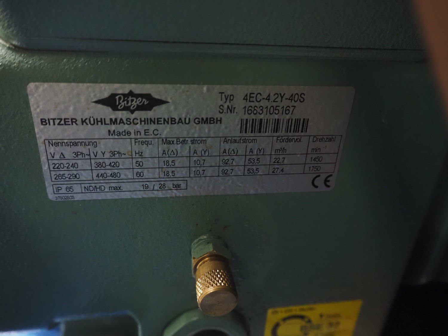 Carrier compressor rack with 5 Bitzer Kühlmaschinenbau GmbH cooling compressors, type compressor rack, type: MAXI VPP330-4870+SPM235-4660, serial number: 159713/135/15254, year of construction: 01/2013, 400 V, 3 Ph, 50 Hz, refrigerant: R507, Bitzer Kühlmaschinenbau GmbH compressor type: (3x) 4NCS-12.2Y-40P, capacity: 56.2/67.9 m³ per hour, (2x) 4EC-4.2Y-40S, capacity: 22.7/27.4 m³ per hour, dimensions: 3700 mm x 1600 mm x 2300 mm. Kavel locatie: Looyenbeemd 11, 5652 BH Eindhoven, Nederland