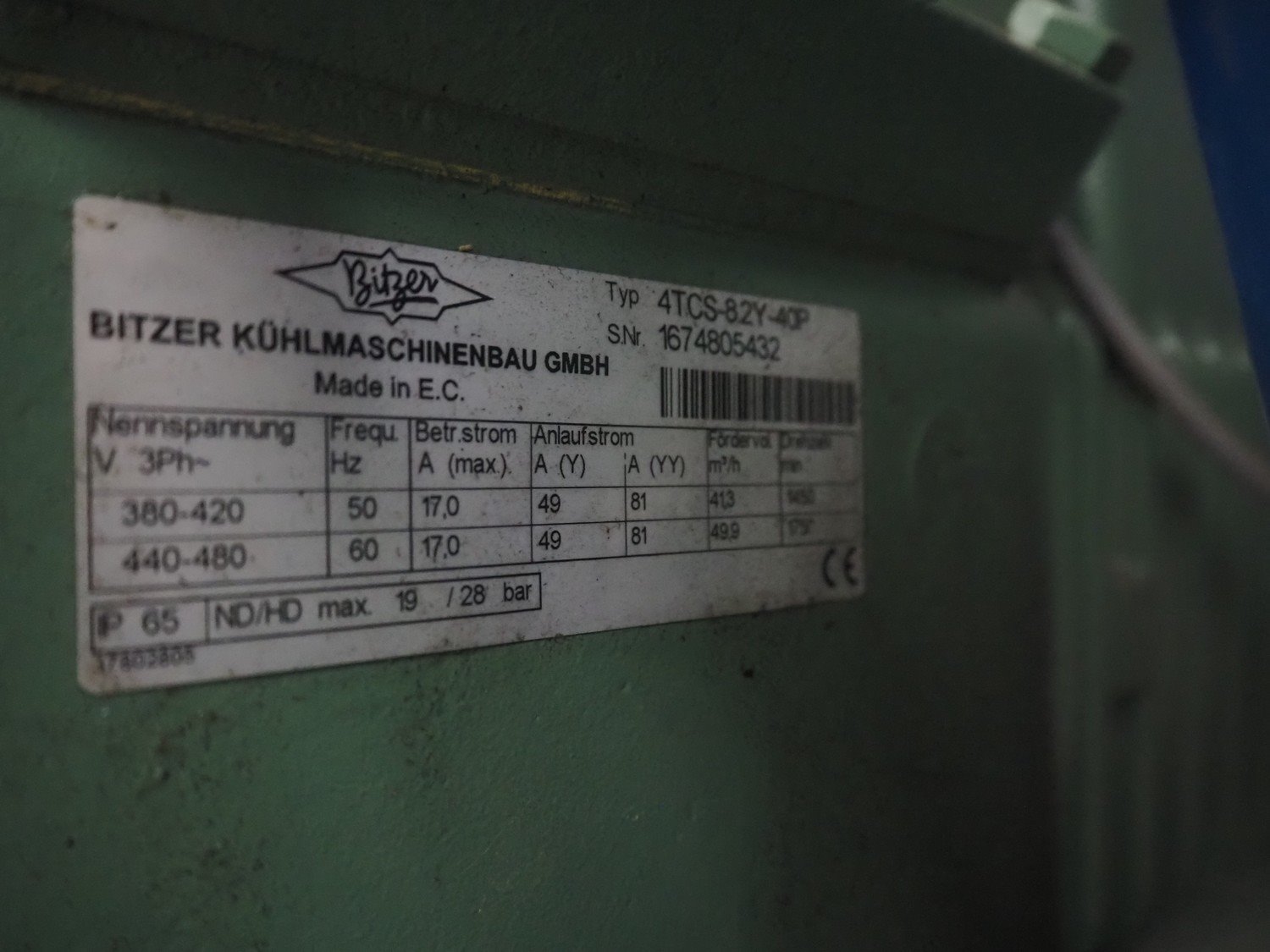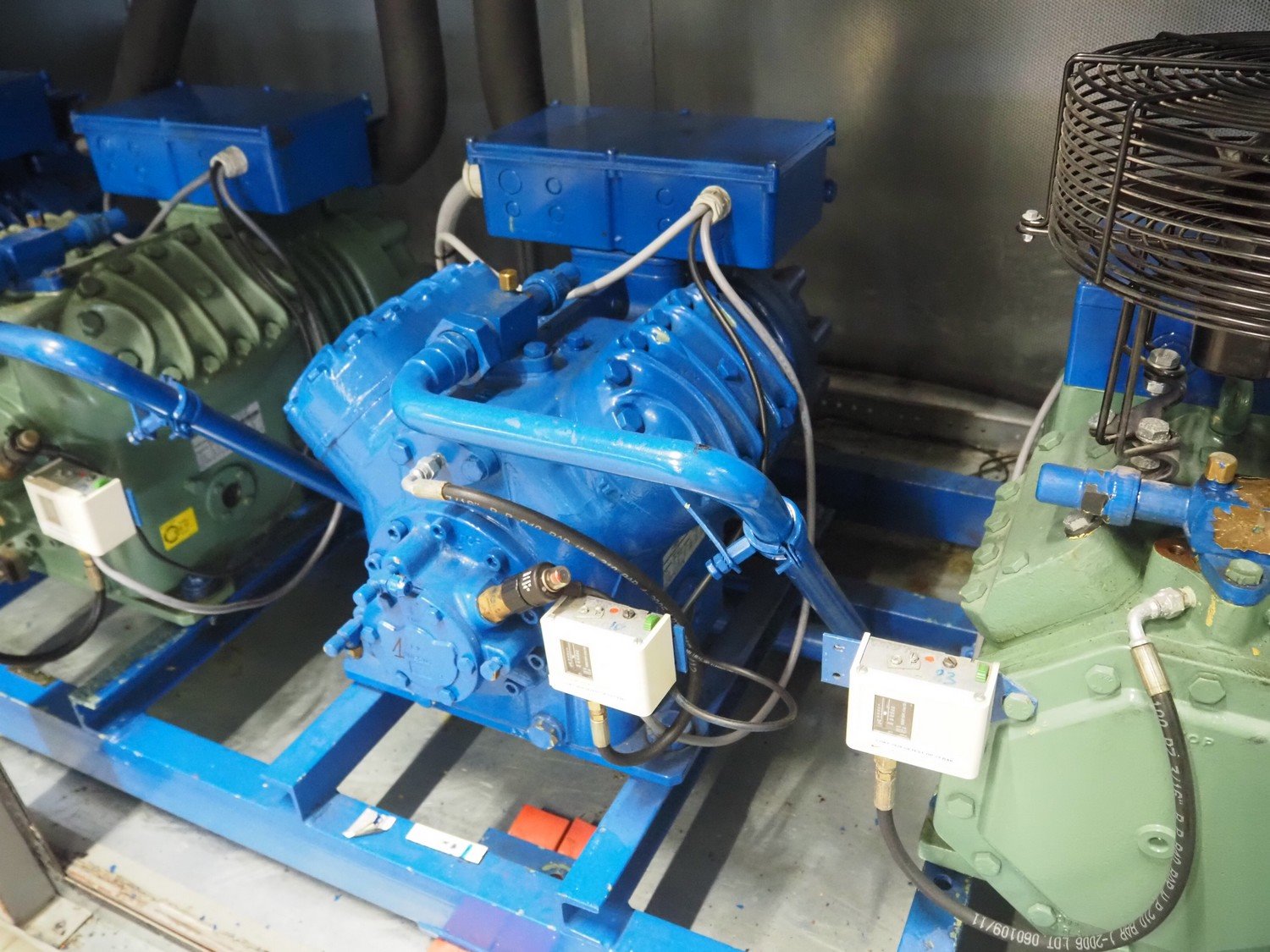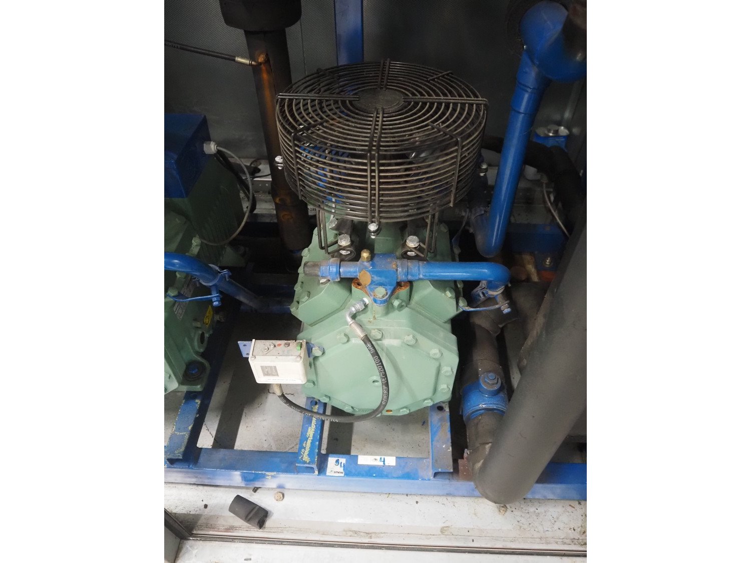 Carrier compressor rack with 5 Bitzer Kühlmaschinenbau GmbH cooling compressors, type cooling compressors: (2x) 4J-13.2Y-40P, capacity: 63.5/76.7 m³ per hour, (1x) 4J-22.2-40P, capacity: 63.5/76.7, (1x) 4TCS-8.2Y-40P, capacity: 41.3/49.9 m³ per hour, (1x) 4TCS-12.2-40P, capacity: 41.3/49.9 m³ per hour, dimensions: 3750 mm x 1600 mm x 2350 mm. Kavel locatie: Looyenbeemd 11, 5652 BH Eindhoven, Nederland