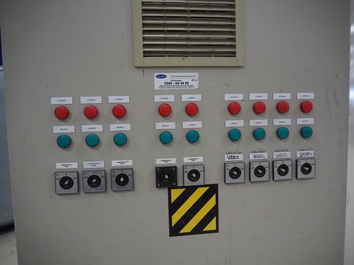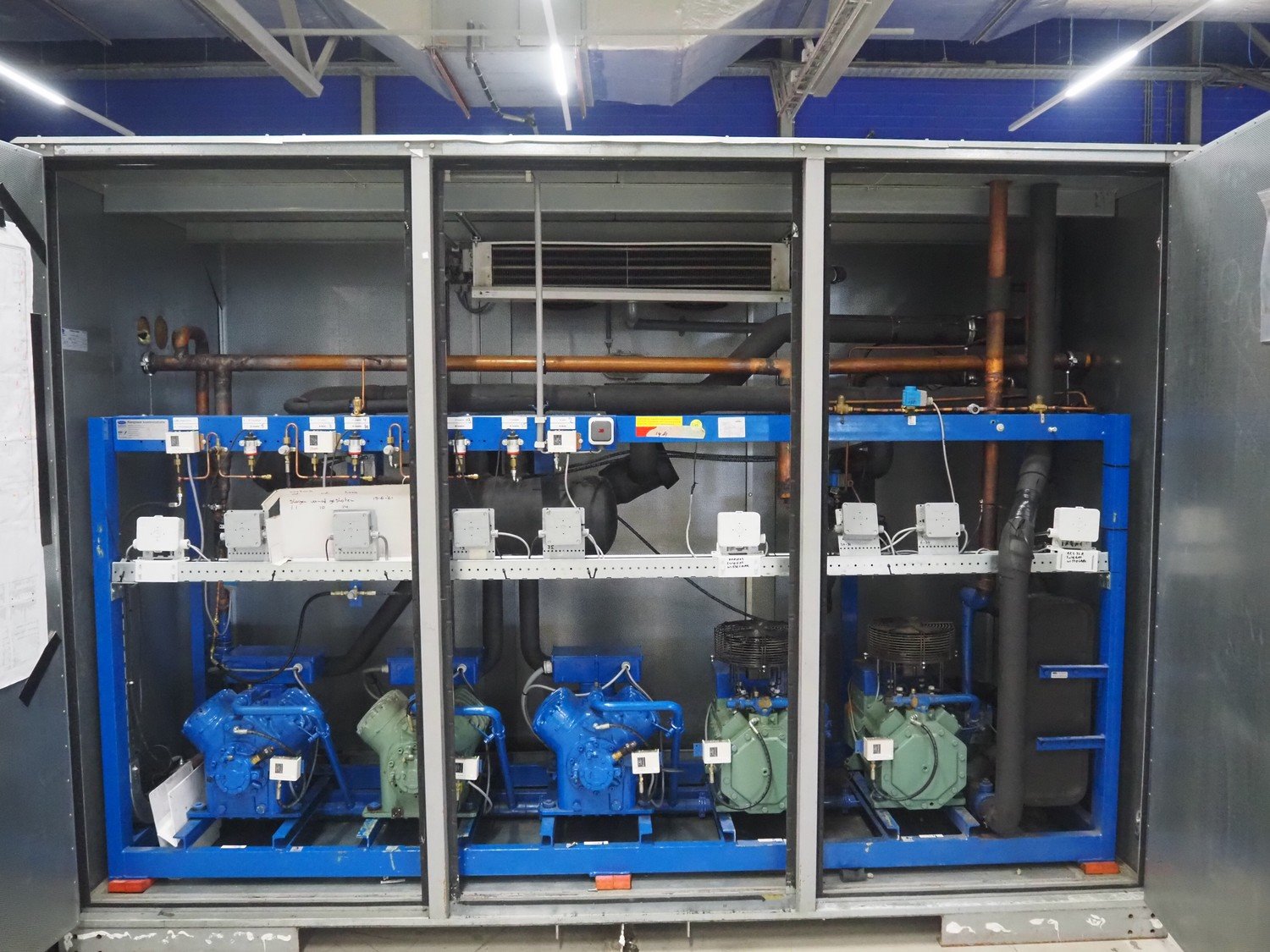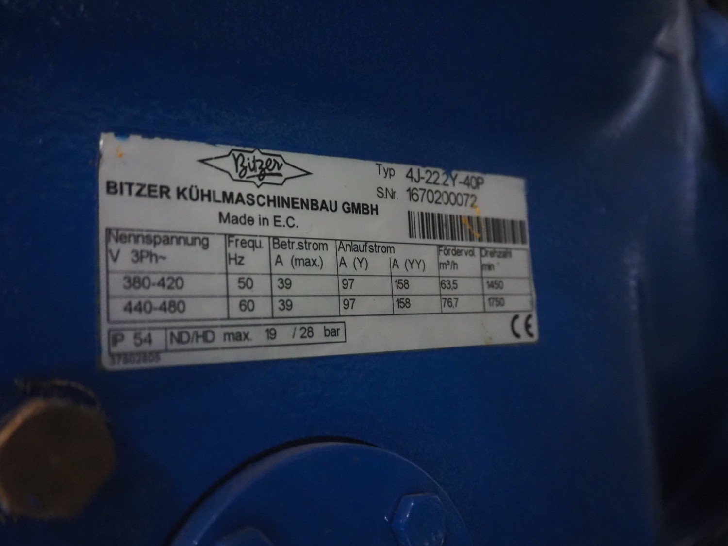 Carrier compressor rack with 5 Bitzer Kühlmaschinenbau GmbH cooling compressors, type cooling compressors: (2x) 4J-13.2Y-40P, capacity: 63.5/76.7 m³ per hour, (1x) 4J-22.2-40P, capacity: 63.5/76.7, (1x) 4TCS-8.2Y-40P, capacity: 41.3/49.9 m³ per hour, (1x) 4TCS-12.2-40P, capacity: 41.3/49.9 m³ per hour, dimensions: 3750 mm x 1600 mm x 2350 mm. Kavel locatie: Looyenbeemd 11, 5652 BH Eindhoven, Nederland