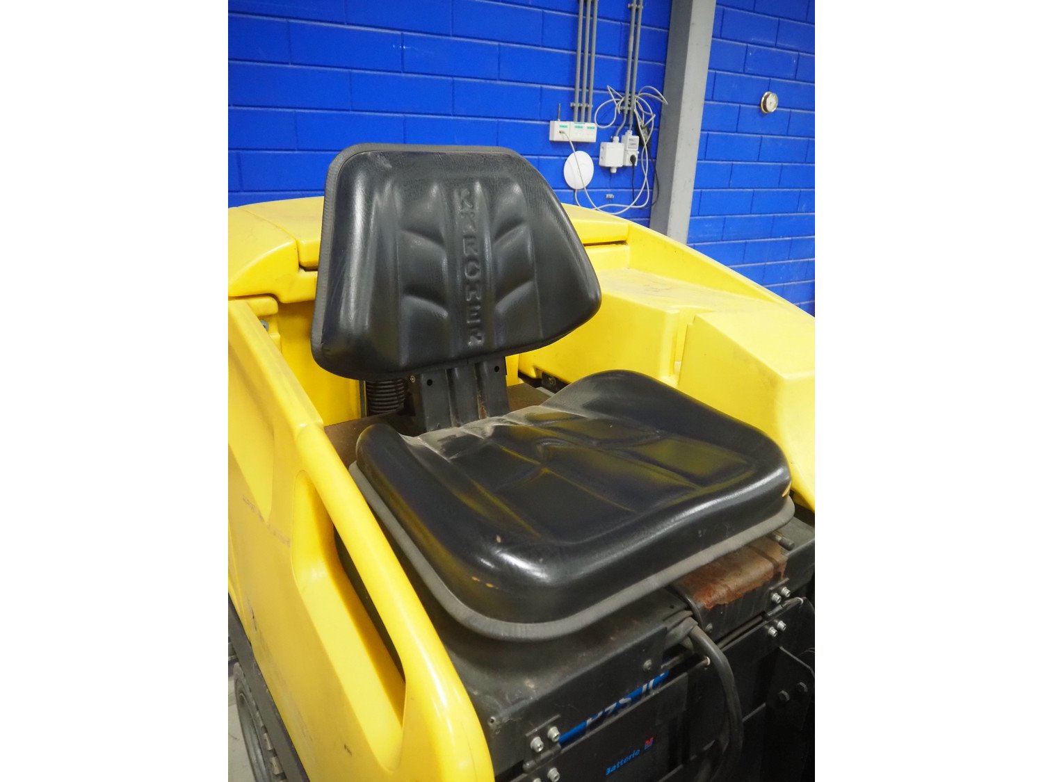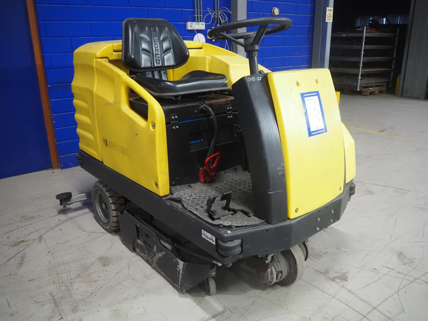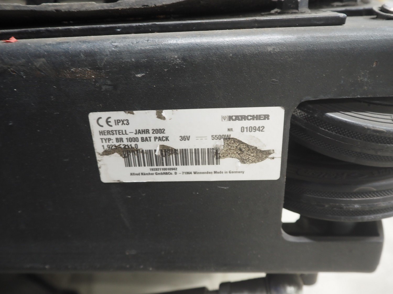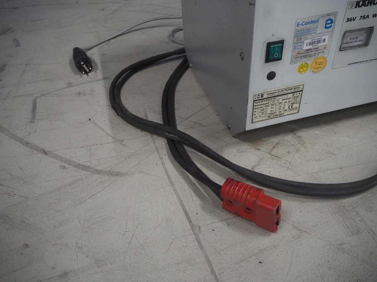 Kärcher floor scrubbing machine, model: BR 1000 bat pack, number: 010942, year of construction: 2002, 36 V, 5500 W, dimensions: 2000 mm x 1380 mm x 1450 mm. Including battery charger, type: E 230 G 36/75 B1-FM, 230 V, 1 Ph, 50/60 Hz, 15/75 A, dimensions: 500 mm x 380 mm x 360 mm. Kavel locatie: Looyenbeemd 11, 5652 BH Eindhoven, Nederland