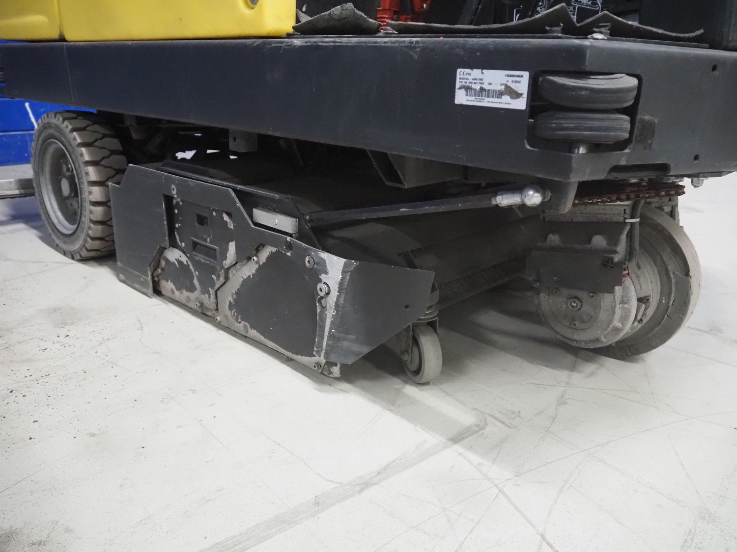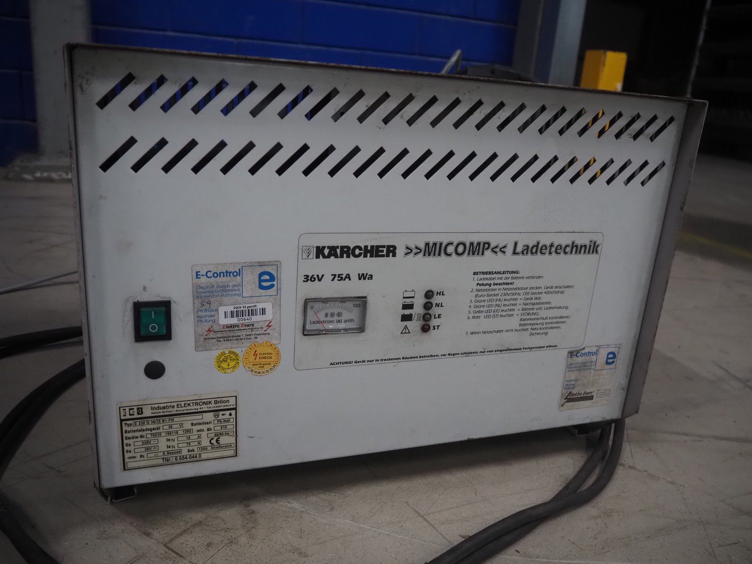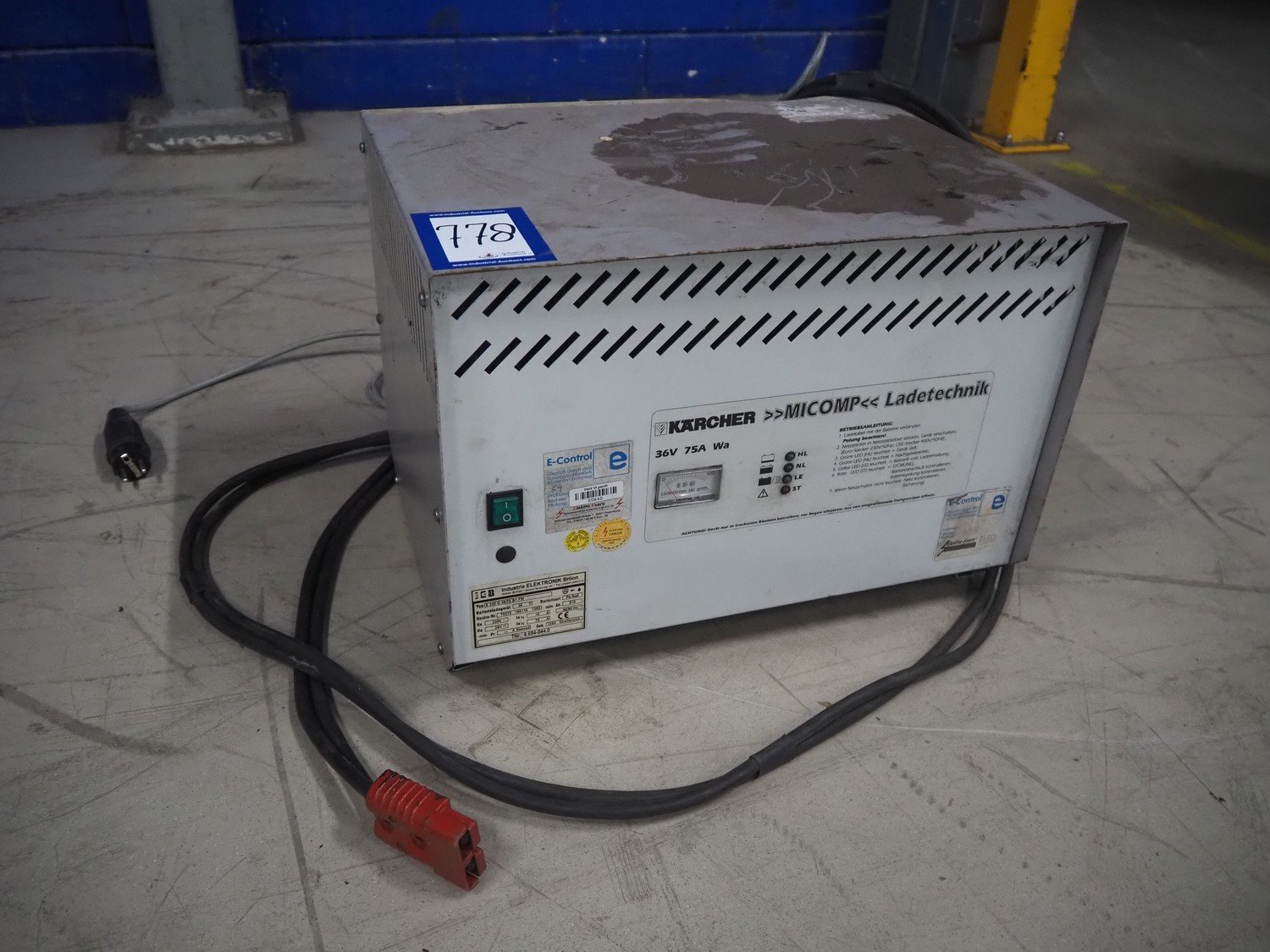 Kärcher floor scrubbing machine, model: BR 1000 bat pack, number: 010942, year of construction: 2002, 36 V, 5500 W, dimensions: 2000 mm x 1380 mm x 1450 mm. Including battery charger, type: E 230 G 36/75 B1-FM, 230 V, 1 Ph, 50/60 Hz, 15/75 A, dimensions: 500 mm x 380 mm x 360 mm. Kavel locatie: Looyenbeemd 11, 5652 BH Eindhoven, Nederland