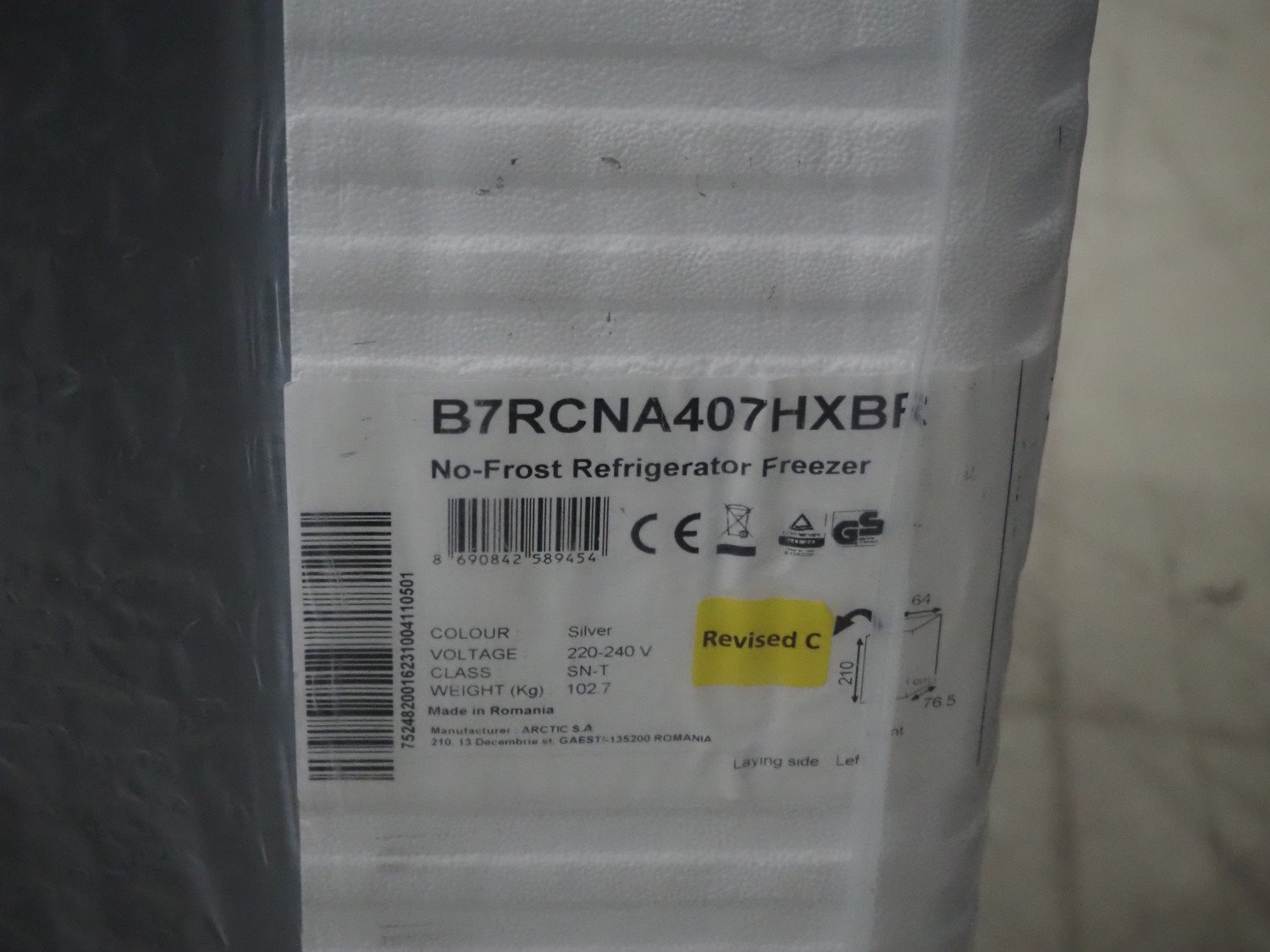 Beko No-Frost refrigerator/freezer, type: B7RCNA407HXBR, 220-240 V, dimensions: 600 mm x 750 mm x 2100 mm. Kavel locatie: Looyenbeemd 11, 5652 BH Eindhoven, Nederland