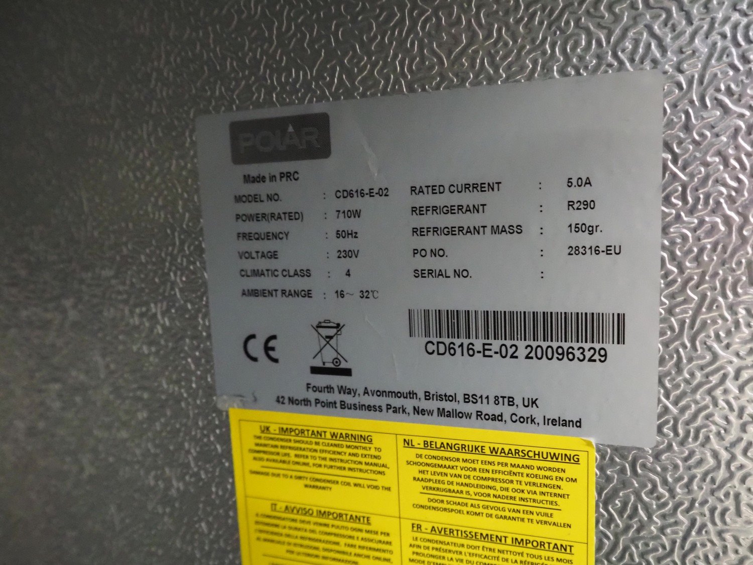 Polar mobile refrigerator, model: CD616-E-02, serial number: CD616-E-02 20096329, 230 V, 50 Hz, 5.0 A, 710 W, refrigerant: R290 / 150 gr, dimensions: 1350 mm x 810 mm x 2000 mm. Kavel locatie: Looyenbeemd 11, 5652 BH Eindhoven, Nederland