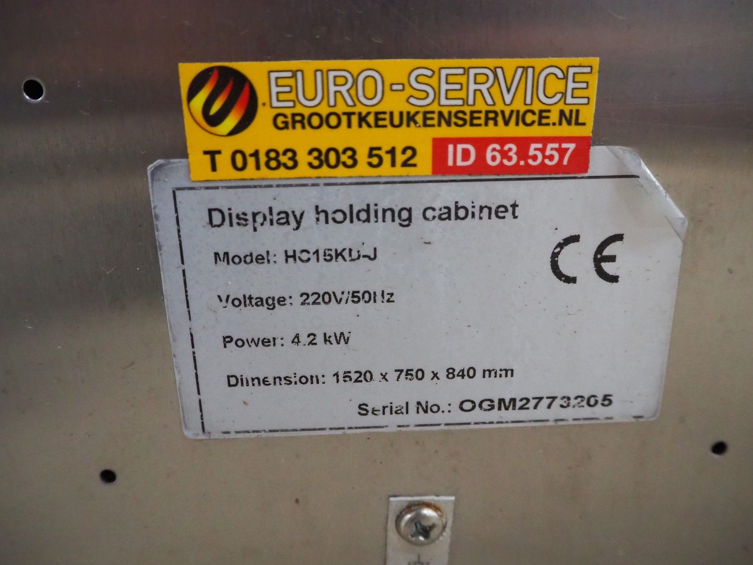 Heated display cabinet, model: HC15KD-J, serial number: OGM2773205, 220 V, 50 Hz, 4.2 kW, dimensions inside: 1400 mm x 200 mm, total dimensions: 1520 mm x 800 mm x 830 mm. Kavel locatie: Looyenbeemd 11, 5652 BH Eindhoven, Nederland
