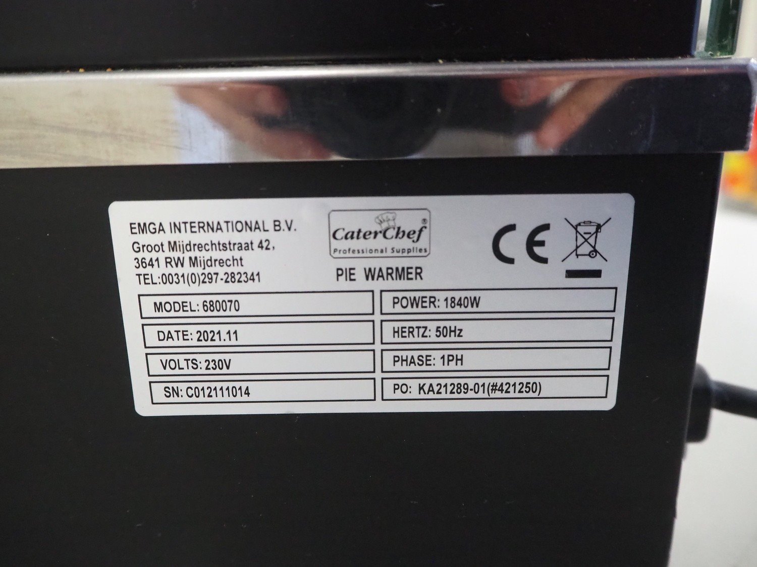 Emga International pie warmer, model: 680070, serial number: C012111014, year of construction: 11.2021, 230 V, 1 Ph, 50 Hz, 1840 W, dimensions: 660 mm x 400 mm x 640 mm. Kavel locatie: Looyenbeemd 11, 5652 BH Eindhoven, Nederland