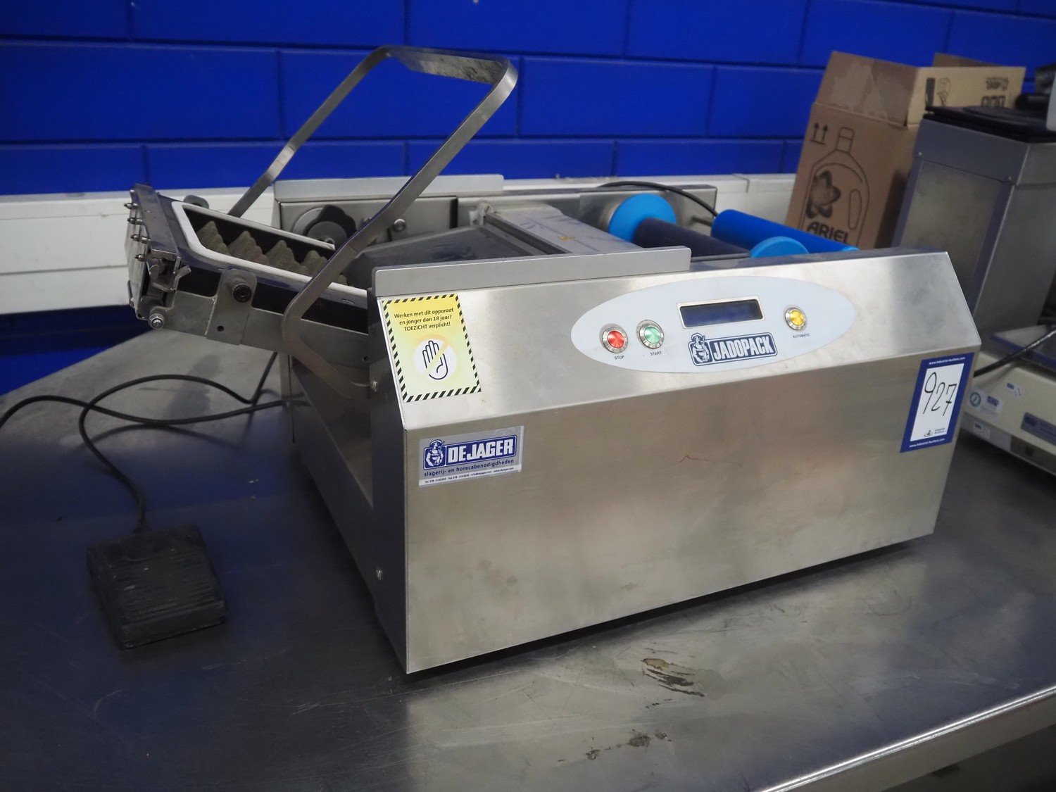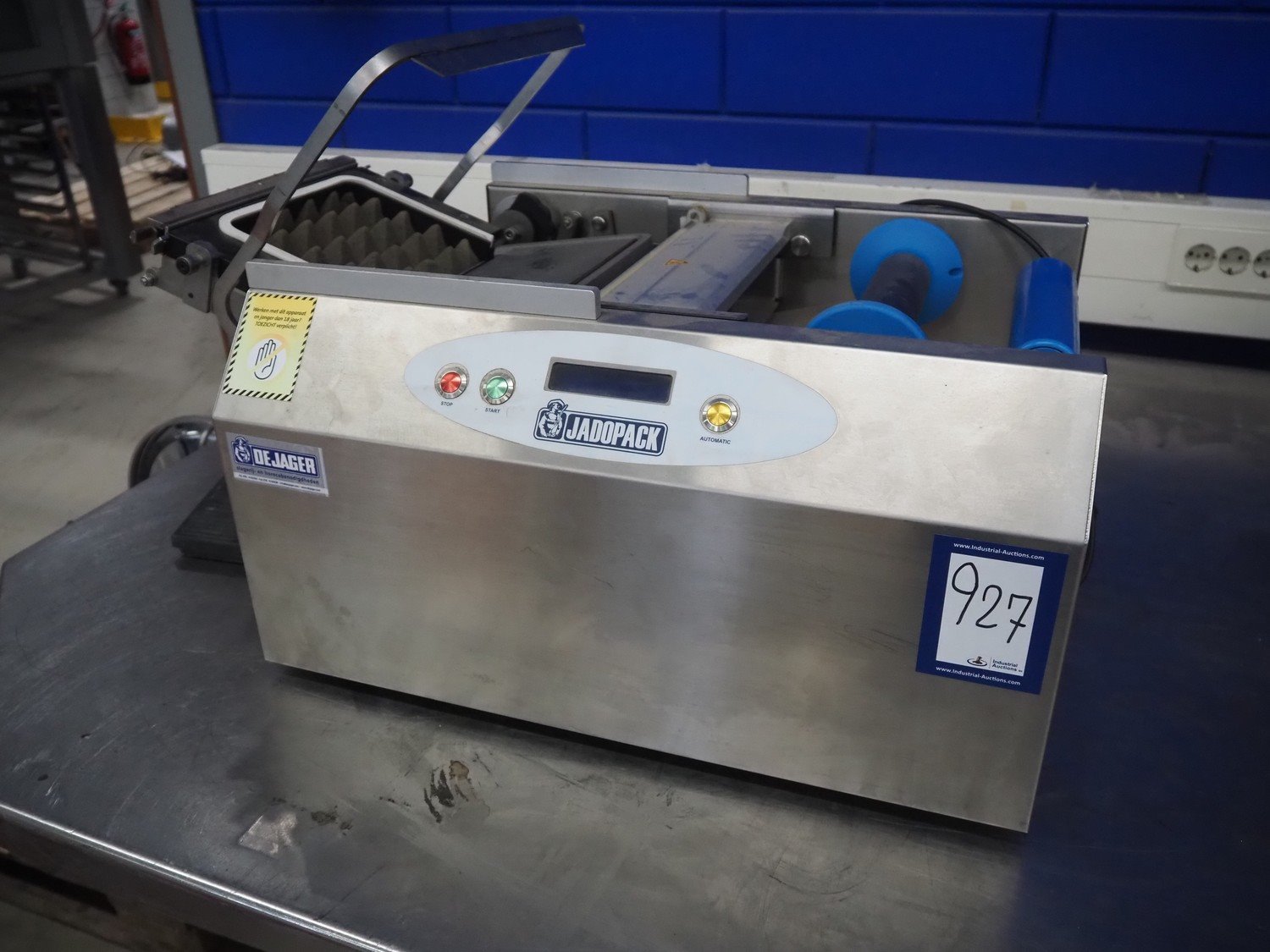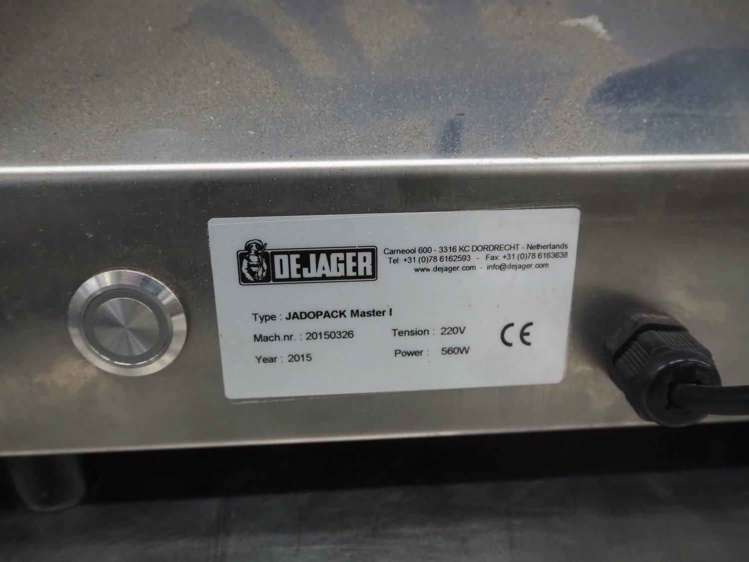 De Jager packaging machine, type: JADOPACK Master I, machine number: 20150326, year of construction: 2015, 220 V, 560 W, film width: 230 mm, seal: 220 mm x 170 mm, total dimensions: 730 mm x 520 mm x 450 mm. Kavel locatie: Looyenbeemd 11, 5652 BH Eindhoven, Nederland