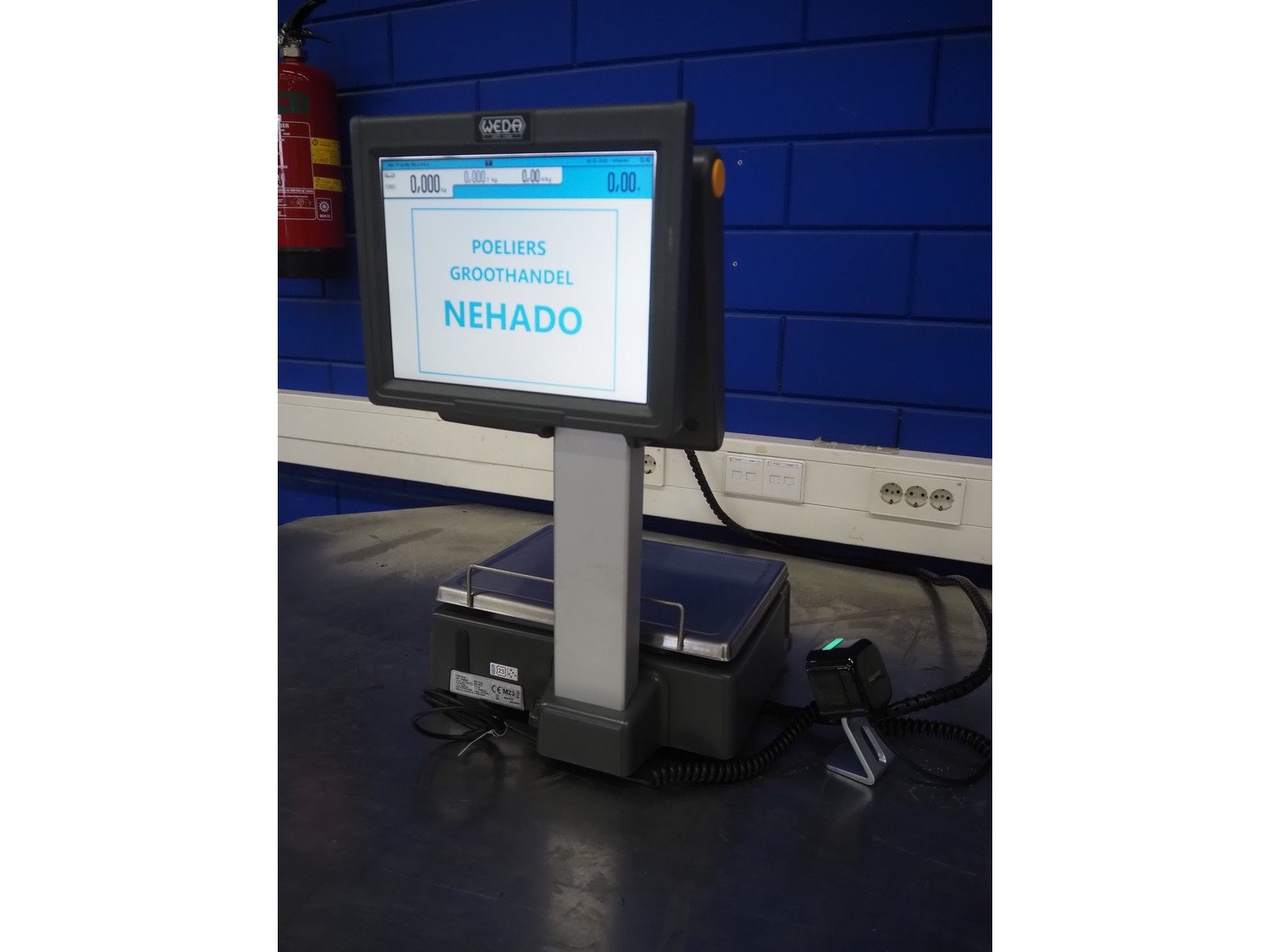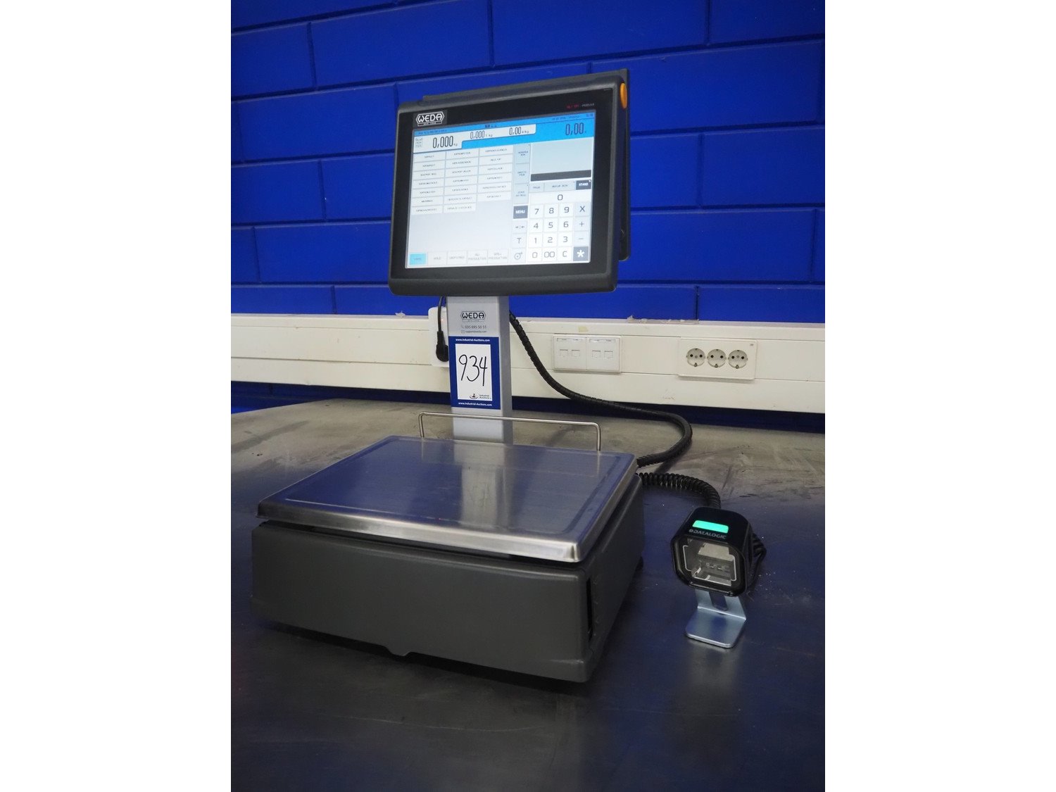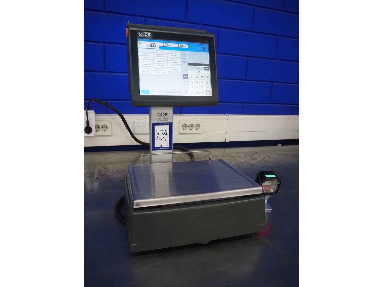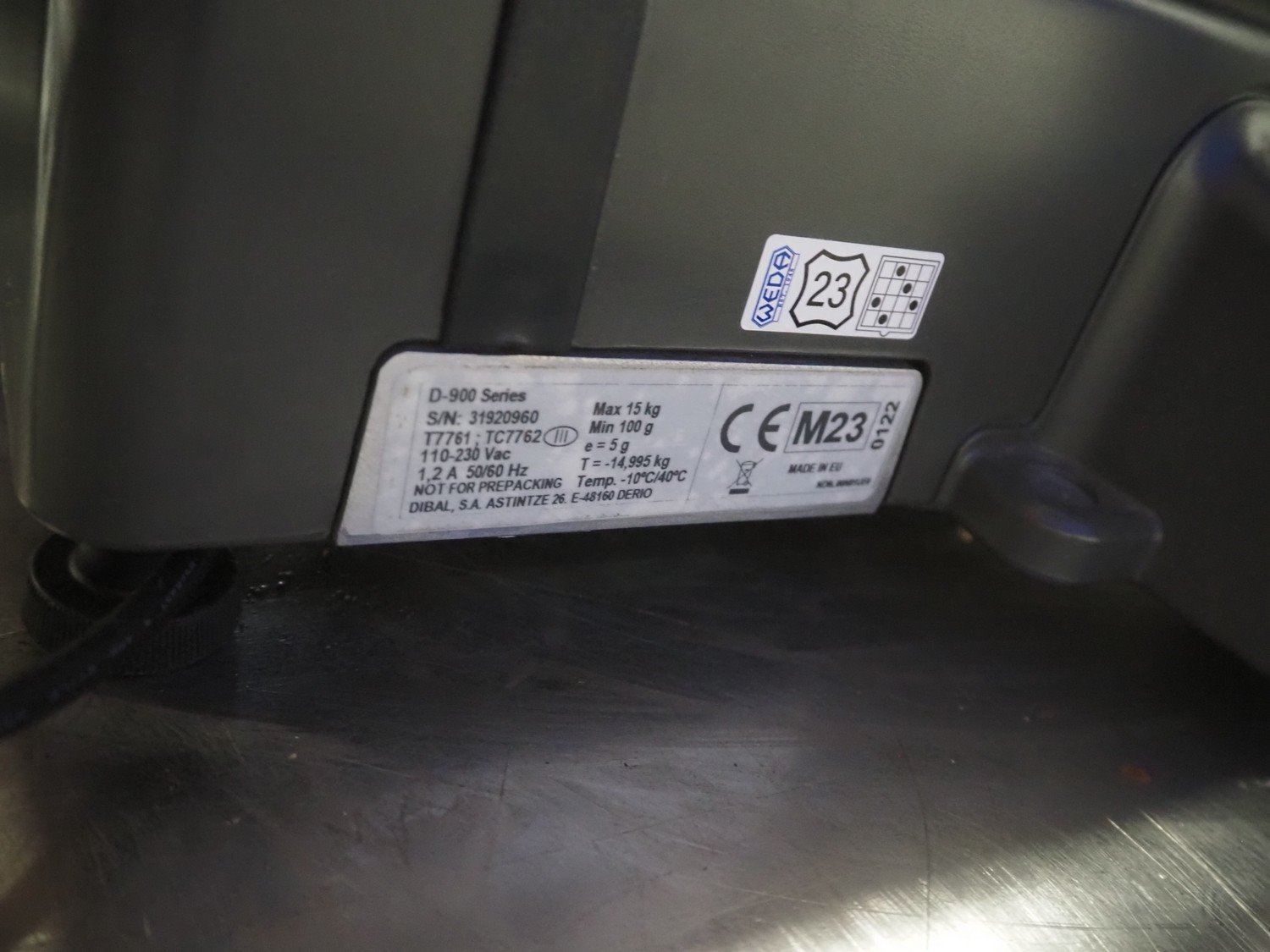 Dibal S.A. weighing scale with label printer and scanner, model: D-900 series, serial number: 31920960, 110-230 V, 50/60 Hz, 1.2 A, maximum weight: 15 kg, minimum weight: 100 gram, e= 5 gram, T= -14.995 kg, dimensions scale: 360 mm x 280 mm, total dimensions: 380 mm x 460 mm x 620 mm. Kavel locatie: Looyenbeemd 11, 5652 BH Eindhoven, Nederland