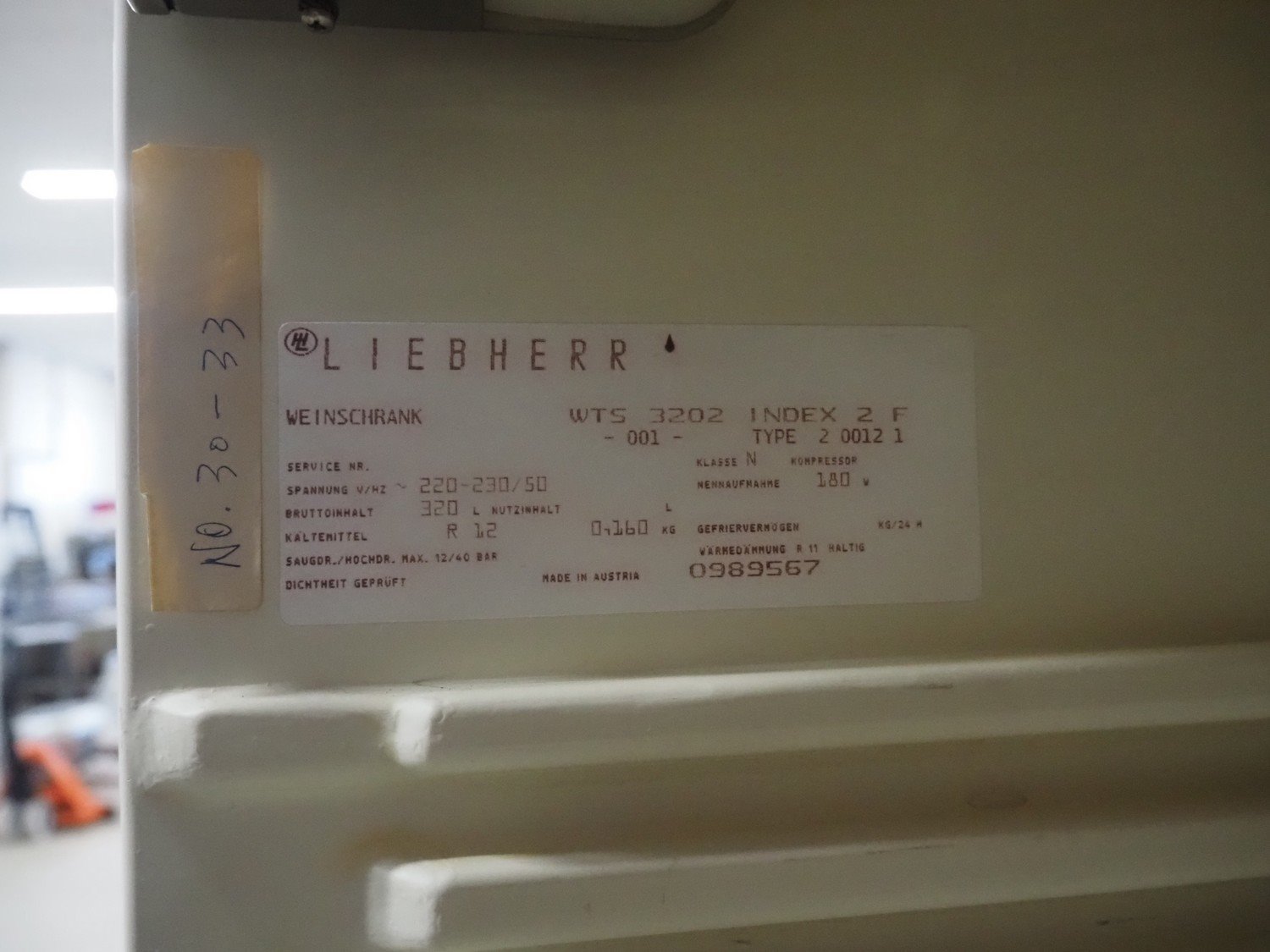 Liebherr refrigerator, model: WTS 3202, type: 2 0012 1serial number: 0989567, 220-230 V, 50 Hz, volume: 320 liter, refrigerant: R12 / 0.160 kg, dimensions: 600 mm x 600 mm x 1600 mm. Kavel locatie: Looyenbeemd 11, 5652 BH Eindhoven, Nederland