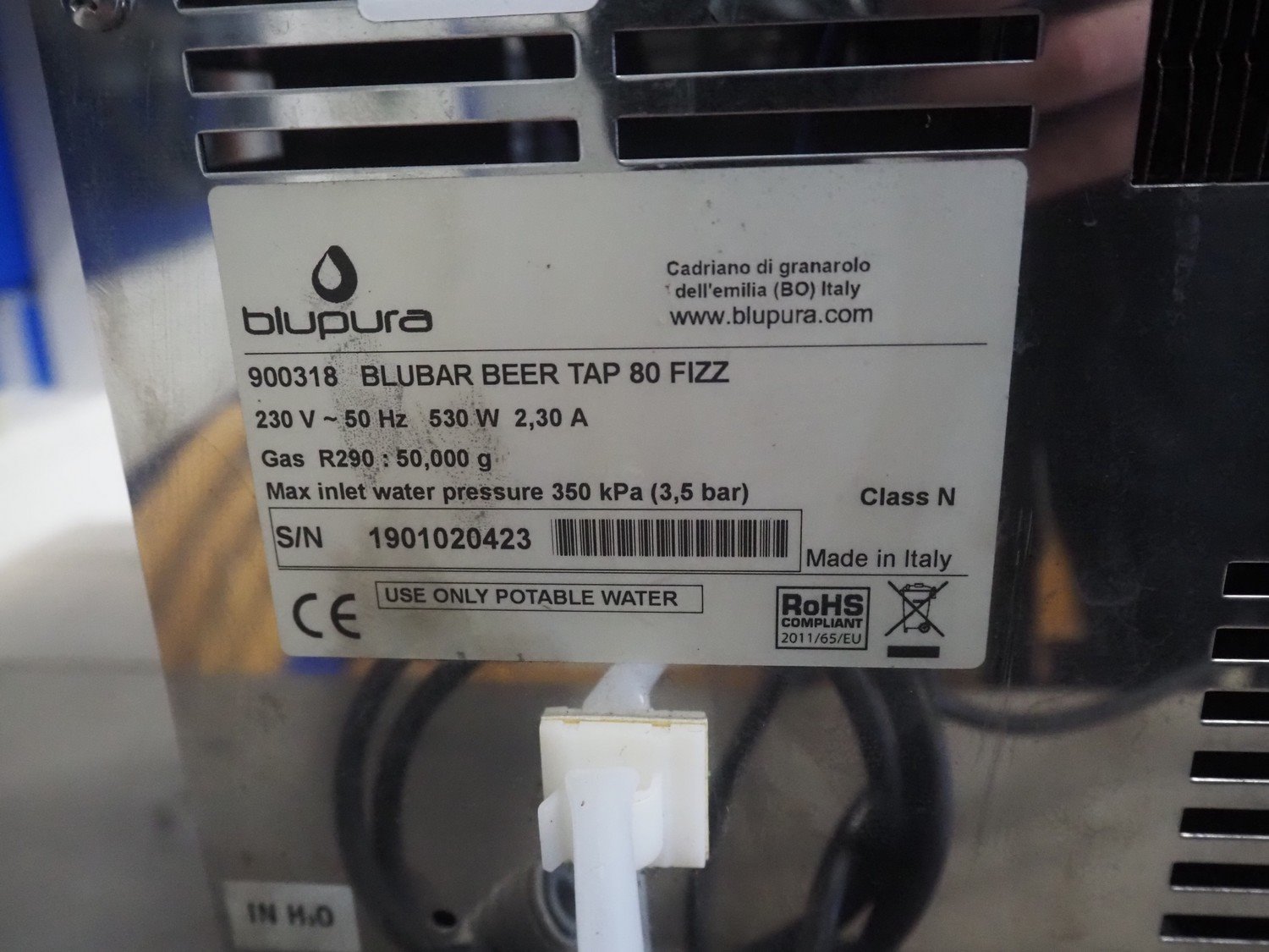 Blupura beer tap, model: BLUBAR BEER TAP 80 FIZZ, serial number: 1901020423, 230 V, 50 Hz, 2.3 A, 530 W, refrigerant: R290, dimensions: 500 mm x 350 mm x 510 mm. Kavel locatie: Looyenbeemd 11, 5652 BH Eindhoven, Nederland