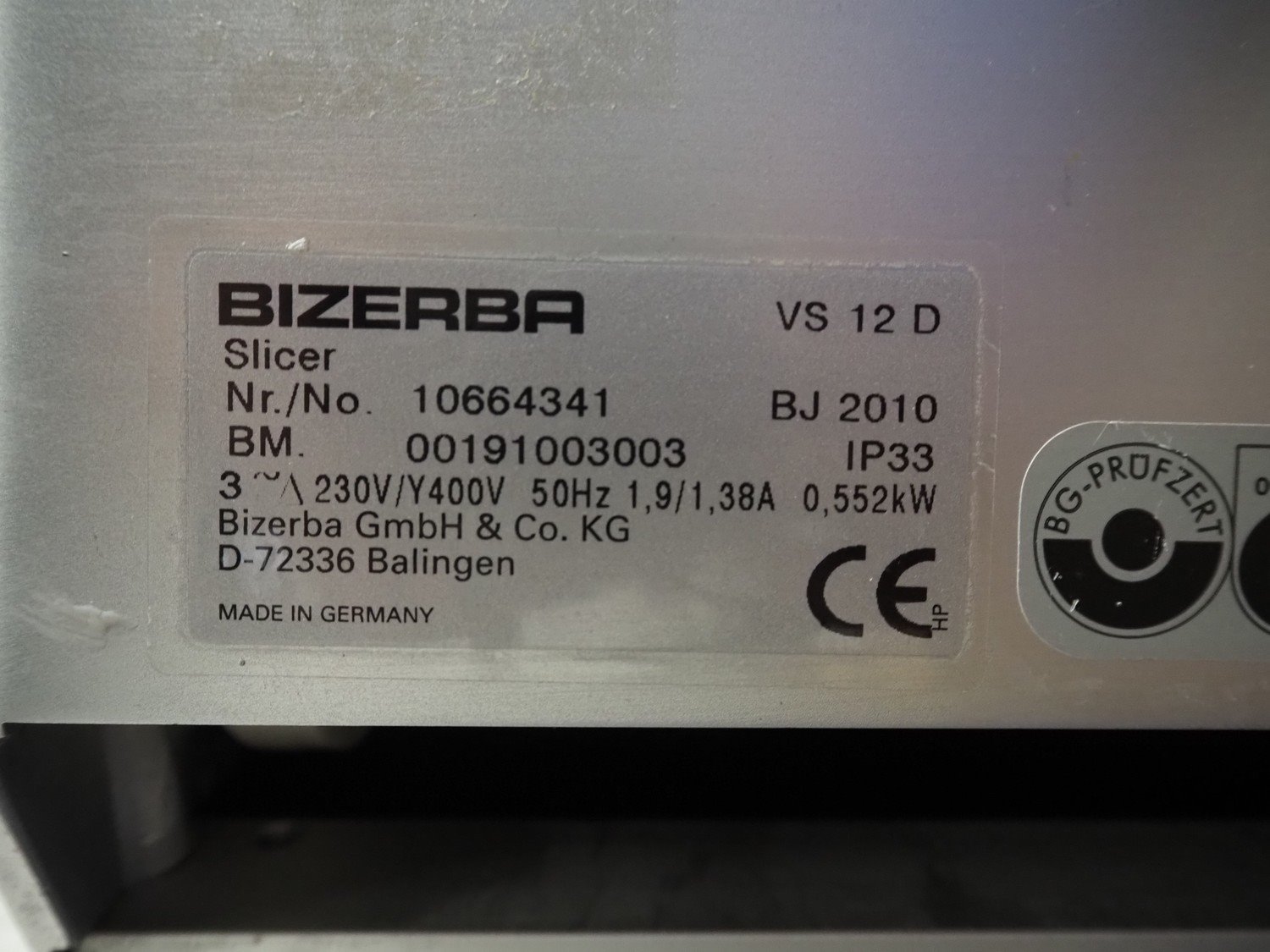 Bizerba automatic slicer, type: VS 12 D, number: 10664341, year of construction: 2010, 230/400 V, 3 Ph, 50 Hz, 1.9/1.38 A, 0.552 kW, dimensions: 850 mm x 630 mm x 500 mm. Kavel locatie: Looyenbeemd 11, 5652 BH Eindhoven, Nederland