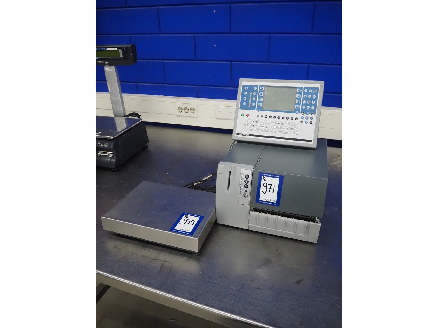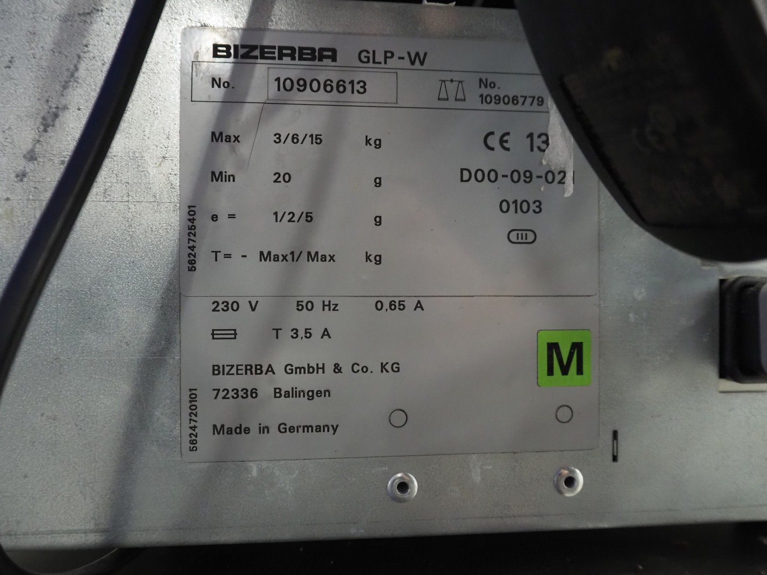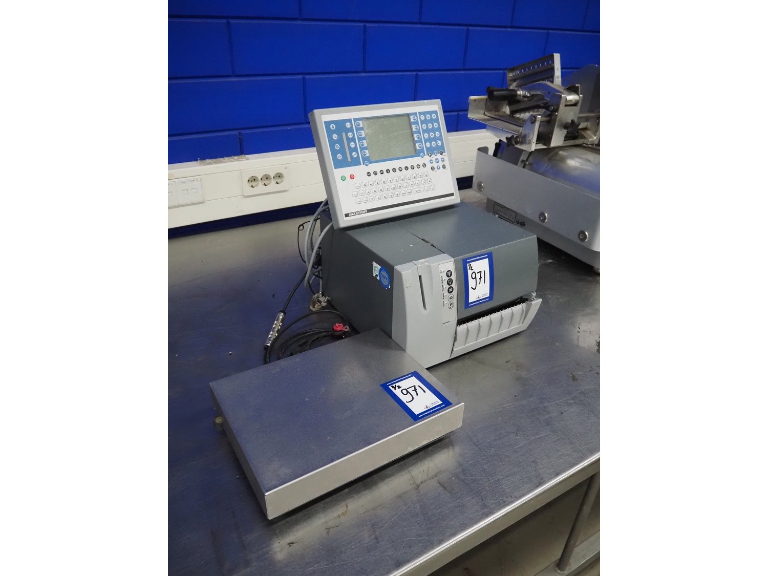Bizerba weighing scale with indicator and label printer, type: GLP-W, number: 10906613, 230 V, 50 Hz, 0.65/3.5 A, maximum capacity: 3/6/15 kg, minimum capacity: 20 g, e= 1/2/5 g, dimensions scale: 335 mm x 260 mm, dimensions label printer: 430 mm x 350 mm x 470 mm. Kavel locatie: Looyenbeemd 11, 5652 BH Eindhoven, Nederland