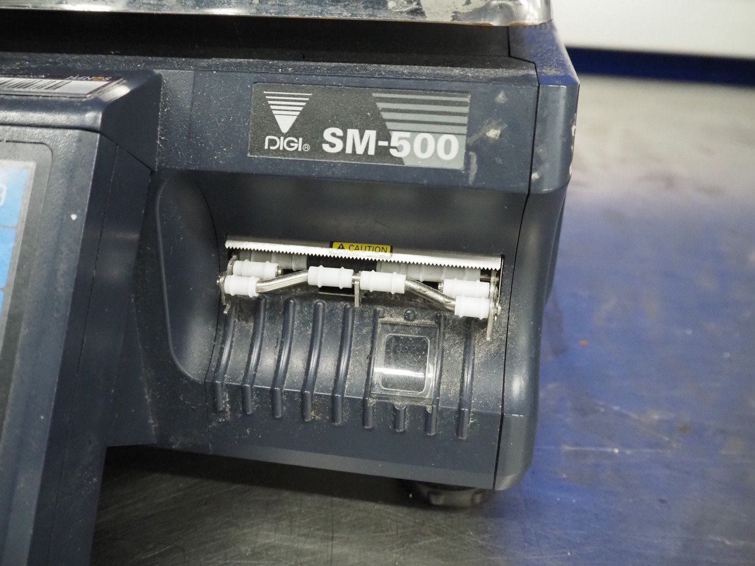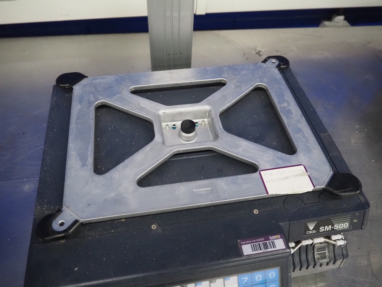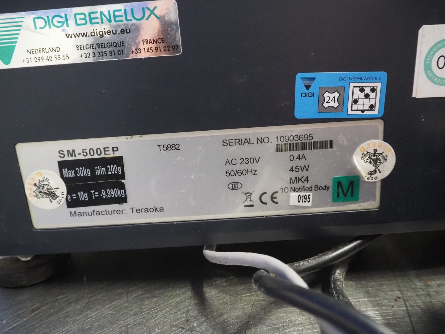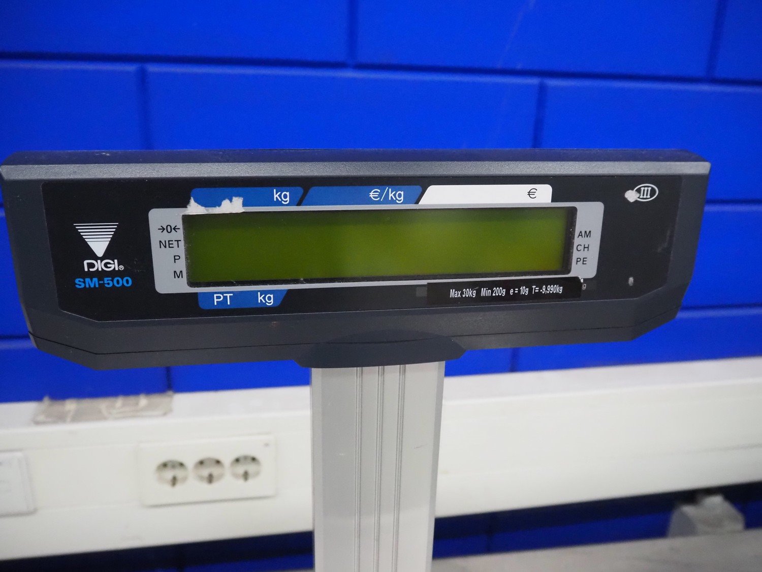 Digi Benelux weighing scale with label printer and extra scale, model: SM-500EP, serial number: 10903695, 230 V, 50/60 Hz, 0.4 A, 45 W, maximum capacity: 30 kg, minimum capacity: 200 g, e= 10 g, T= -9.990 kg, scale dimensions: 380 mm x 280 mm, total dimensions: 400 mm x 480 mm x 560 mm. Dimensions extra scale: 500 mm x 350 mm. Kavel locatie: Looyenbeemd 11, 5652 BH Eindhoven, Nederland