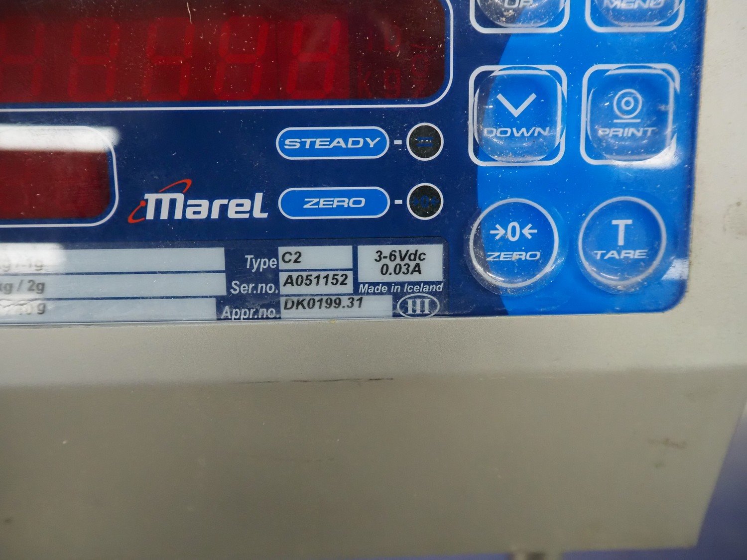 Marel weighing scale, type: C2, serial number: A051152, maximum capacity: 3/6 kg, minimum capacity: 20/40 g, 300 mm x 300 mm x 450 mm. Technical conditions unknown. Kavel locatie: Looyenbeemd 11, 5652 BH Eindhoven, Nederland