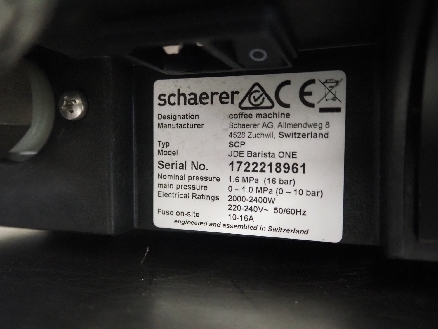 Schaerer coffee machine, type: SCP, model: JDE Barista ONE, serial number: 1722218961, 220/240 V, 1 Ph, 50/60 Hz, 10/16 A, 2000/2400 W, dimensions: 550 mm x 350 mm x 800 mm. Kavel locatie: Looyenbeemd 11, 5652 BH Eindhoven, Nederland