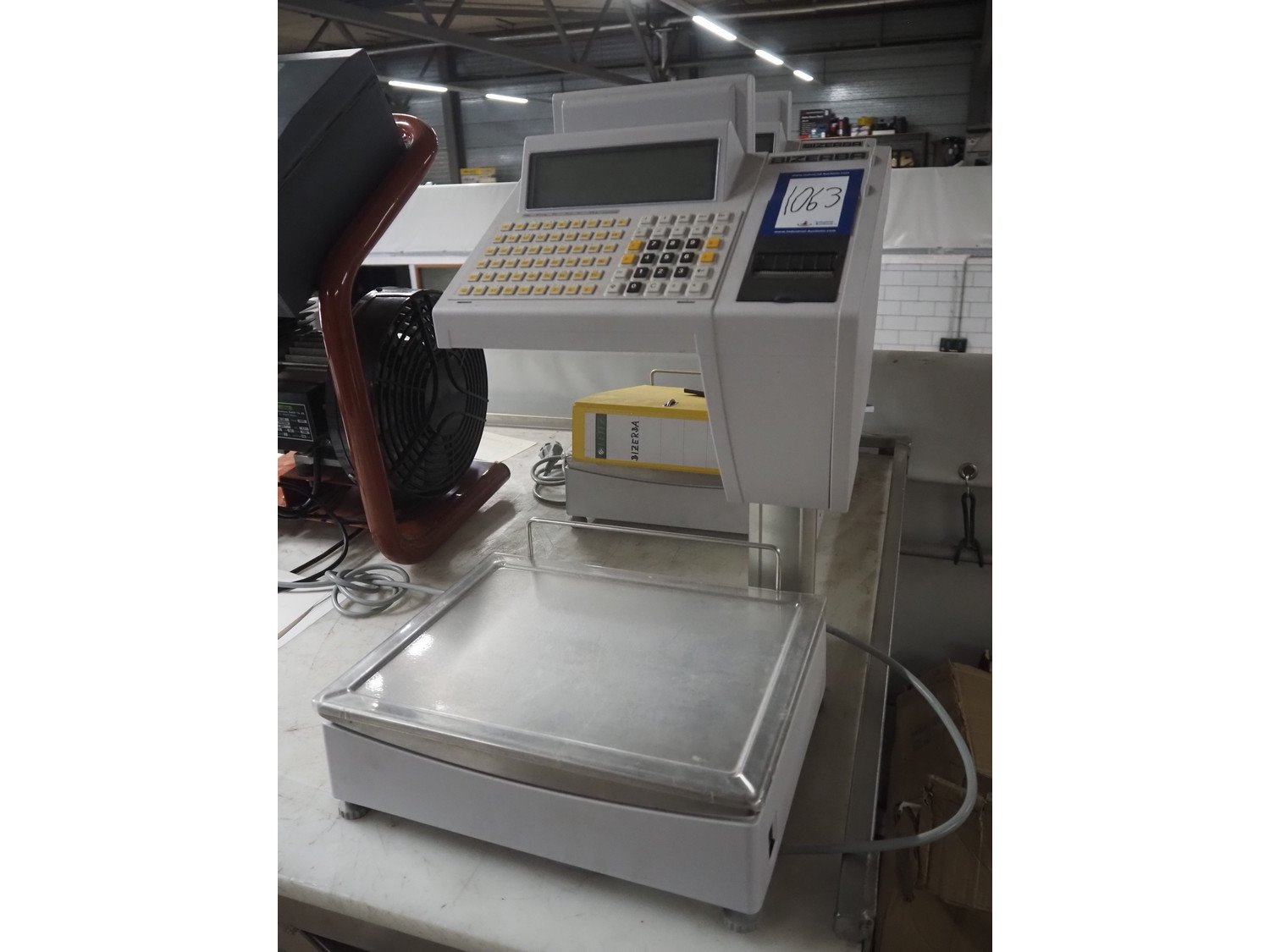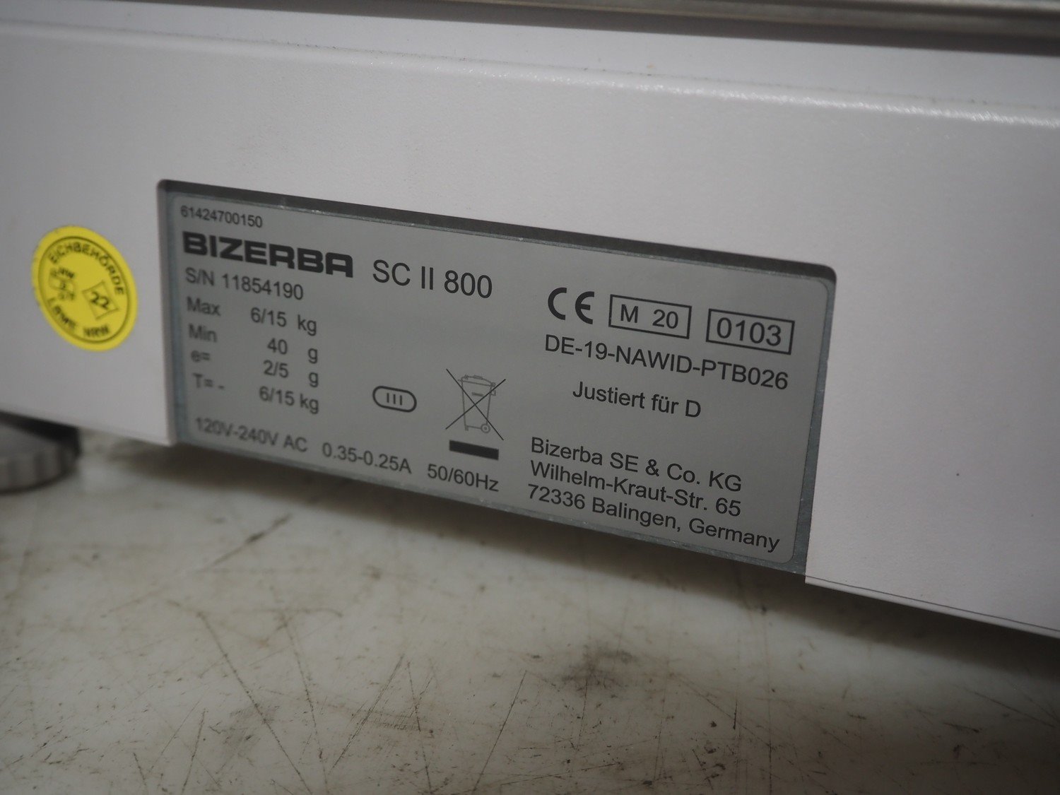 Bizerba weighing scale with label printer, type: SC II 800, serial number: 11854190, 120/240 V, 50/60 Hz, 0.35-0.25 A, minimum weight: 40 gram, maximum weight: 6/15 Kg, e= 2/5 gram, scale dimensions: 350 mm x 270 mm, total dimensions: 480 mm x 350 mm x 560 mm. Kavel locatie: Looyenbeemd 11, 5652 BH Eindhoven, Nederland