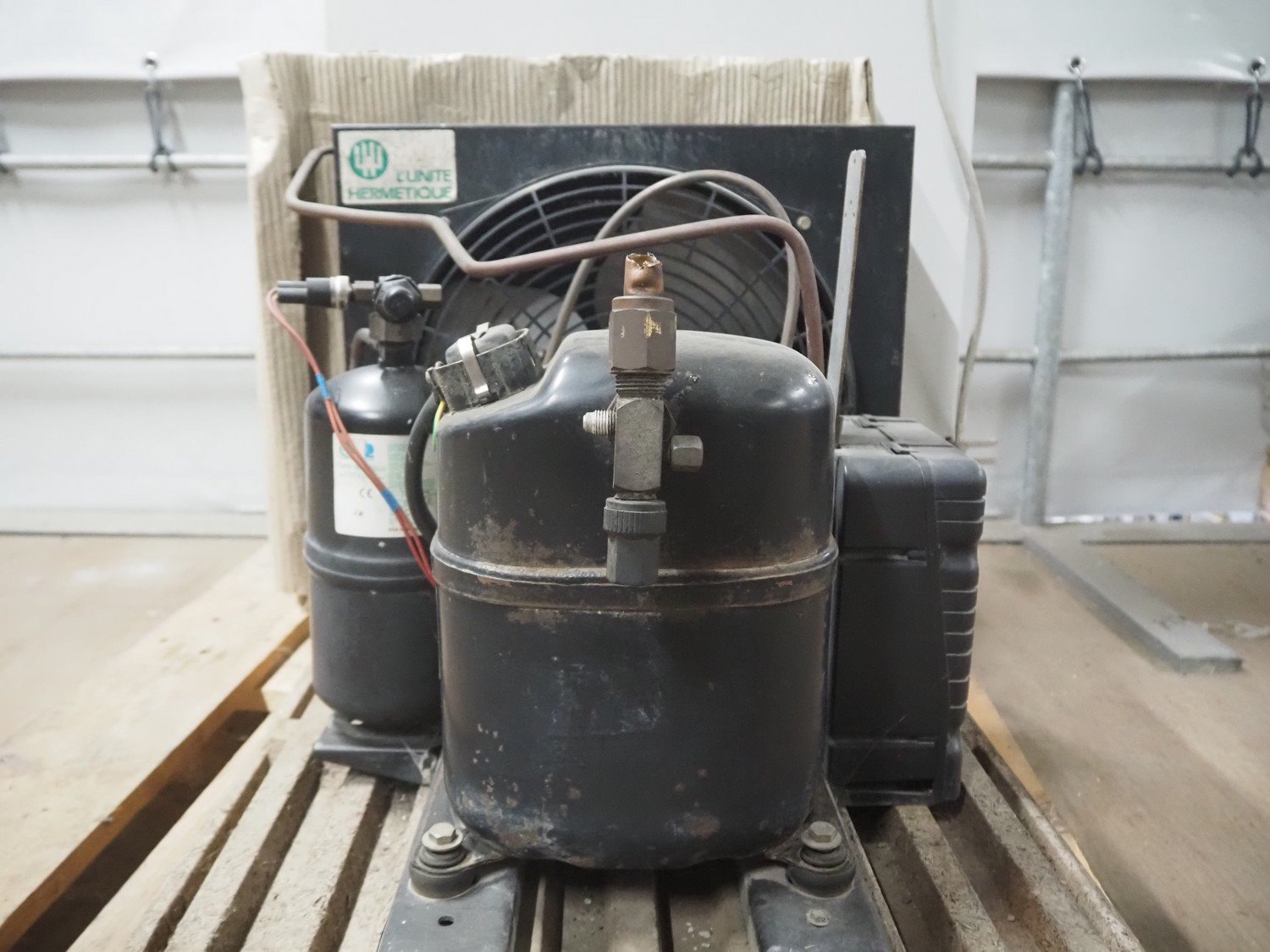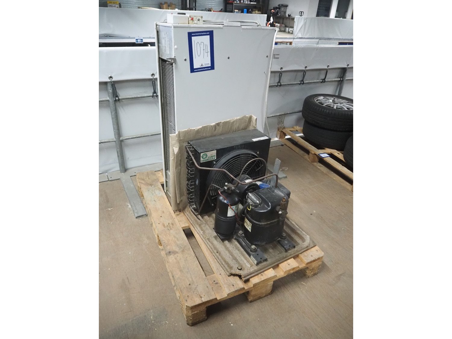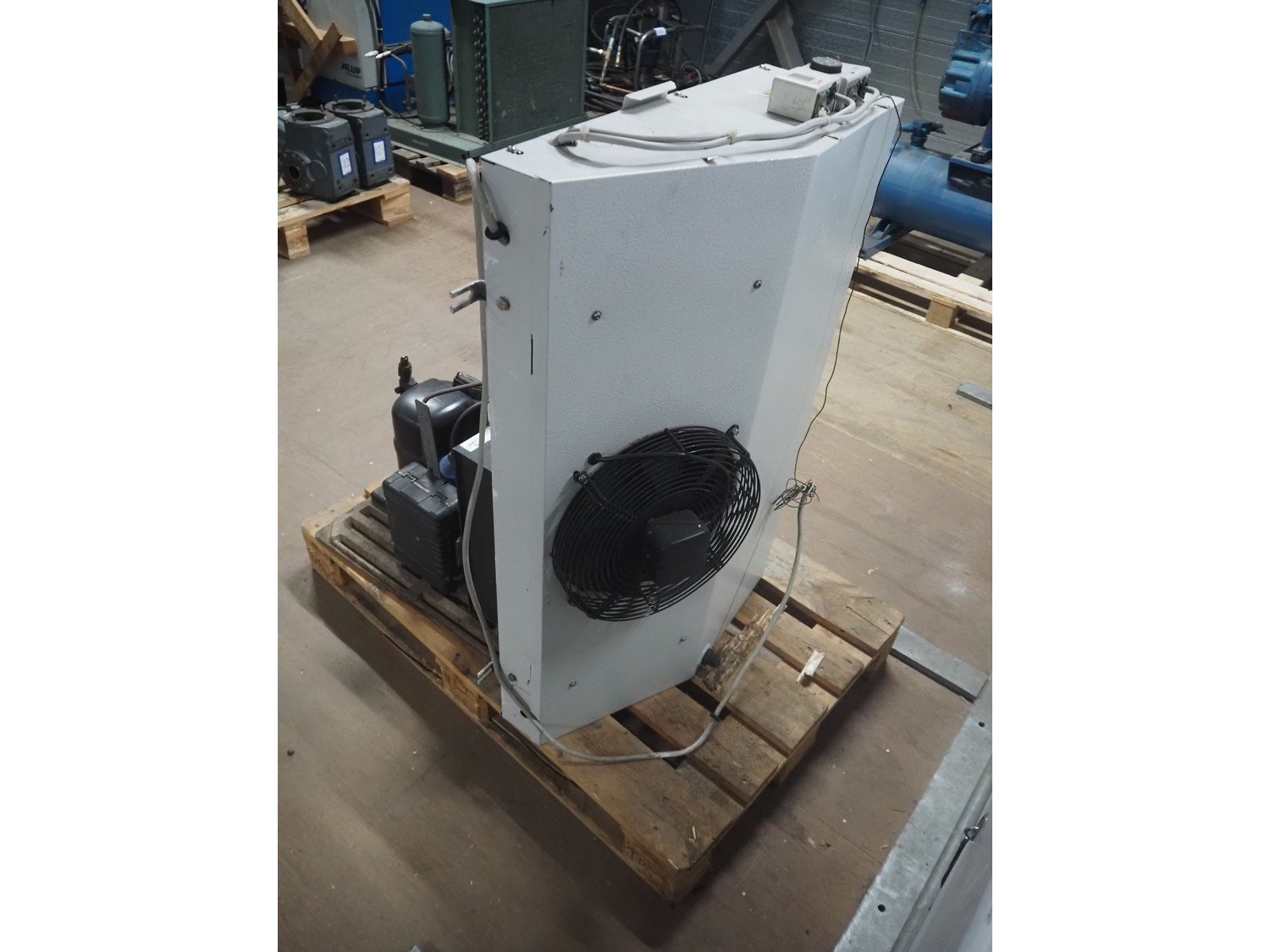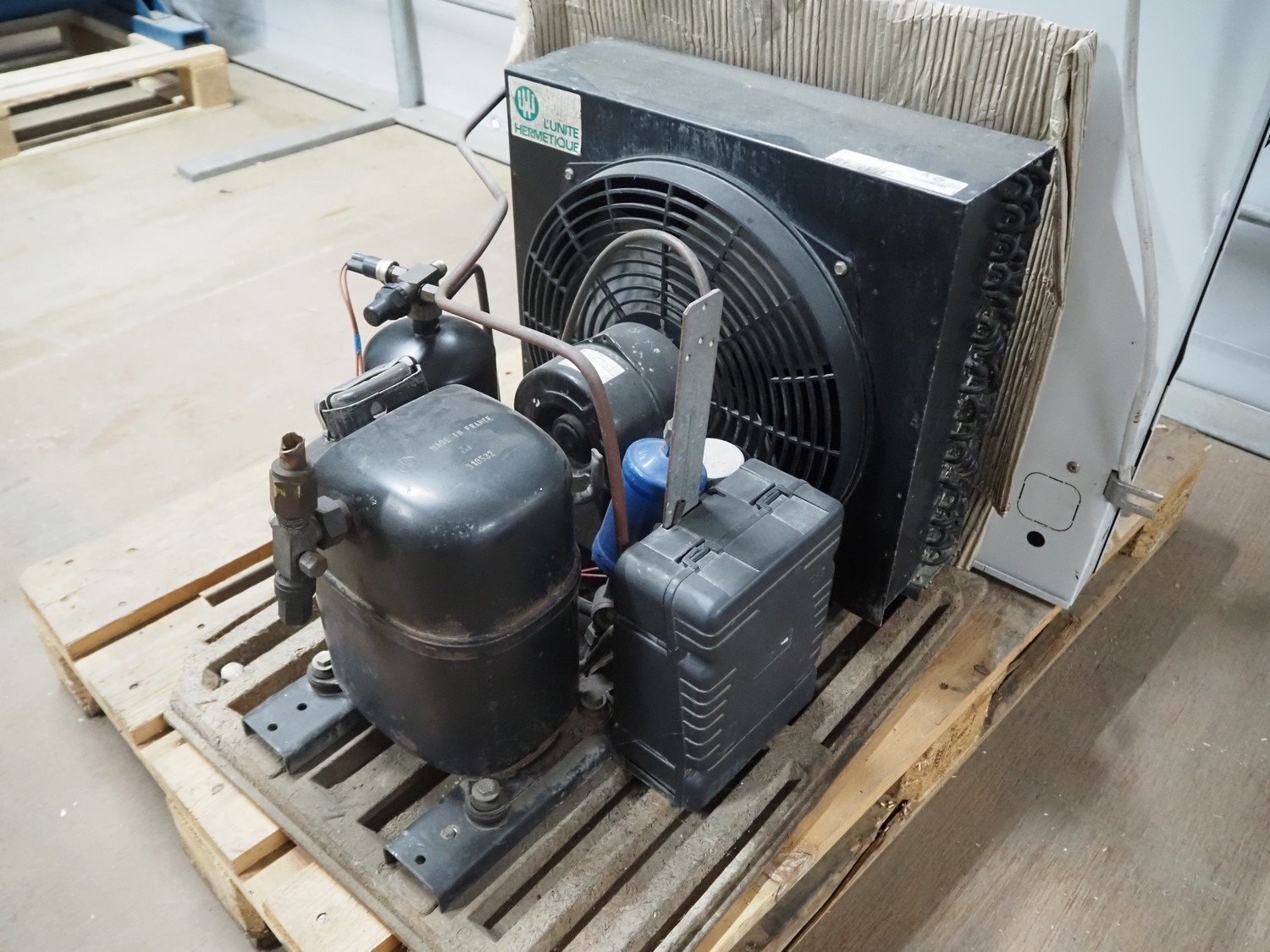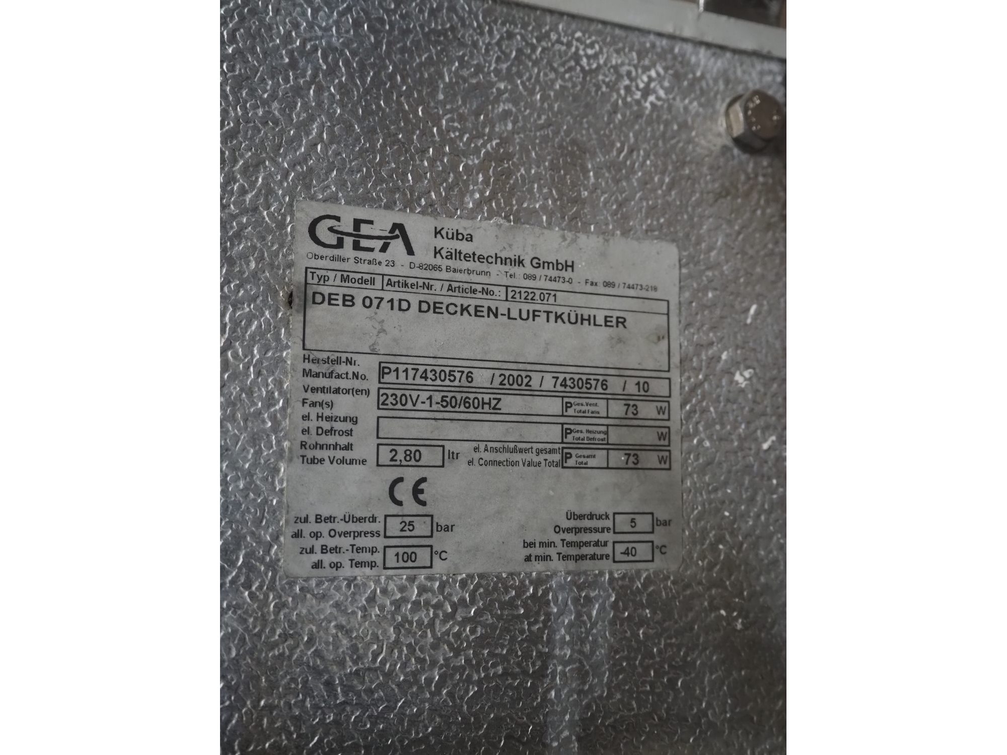 GEA evaporator, type: DEB 071D Decken-Luftkühler, number: P117430576, year of construction: 2002, 230 V, 1 Ph, 50/60 Hz, dimensions: 670 mm x 1050 mm x 240 mm with L'unite Hermetique cooling compressor, dimensions: 700 mm x 600 mm x 500 mm. Kavel locatie: Looyenbeemd 11, 5652 BH Eindhoven, Nederland