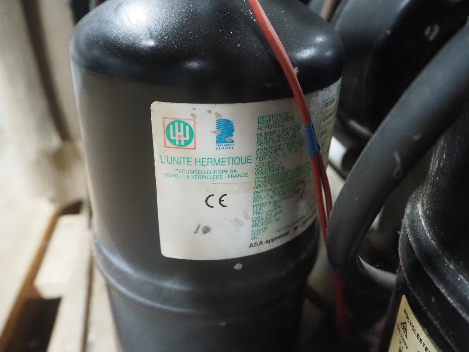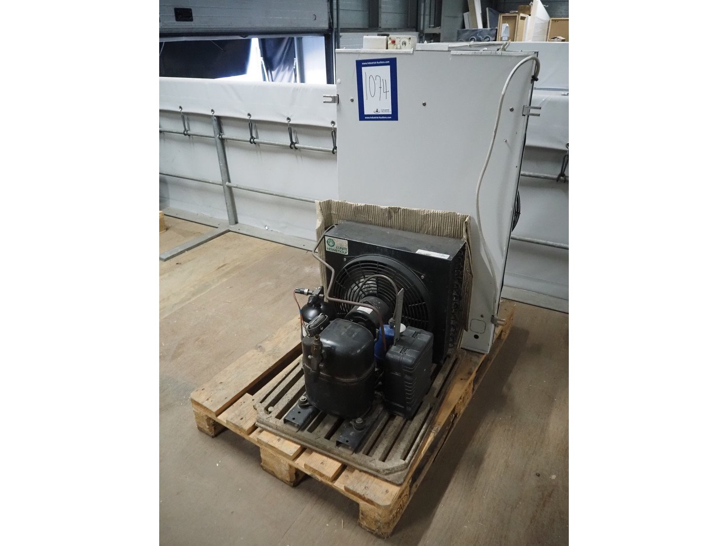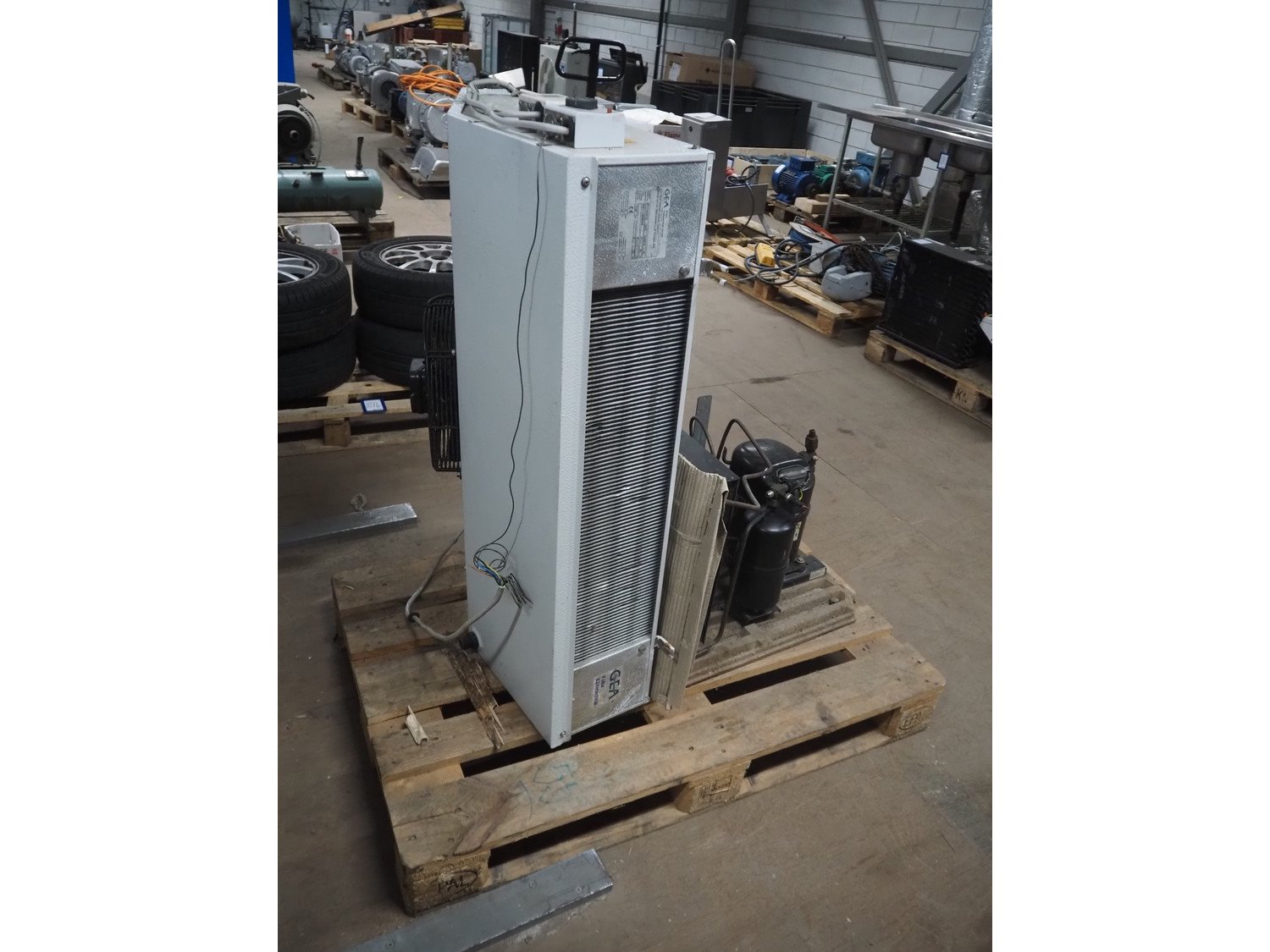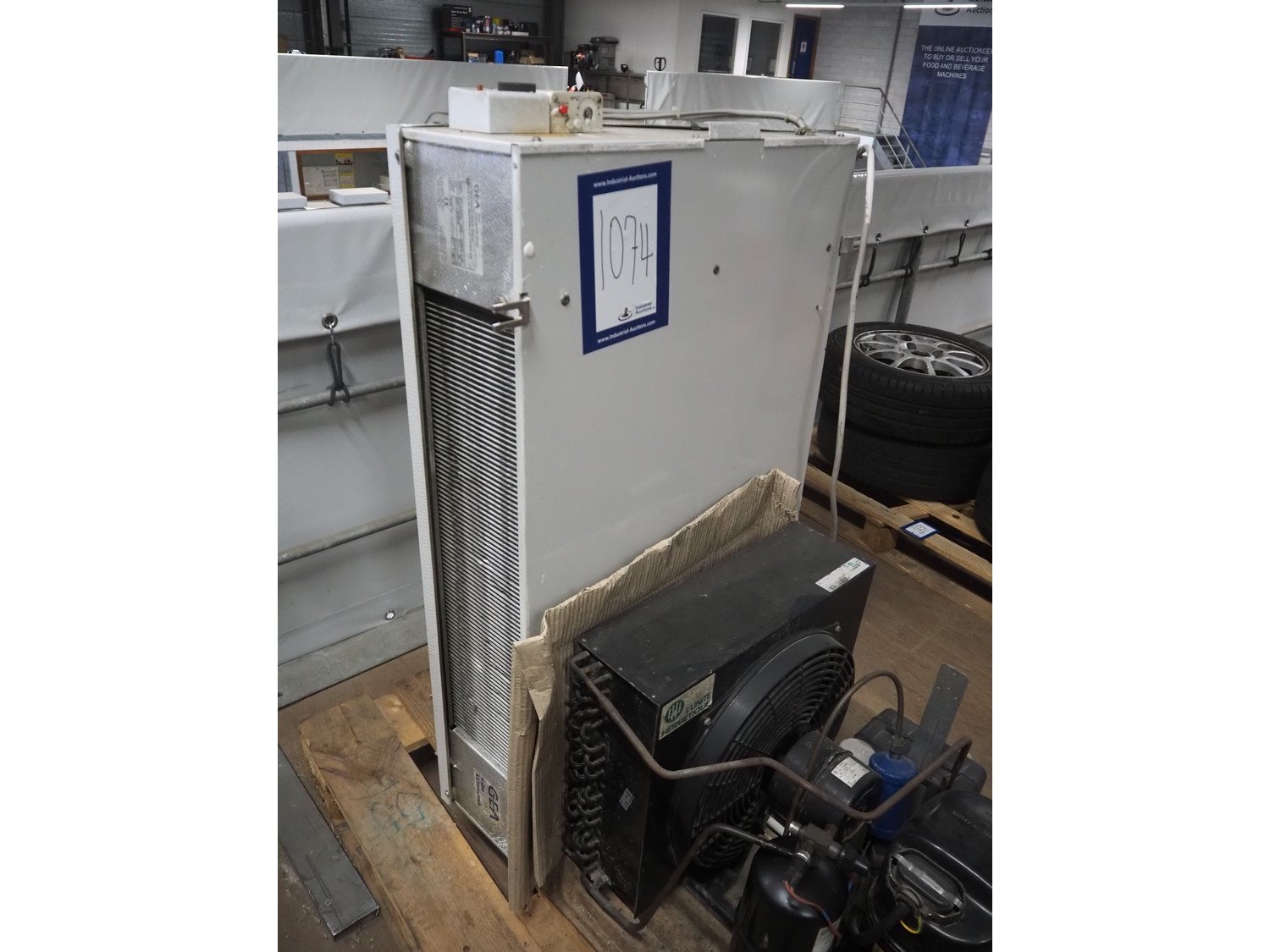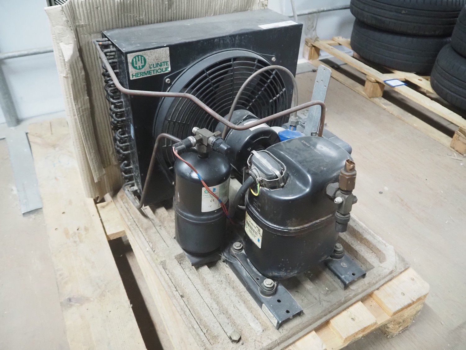 GEA evaporator, type: DEB 071D Decken-Luftkühler, number: P117430576, year of construction: 2002, 230 V, 1 Ph, 50/60 Hz, dimensions: 670 mm x 1050 mm x 240 mm with L'unite Hermetique cooling compressor, dimensions: 700 mm x 600 mm x 500 mm. Kavel locatie: Looyenbeemd 11, 5652 BH Eindhoven, Nederland