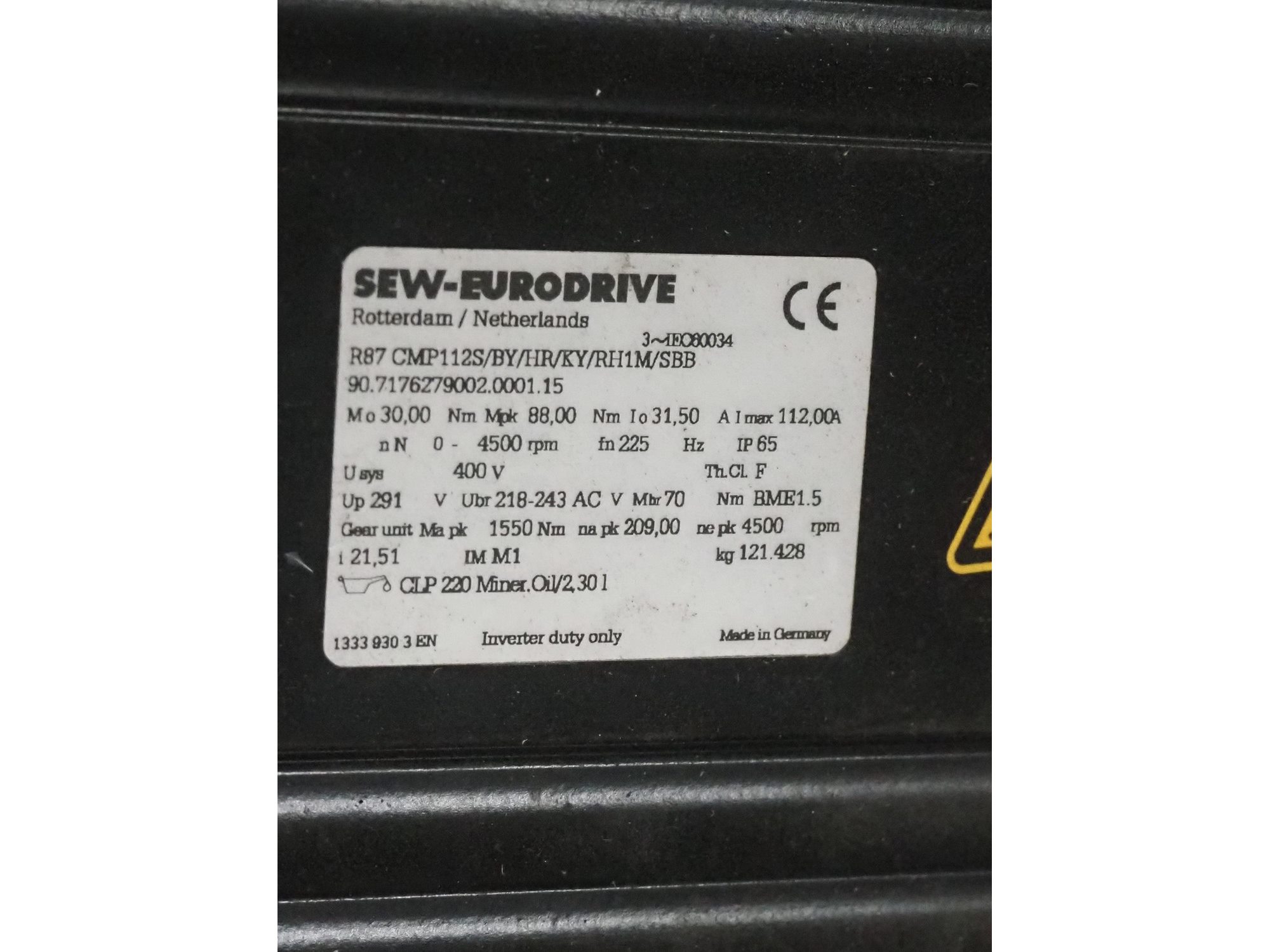 SEW-Eurodrive motor, dimensions: 820 mm x 290 mm x 300 mm. Kavel locatie: Looyenbeemd 11, 5652 BH Eindhoven, Nederland