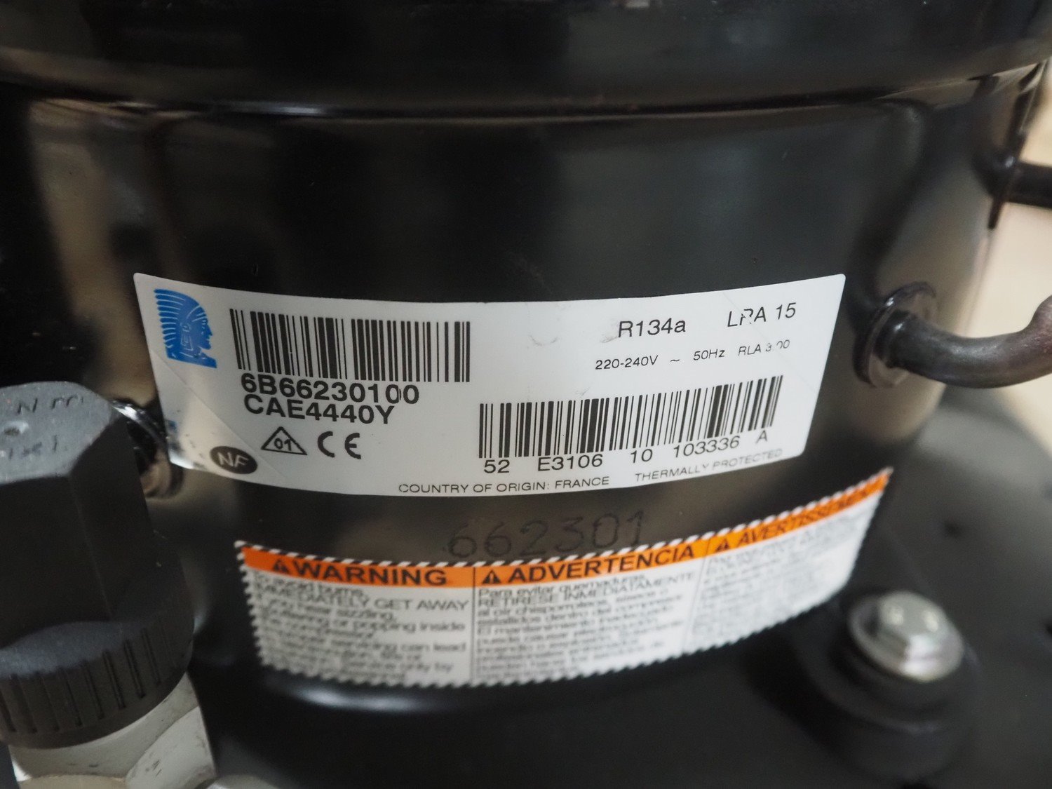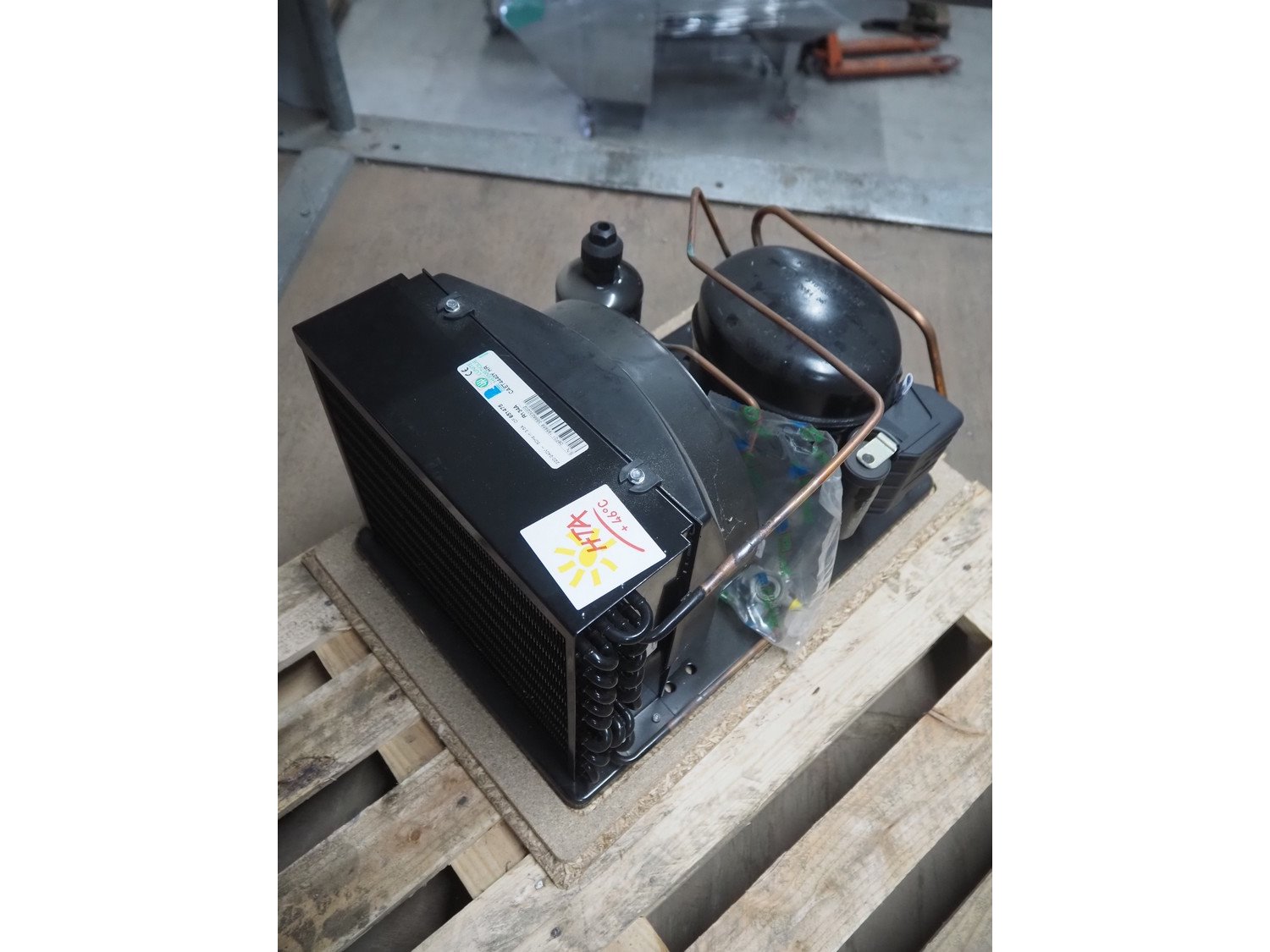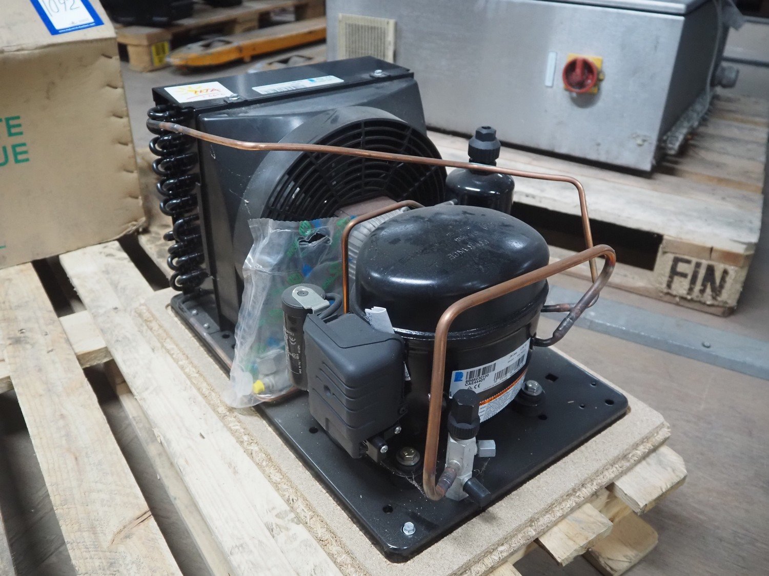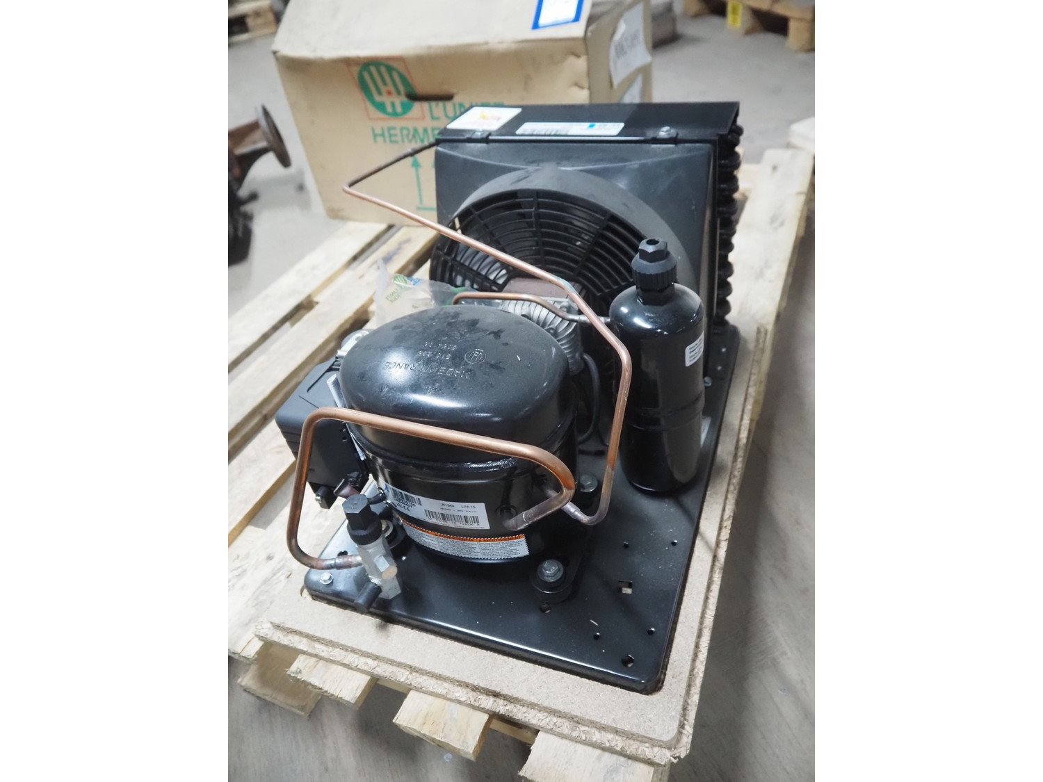 L'Unite Hermetique / Tecumseh condensing unit with cooling compressor, type: CAET4440Y HR, serial number: 06F01 195956 3B66230202, 220/240 V, 1 Ph, 50 Hz, 3.8 A, refrigerant: R134A, dimensions: 650 mm x 630 mm x 460 mm. Kavel locatie: Looyenbeemd 11, 5652 BH Eindhoven, Nederland