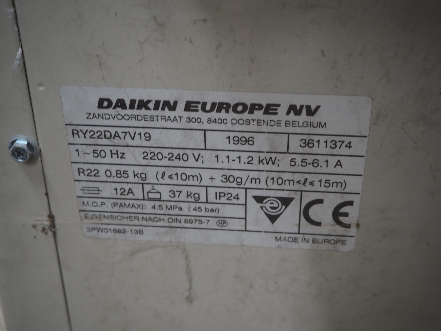 Daikin Europe NV condensing unit for air conditioning, model: RY22DA7V19, number: 3611374, year of construction: 1996, 220/240 V, 1 Ph, 50 Hz, 5.5/6.1 A, 1.1/1.2 kW, refrigerant: R22, 0.85 kg, dimensions: 750 mm x 300 mm x 550 mm. Kavel locatie: Looyenbeemd 11, 5652 BH Eindhoven, Nederland