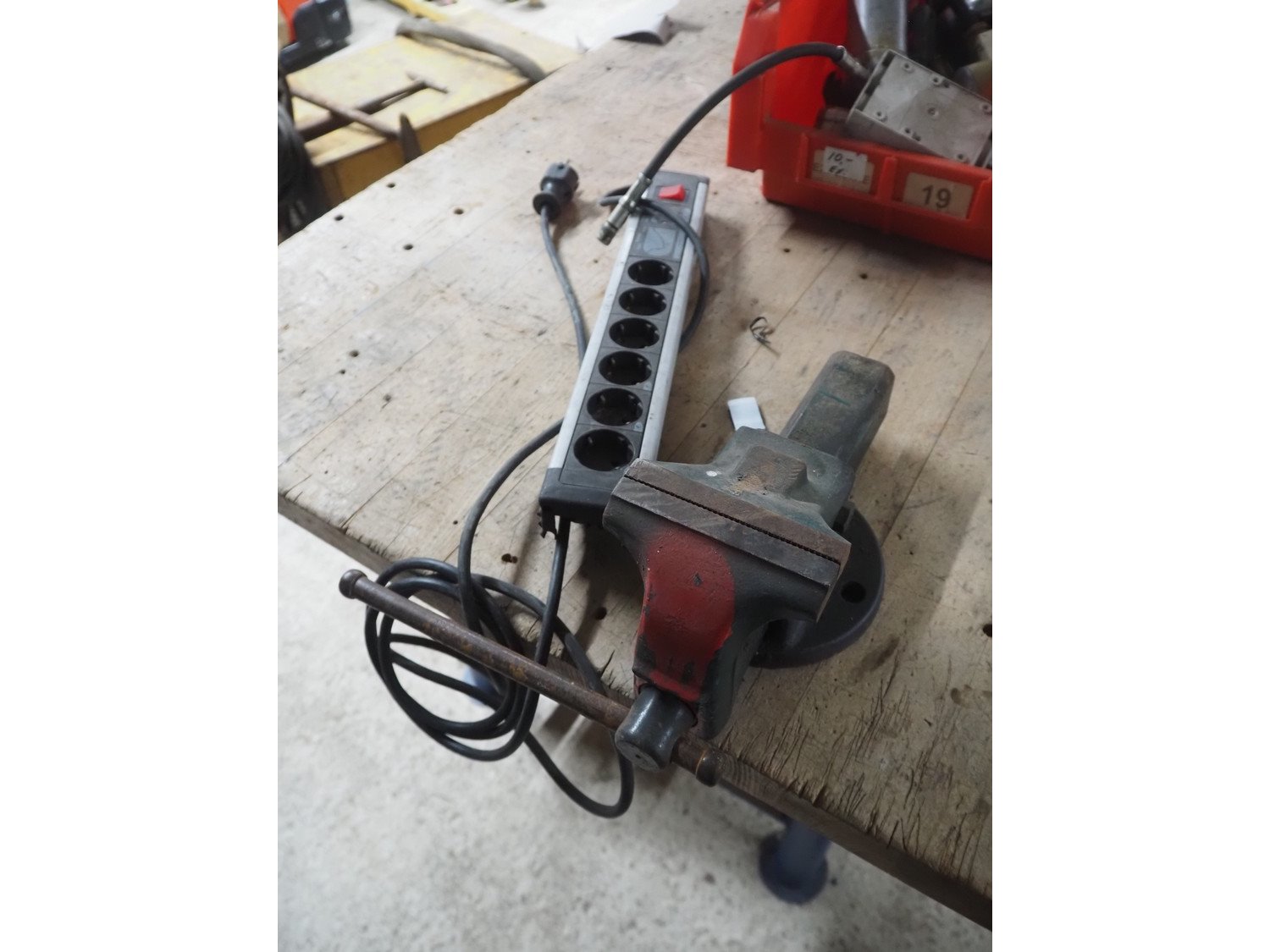 Wooden workbench, steel frame, 2 steel vises, dimensions: 1500 mm x 800 mm x 800 mm. Kavel locatie: Looyenbeemd 11, 5652 BH Eindhoven, Nederland