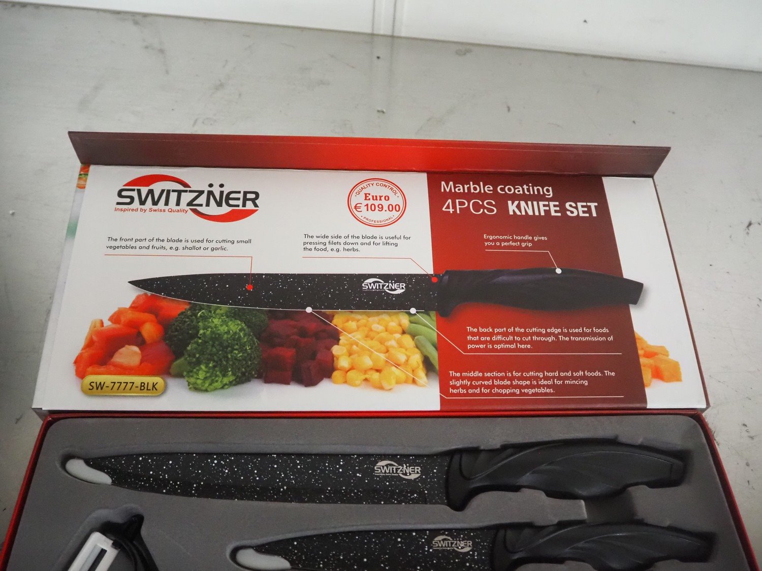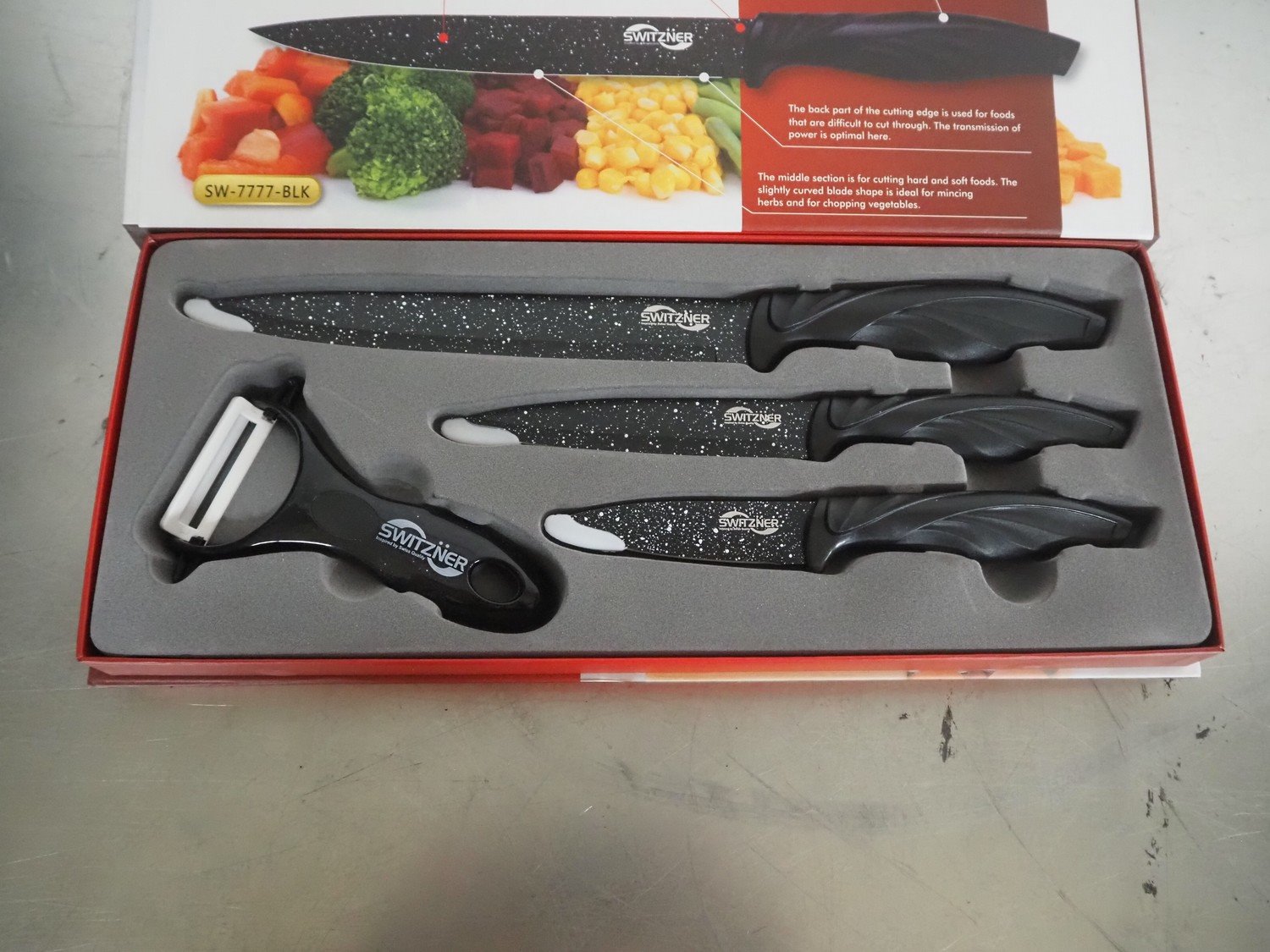 Switzner kitchen knife set, dimensions: 370 mm x 140 mm x 60 mm. Kavel locatie: Looyenbeemd 11, 5652 BH Eindhoven, Nederland