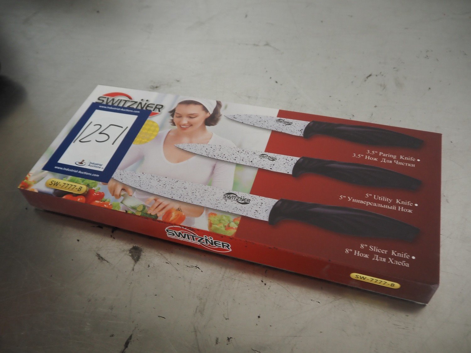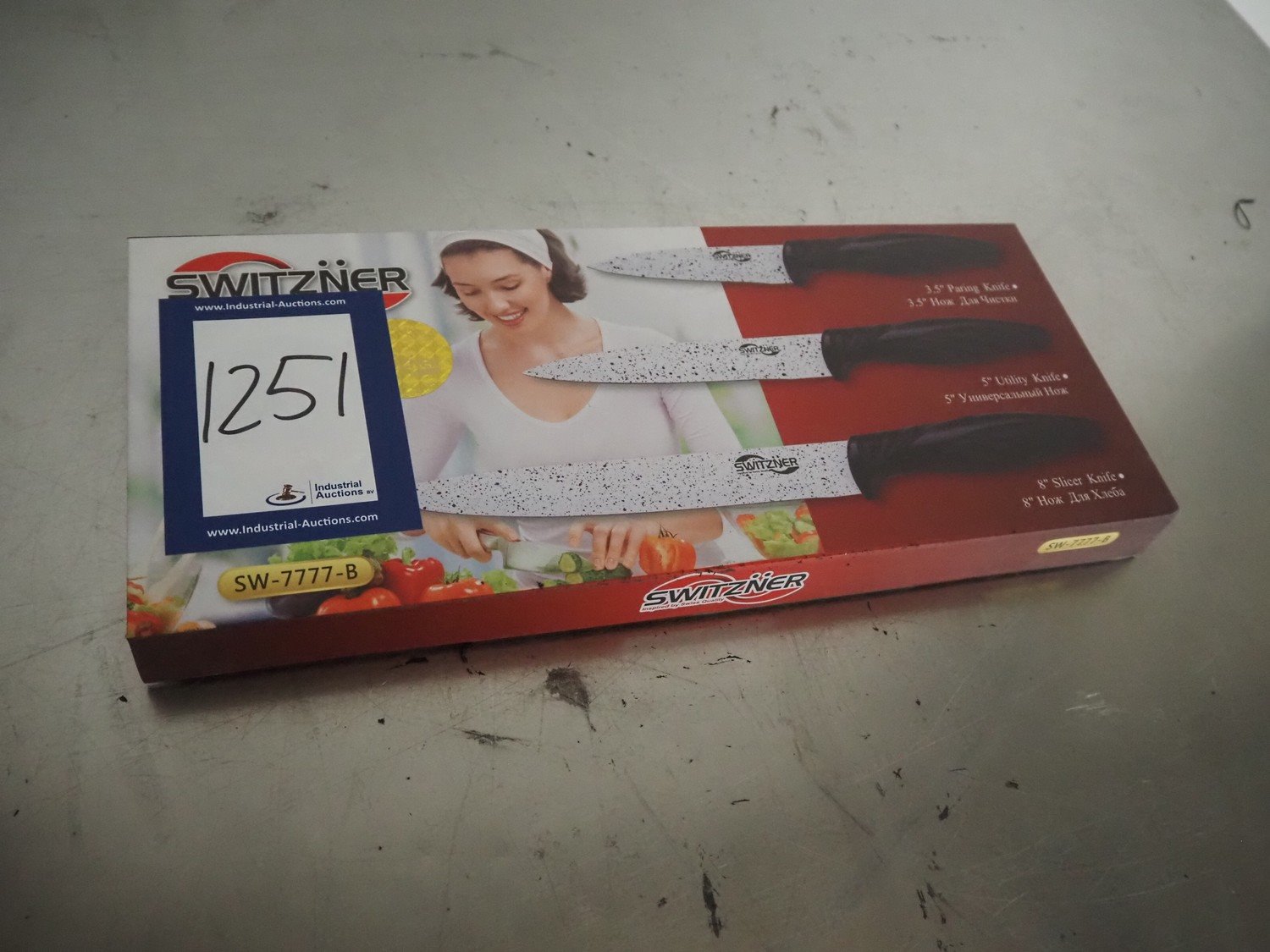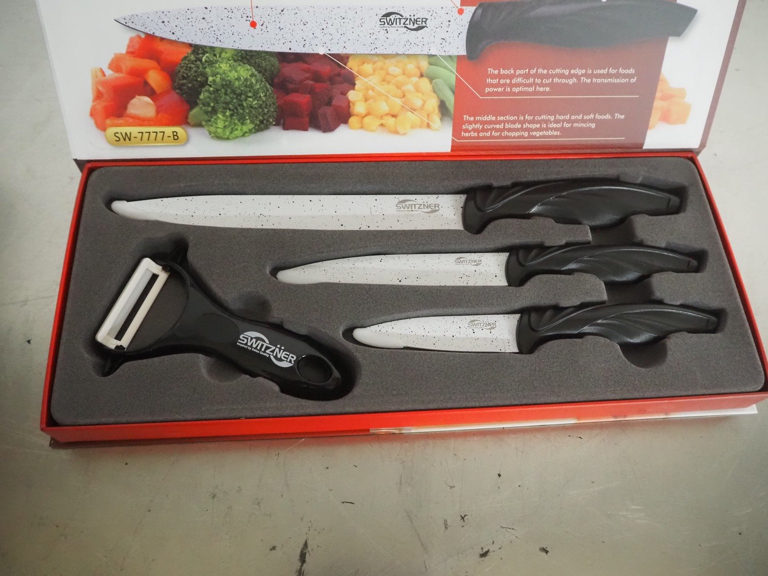 Switzner kitchen knife set, dimensions: 370 mm x 140 mm x 30 mm. Kavel locatie: Looyenbeemd 11, 5652 BH Eindhoven, Nederland