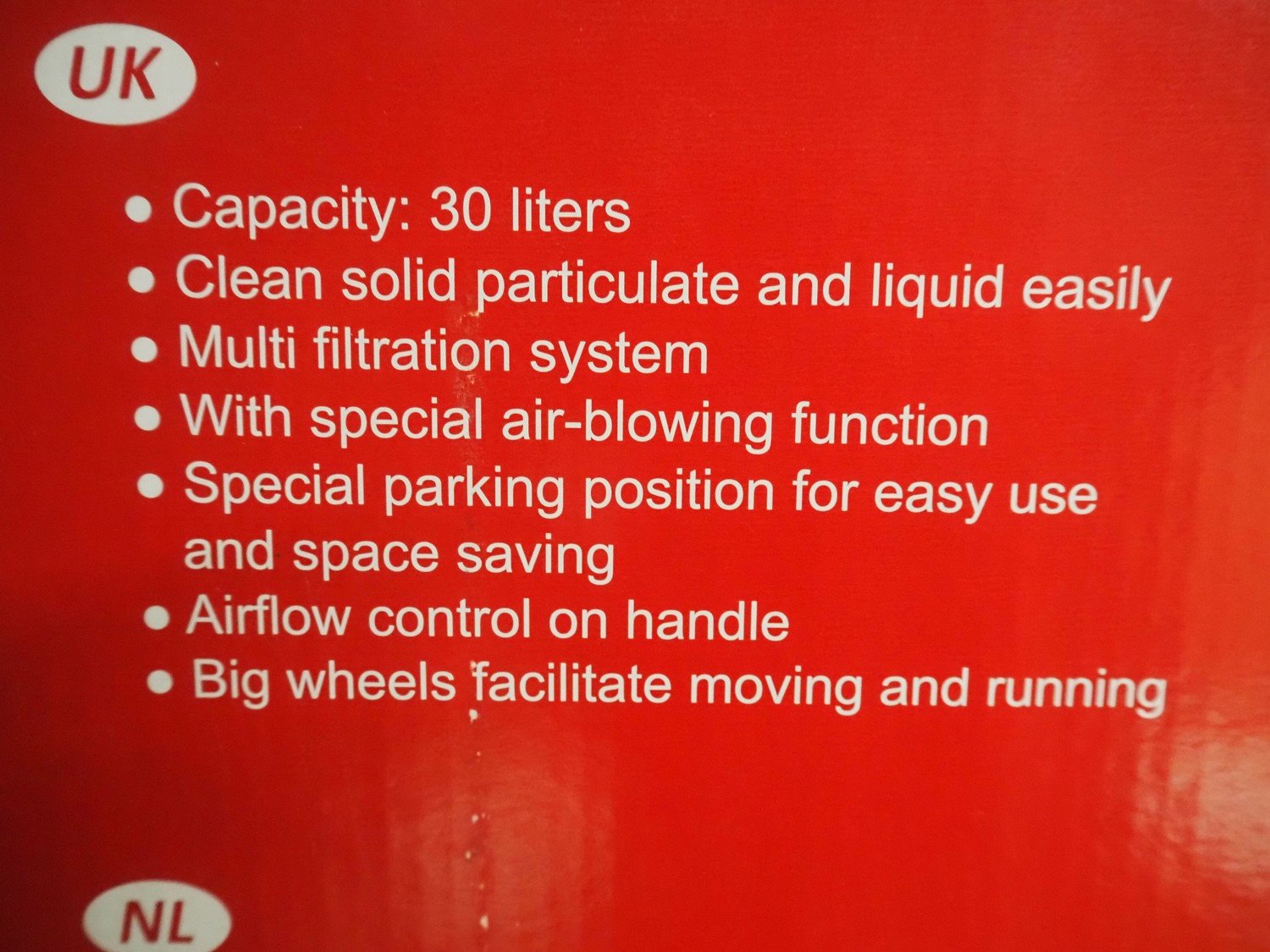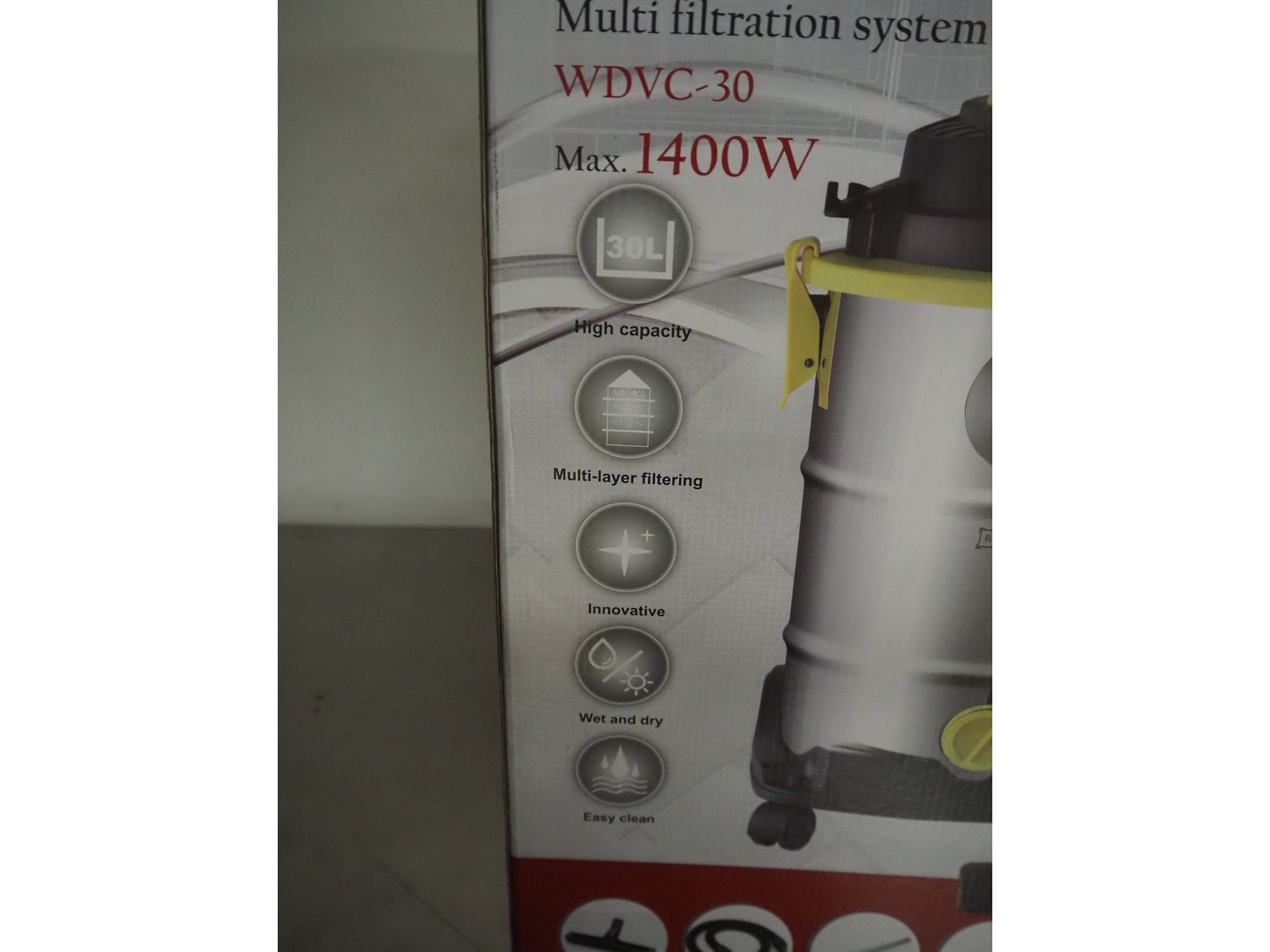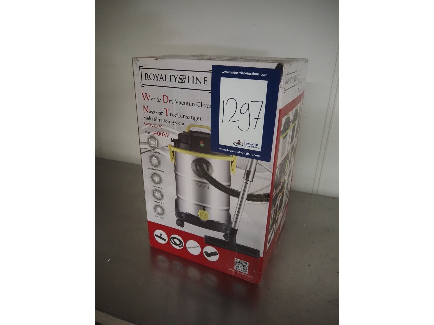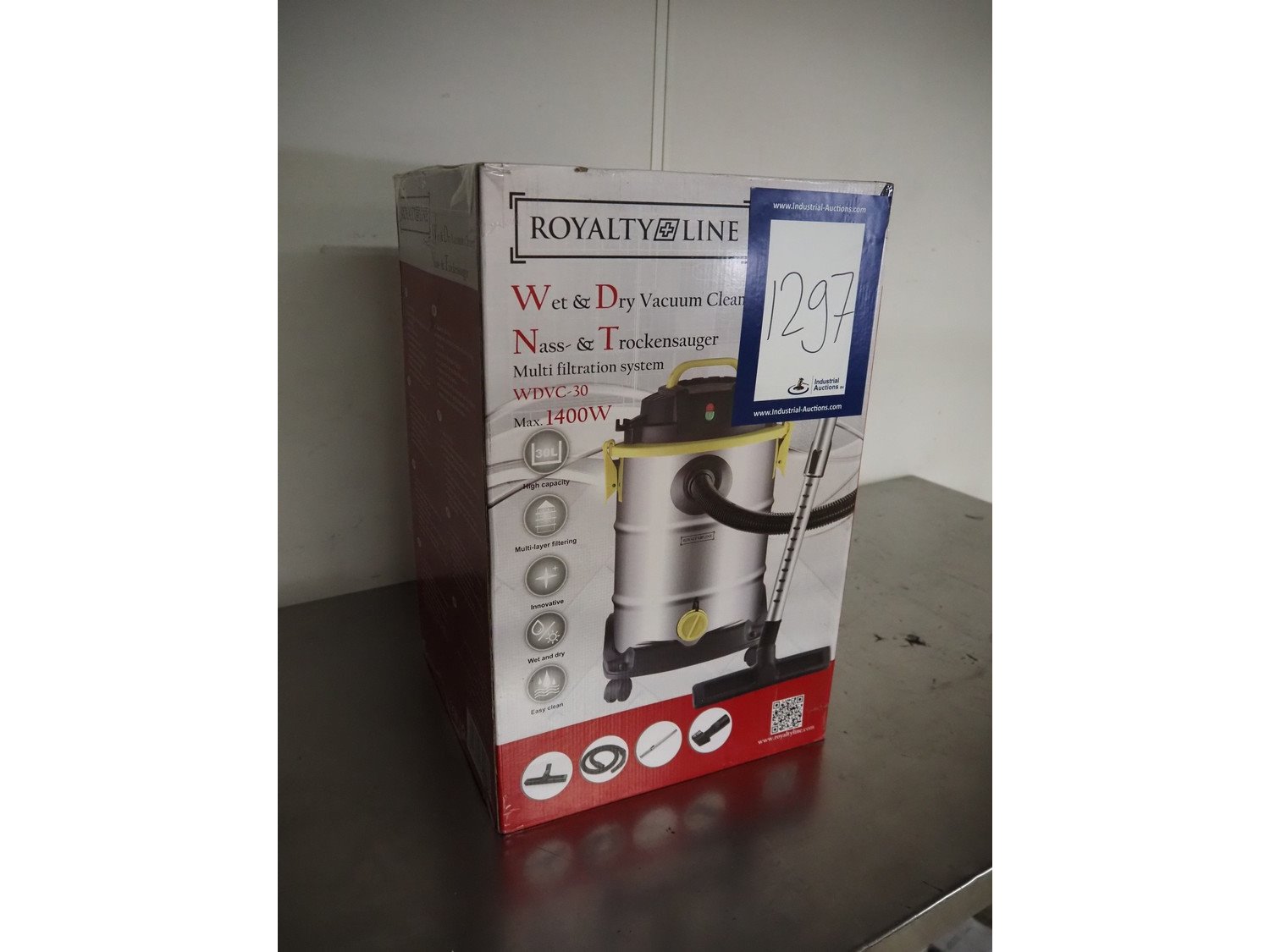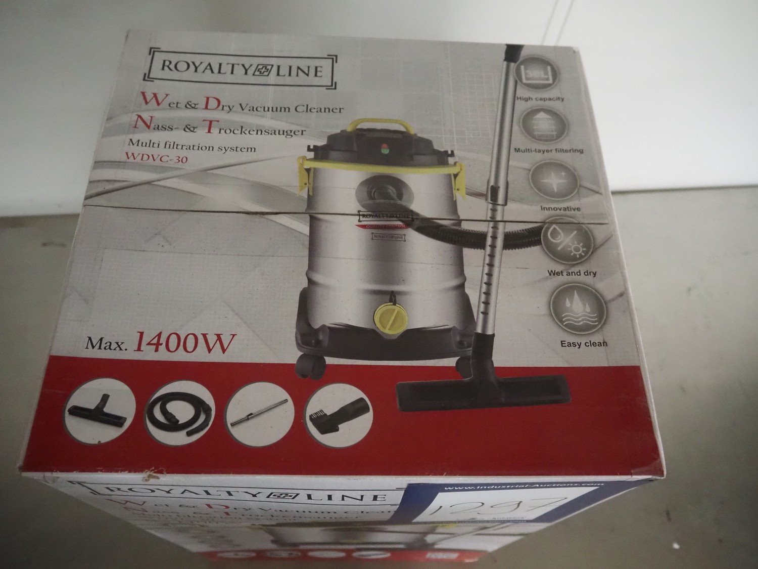 Royalty Line wet and dry vacuum cleaner, model: WDVC-30, 220/240 V, 1 Ph, 50/60 Hz, 1400 W, capacity: 30 liter, dimensions: 370 mm x 350 mm x 570 mm. Kavel locatie: Looyenbeemd 11, 5652 BH Eindhoven, Nederland