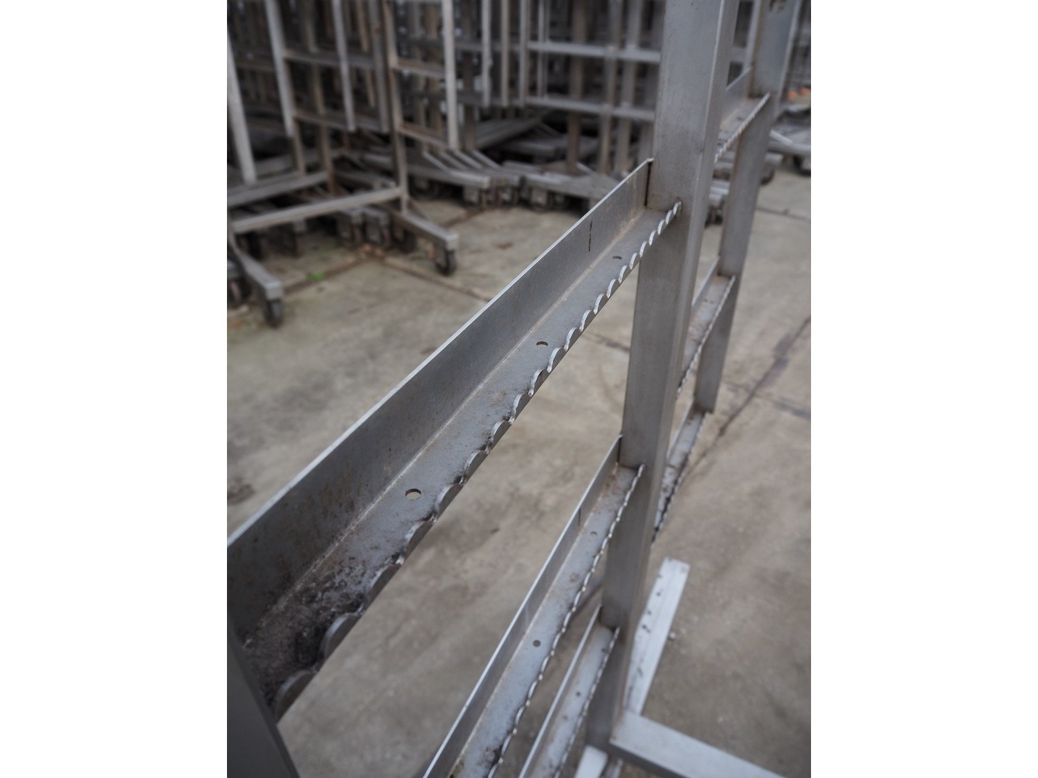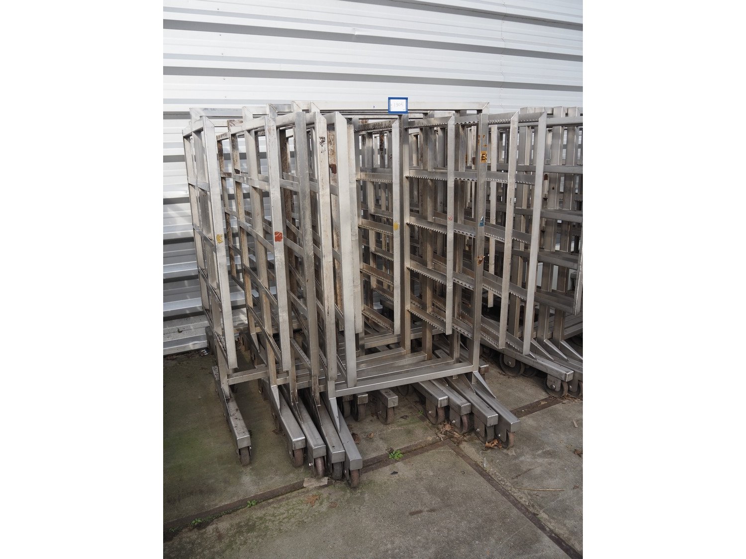10 s/s smoke trolleys, 5 floors each, dimensions each floor: 960 mm x 900 mm, total dimensions: (10x) 960 mm x 910 mm x 1800 mm. Including 20 aluminium y-shaped smoke sticks per trolley, length each smoke stick: 880 mm. Kavel locatie: Looyenbeemd 11, 5652 BH Eindhoven, Nederland