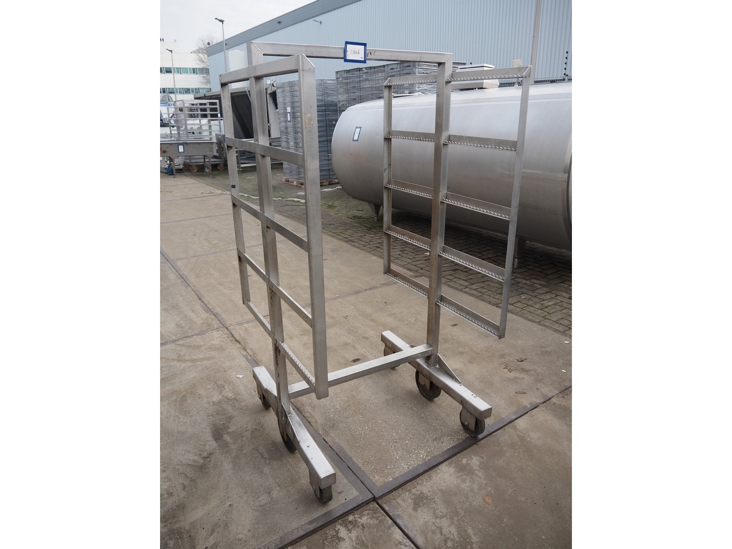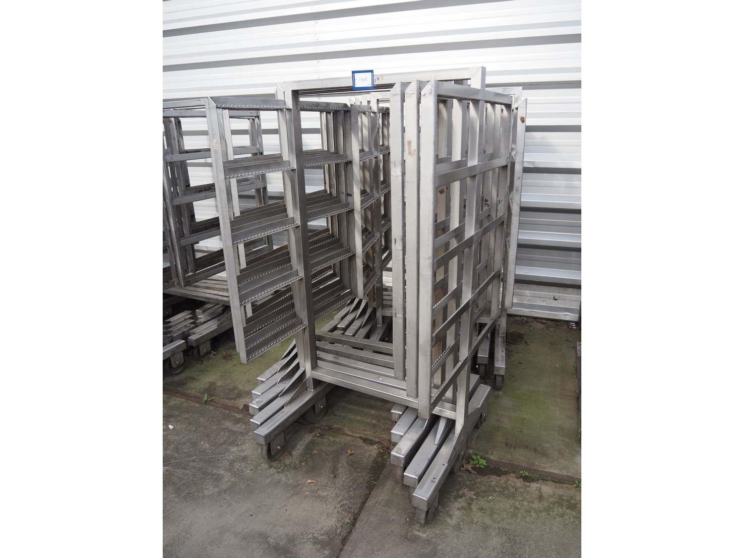 10 s/s smoke trolleys, 5 floors each, dimensions each floor: 960 mm x 900 mm, total dimensions: (10x) 960 mm x 910 mm x 1800 mm. Including 20 aluminium y-shaped smoke sticks per trolley, length each smoke stick: 880 mm. Kavel locatie: Looyenbeemd 11, 5652 BH Eindhoven, Nederland