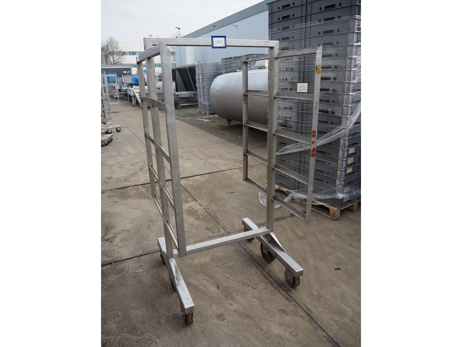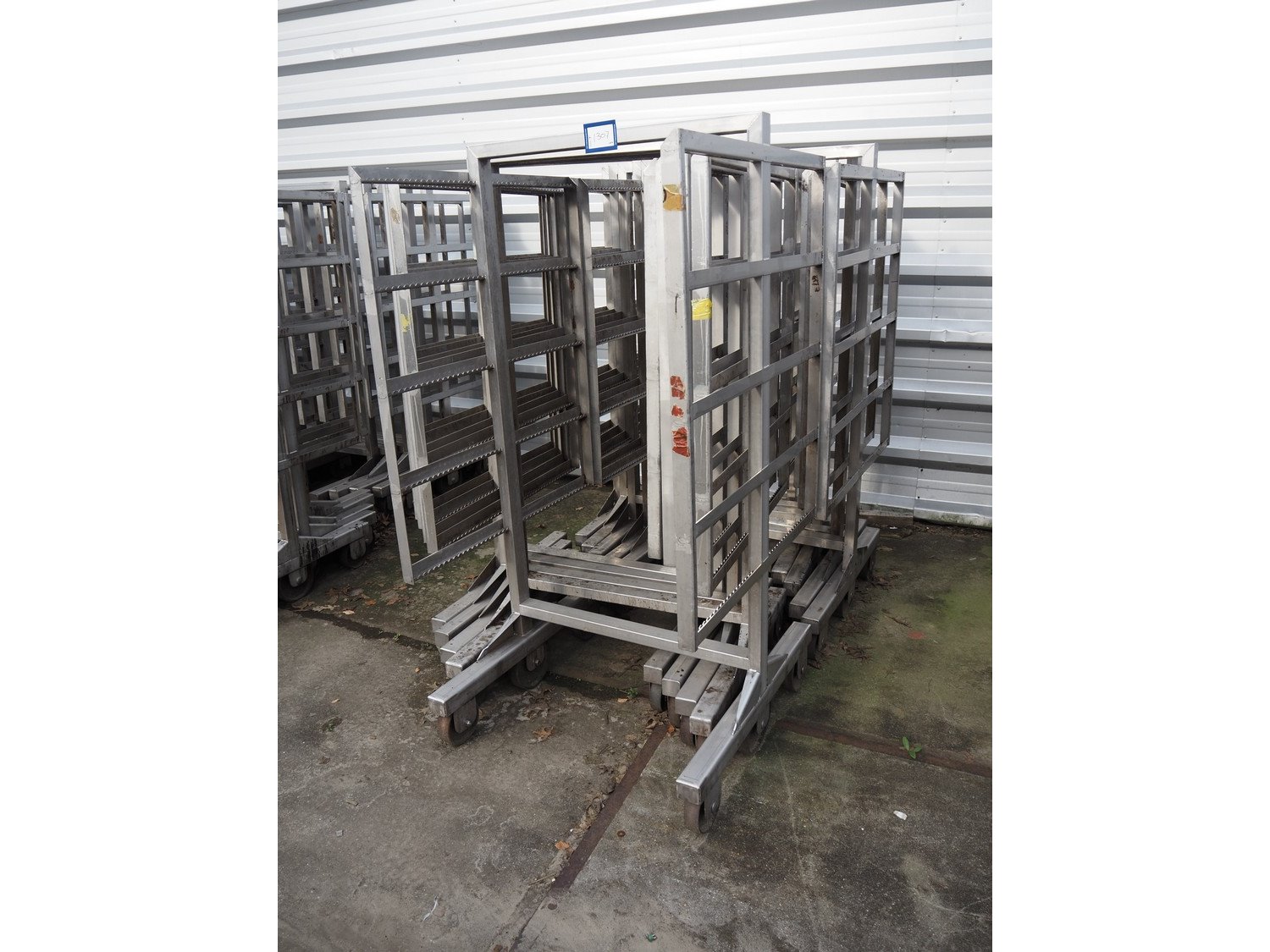 10 s/s smoke trolleys, 5 floors each, dimensions each floor: 960 mm x 900 mm, total dimensions: (10x) 960 mm x 910 mm x 1800 mm. Including 20 aluminium y-shaped smoke sticks per trolley, length each smoke stick: 880 mm. Kavel locatie: Looyenbeemd 11, 5652 BH Eindhoven, Nederland