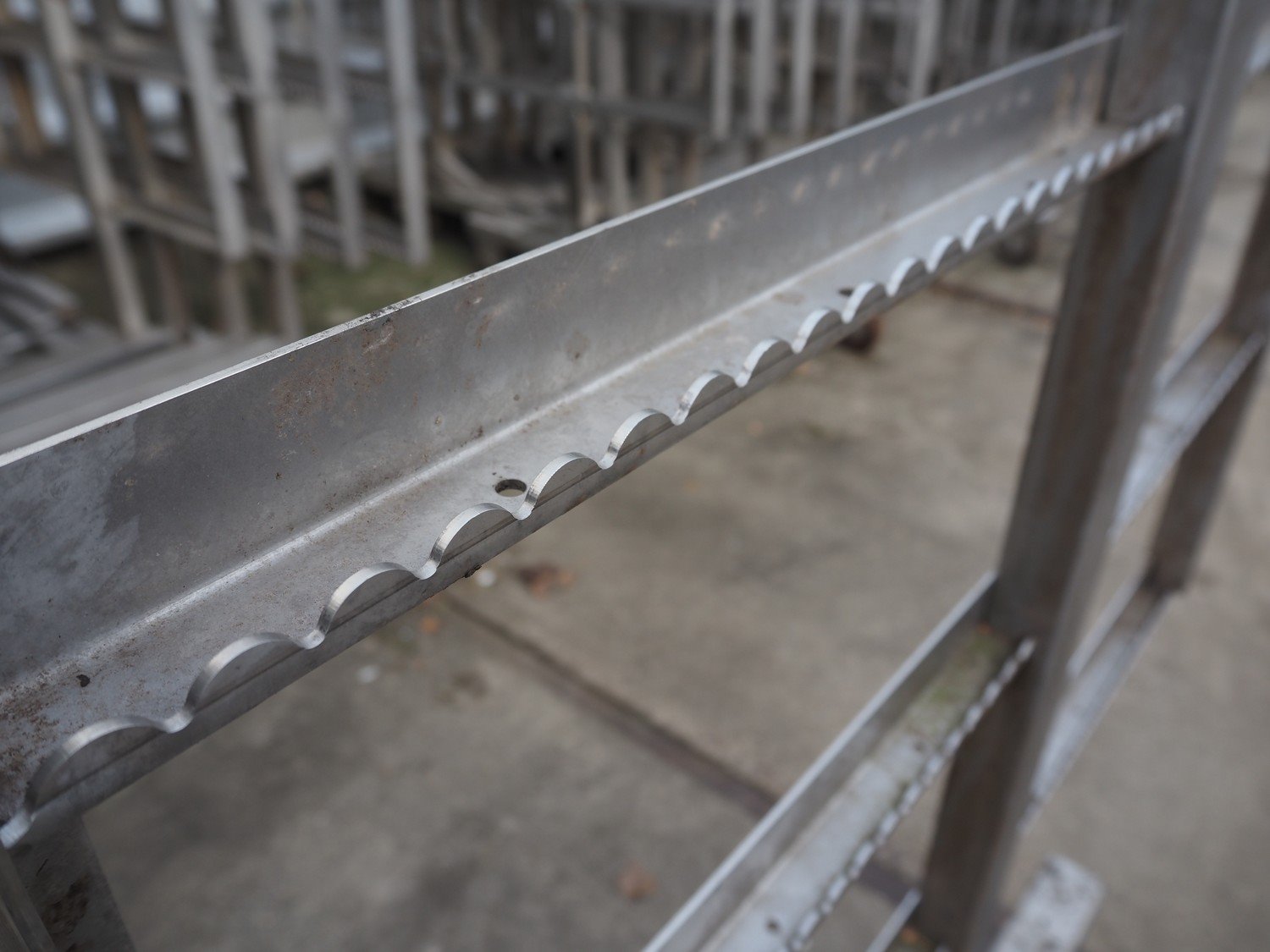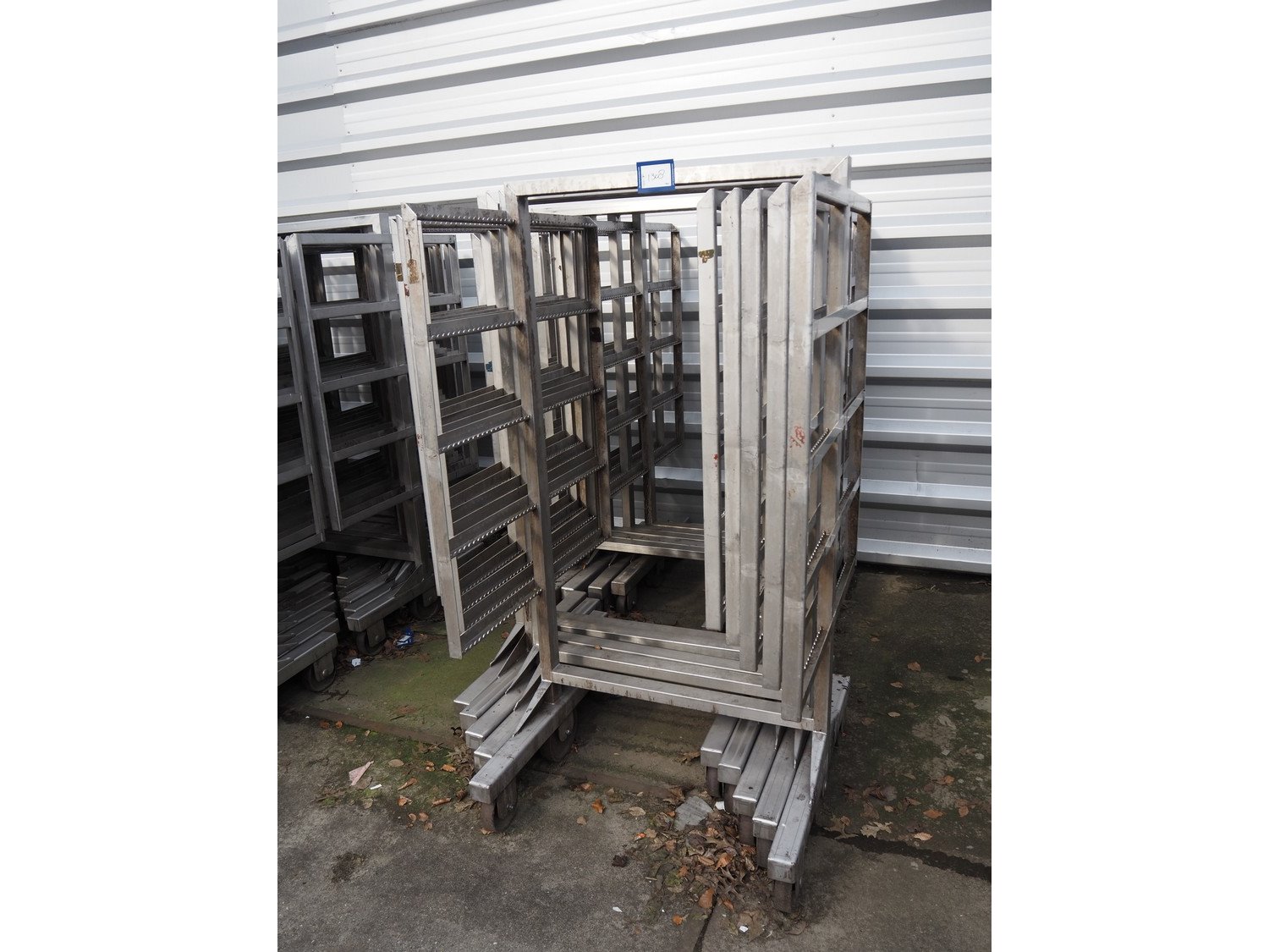10 s/s smoke trolleys, 5 floors each, dimensions each floor: 960 mm x 900 mm, total dimensions: (10x) 960 mm x 910 mm x 1800 mm. Including 20 aluminium y-shaped smoke sticks per trolley, length each smoke stick: 880 mm. Kavel locatie: Looyenbeemd 11, 5652 BH Eindhoven, Nederland