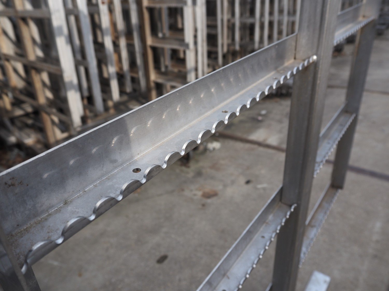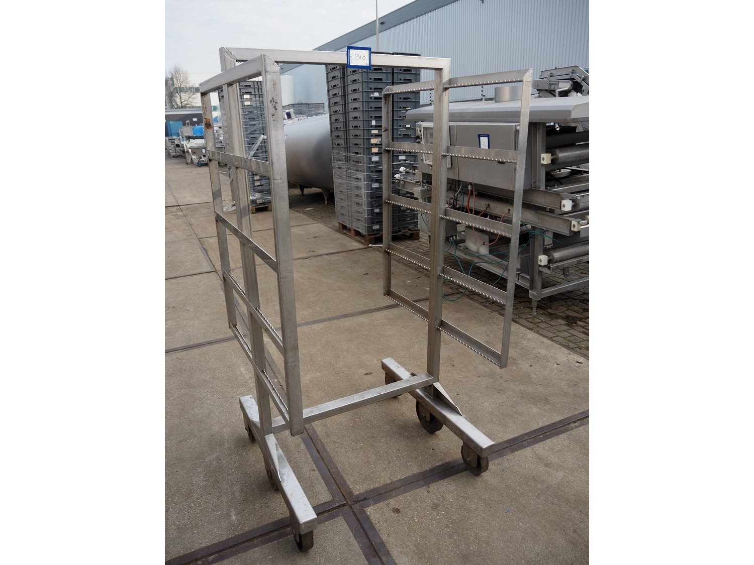 19 s/s smoke trolleys, 5 floors each, dimensions each floor: 960 mm x 900 mm, total dimensions: (19x) 960 mm x 910 mm x 1800 mm. Including 20 aluminium y-shaped smoke sticks per trolley, length each smoke stick: 880 mm. Kavel locatie: Looyenbeemd 11, 5652 BH Eindhoven, Nederland