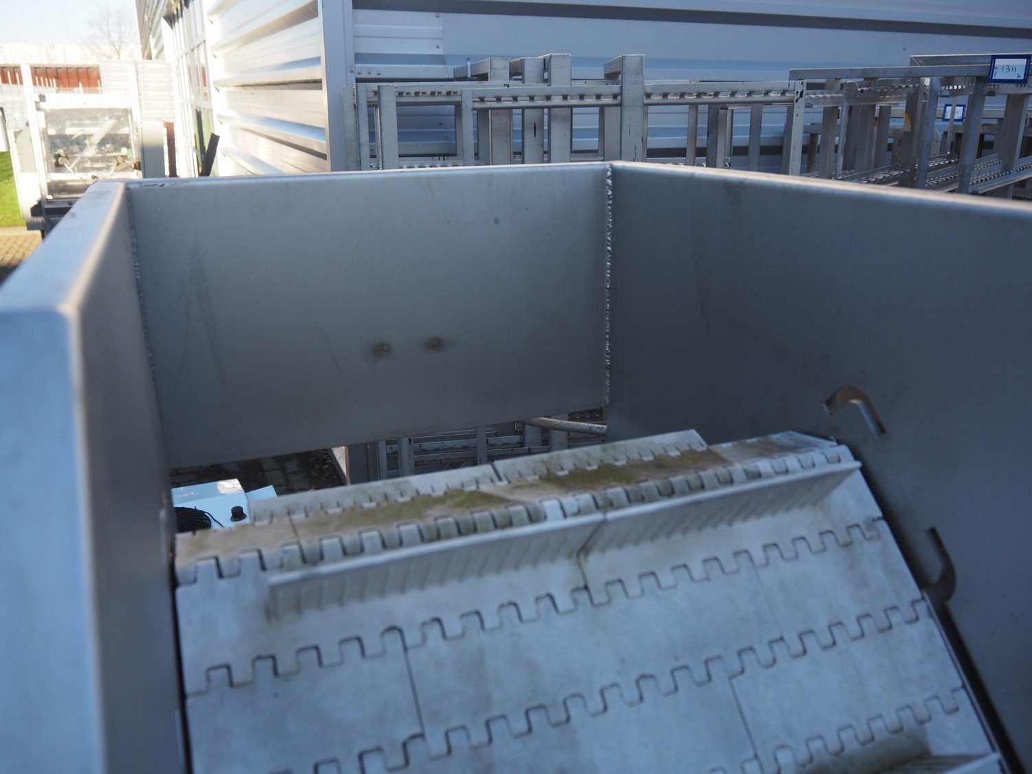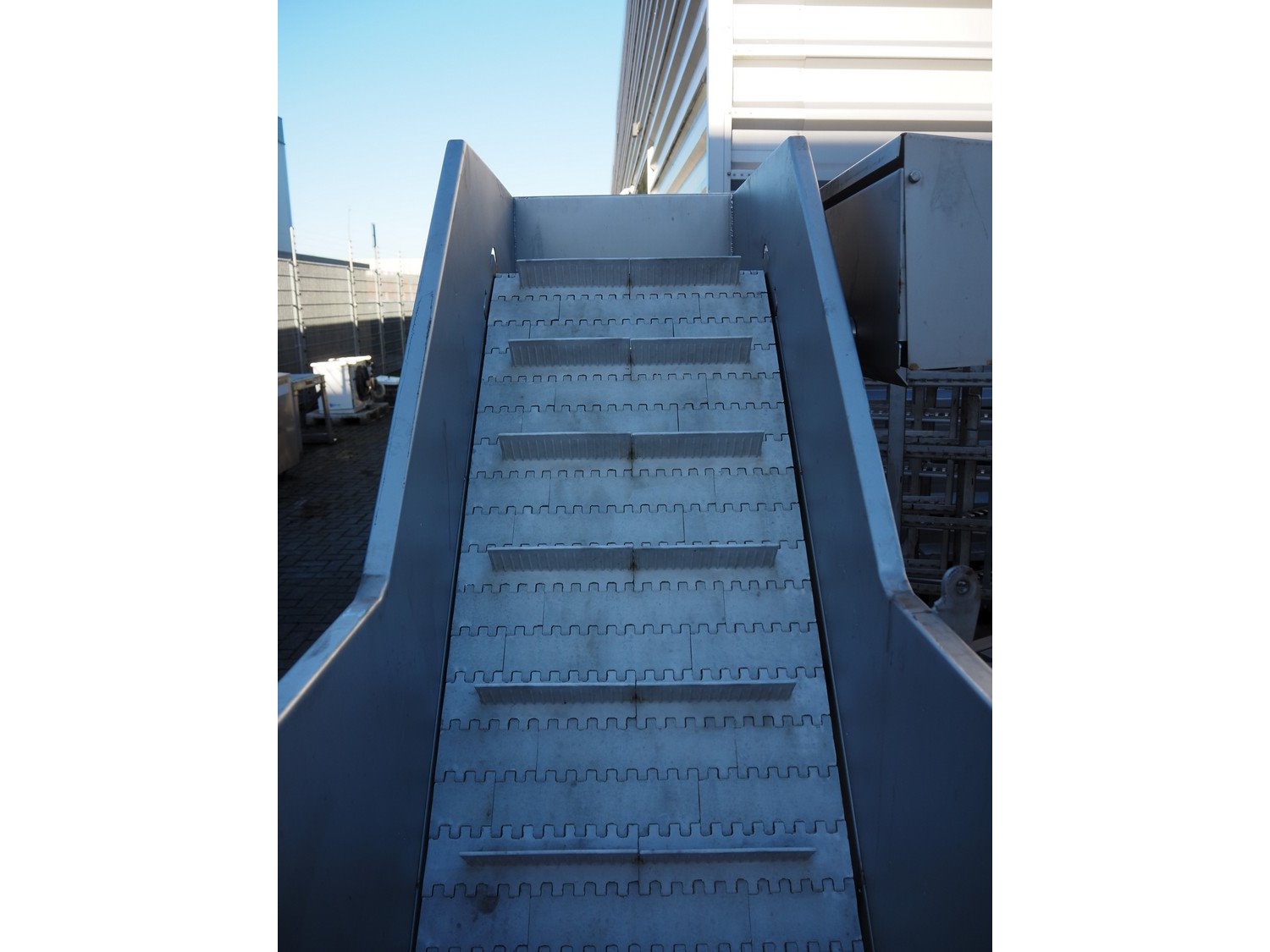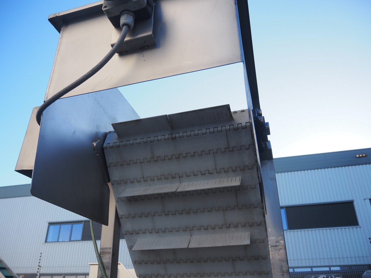 MKM elevating belt, serial number: 01, year of construction: 2015, 400 V, plastic belt with dividers, belt width: 400 mm, divider height: 50 mm, distance between dividers: 150 mm, elevating height: 1650 mm, total dimensions: 1600 mm x 700 mm x 1800 mm. Kavel locatie: Looyenbeemd 11, 5652 BH Eindhoven, Nederland
