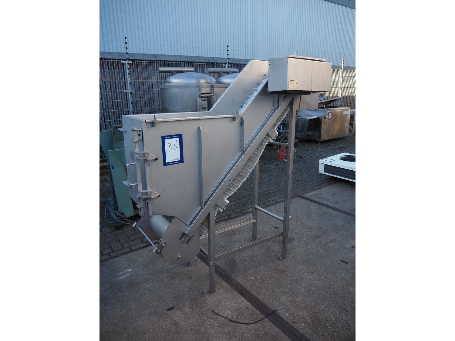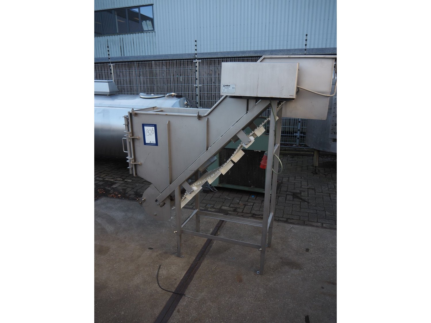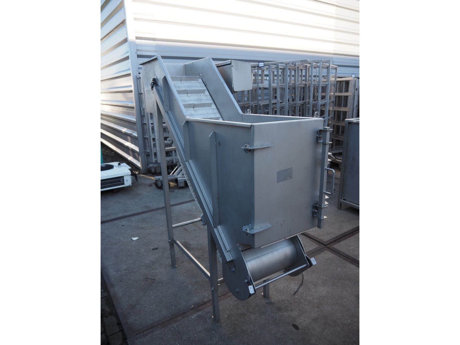 MKM elevating belt, serial number: 01, year of construction: 2015, 400 V, plastic belt with dividers, belt width: 400 mm, divider height: 50 mm, distance between dividers: 150 mm, elevating height: 1650 mm, total dimensions: 1600 mm x 700 mm x 1800 mm. Kavel locatie: Looyenbeemd 11, 5652 BH Eindhoven, Nederland