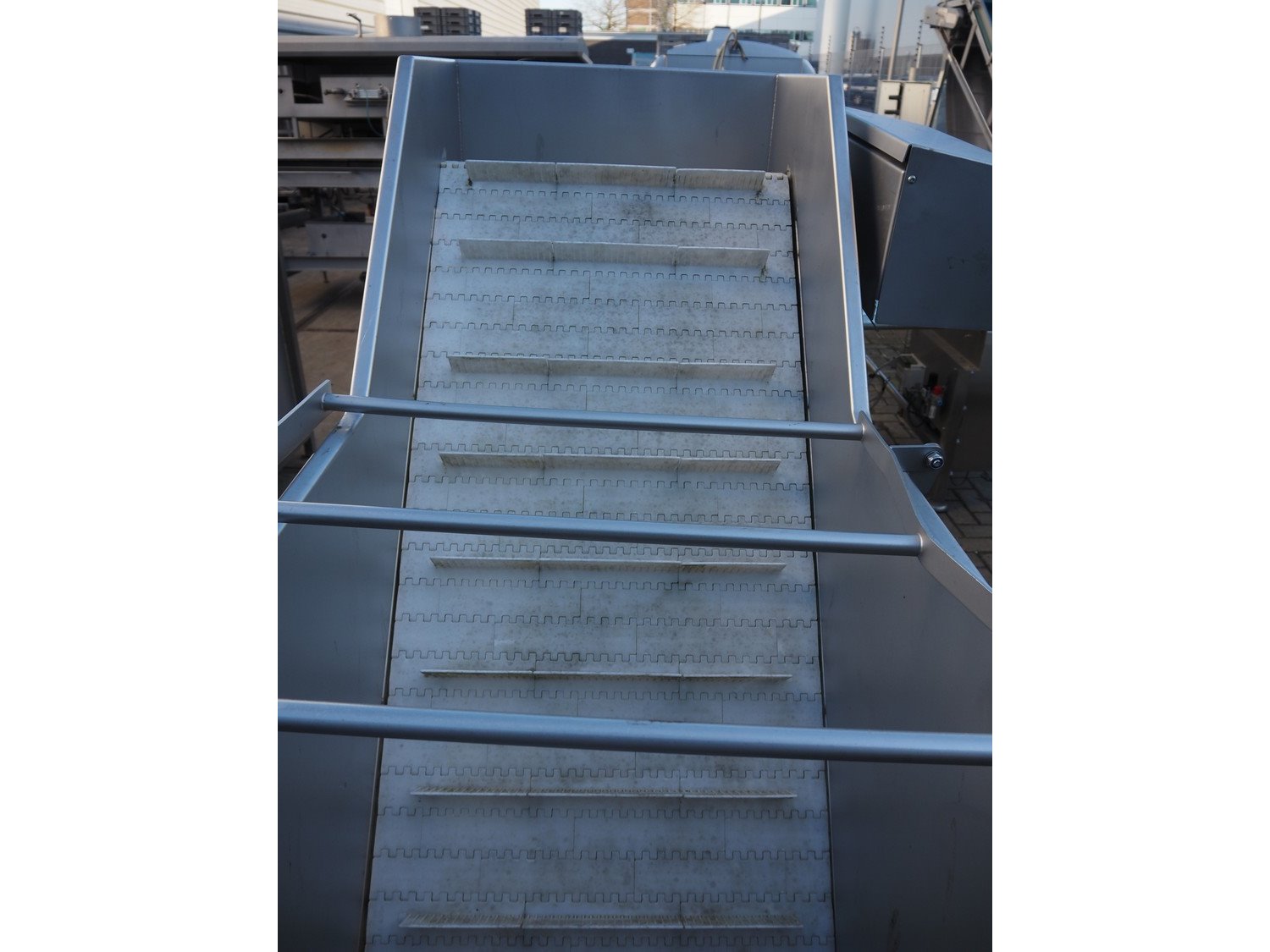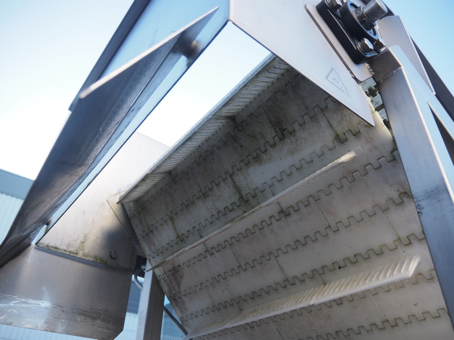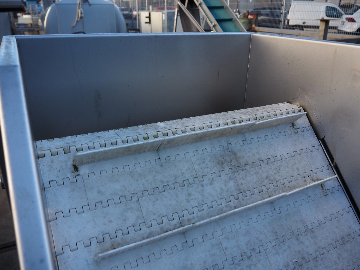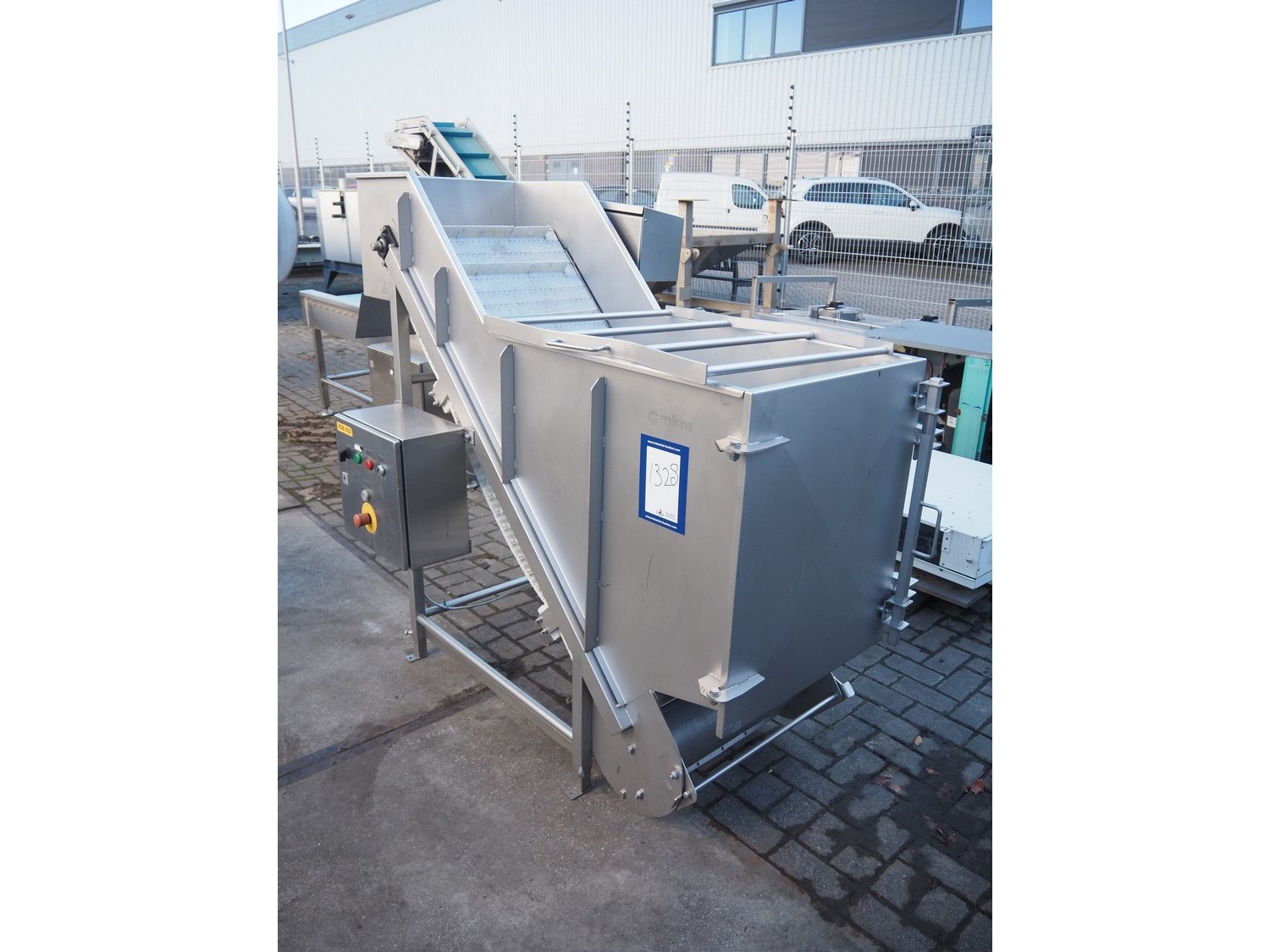 MKM elevating belt, year of construction: 2013, 400 V, plastic belt with dividers, belt width: 600 mm, divider height: 50 mm, distance between dividers: 210 mm, elevating height: 1450 mm, total dimensions: 1700 mm x 900 mm x 1600 mm. Kavel locatie: Looyenbeemd 11, 5652 BH Eindhoven, Nederland