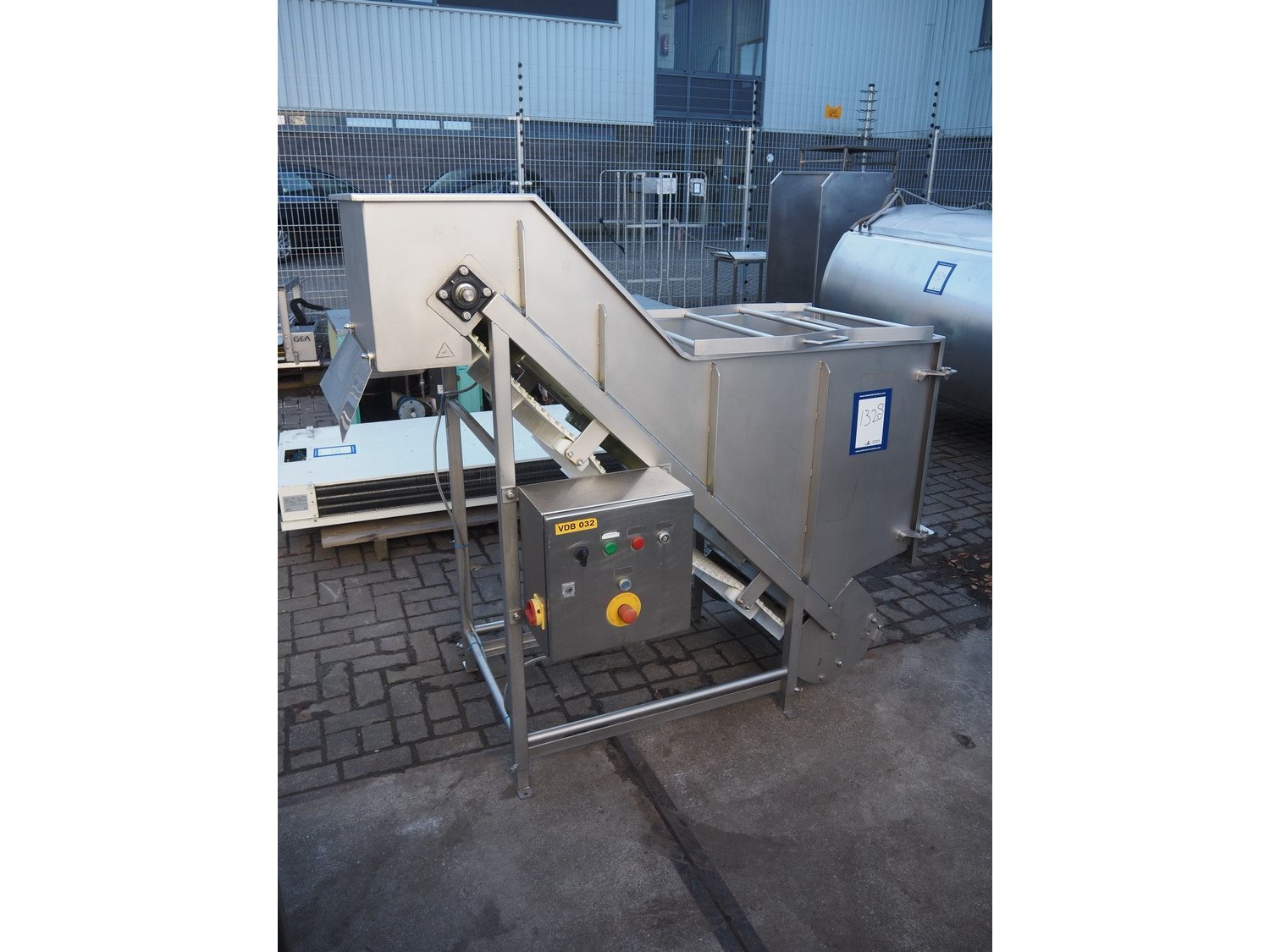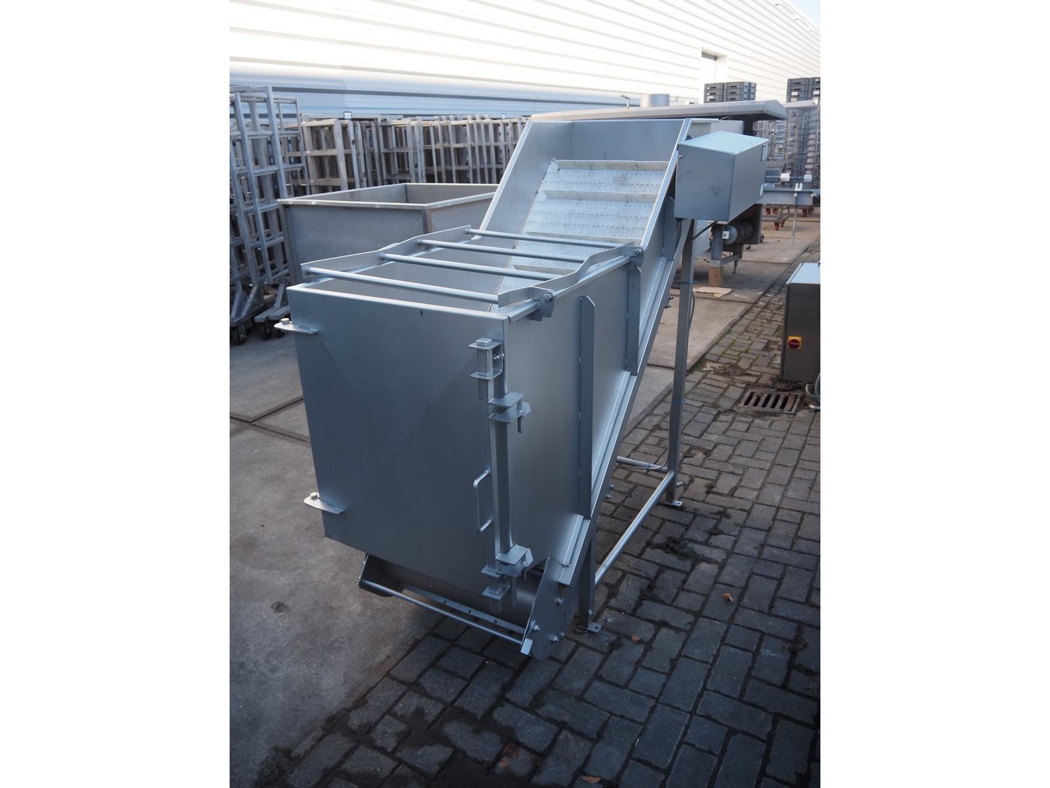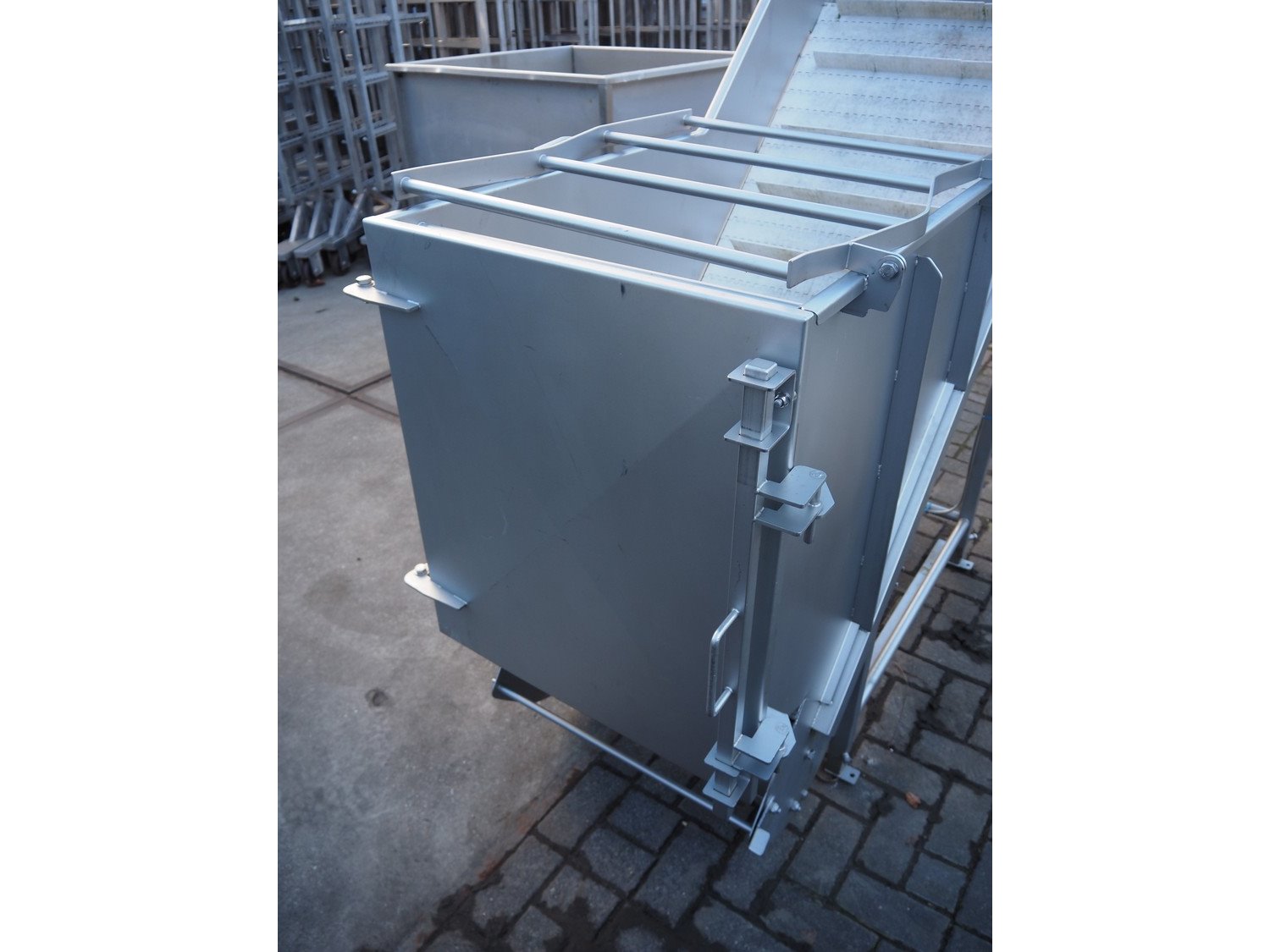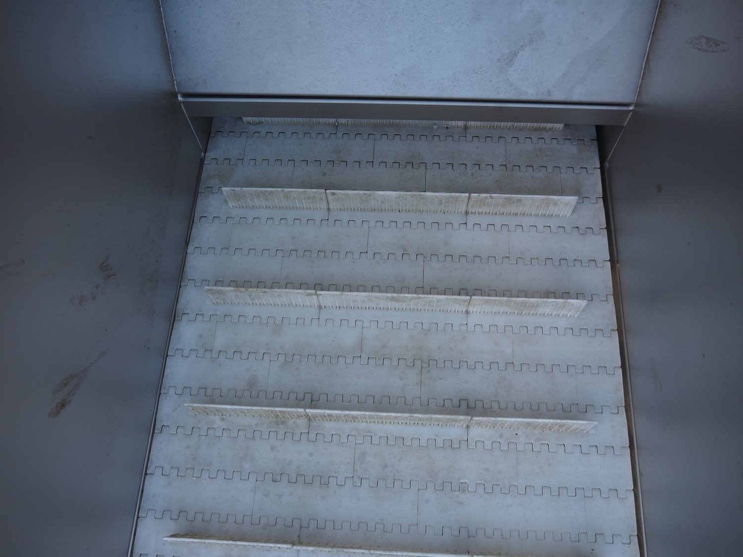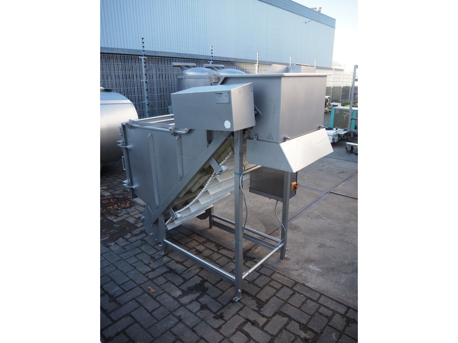 MKM elevating belt, year of construction: 2013, 400 V, plastic belt with dividers, belt width: 600 mm, divider height: 50 mm, distance between dividers: 210 mm, elevating height: 1450 mm, total dimensions: 1700 mm x 900 mm x 1600 mm. Kavel locatie: Looyenbeemd 11, 5652 BH Eindhoven, Nederland