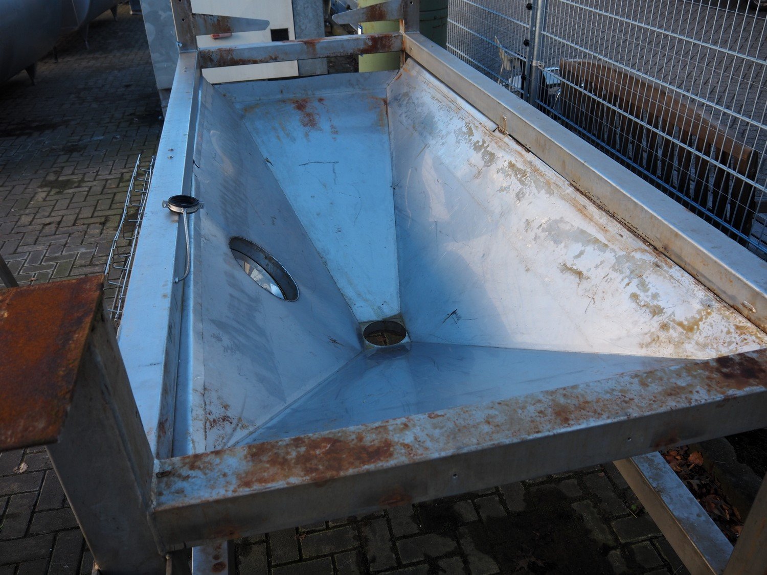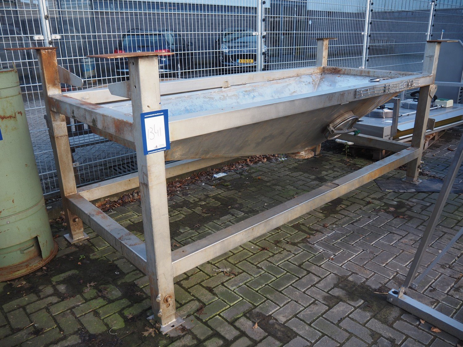 S/s infeed gutter, dimensions: 3700 mm x 1600 mm x 1480 mm. Kavel locatie: Looyenbeemd 11, 5652 BH Eindhoven, Nederland