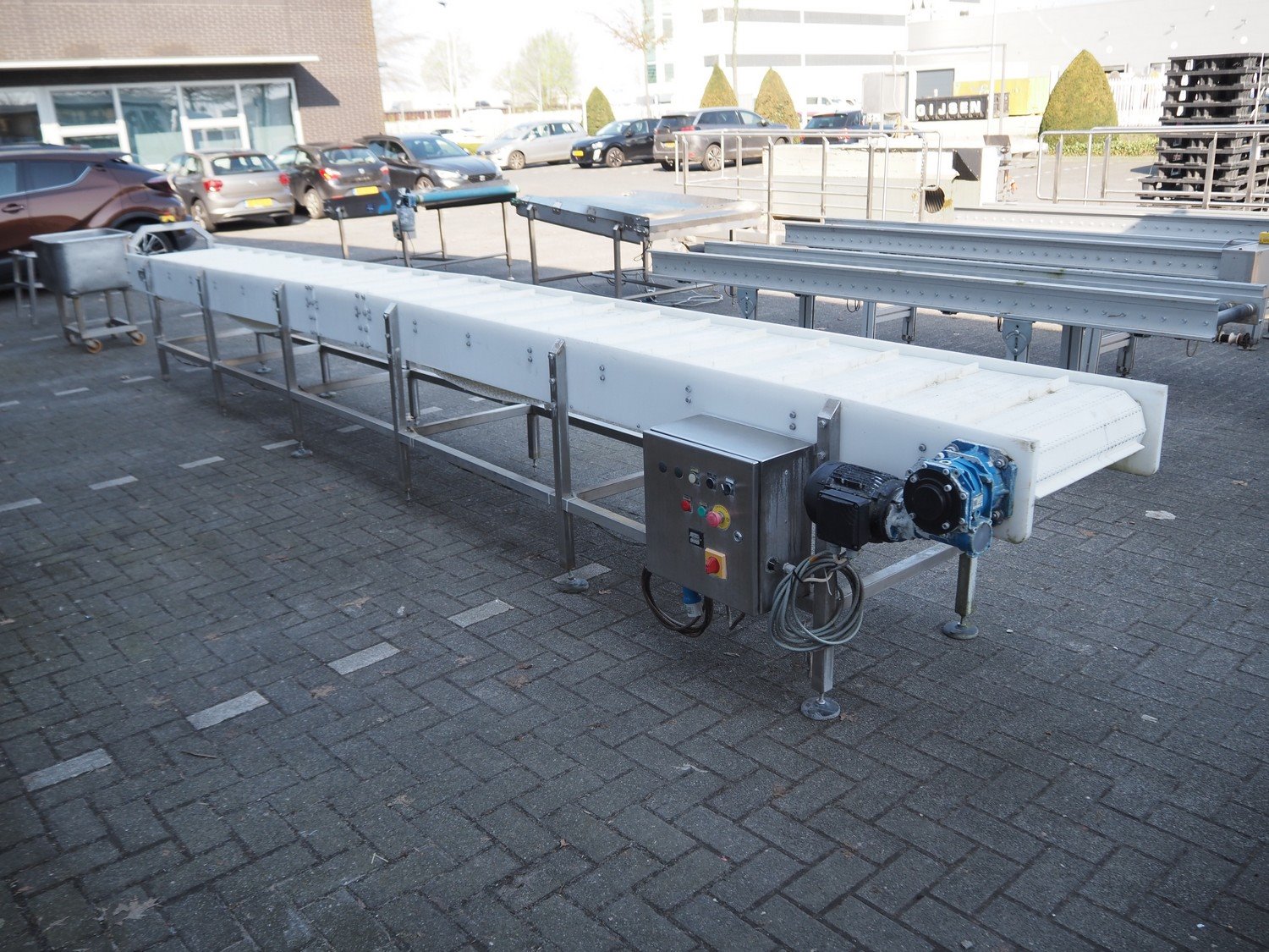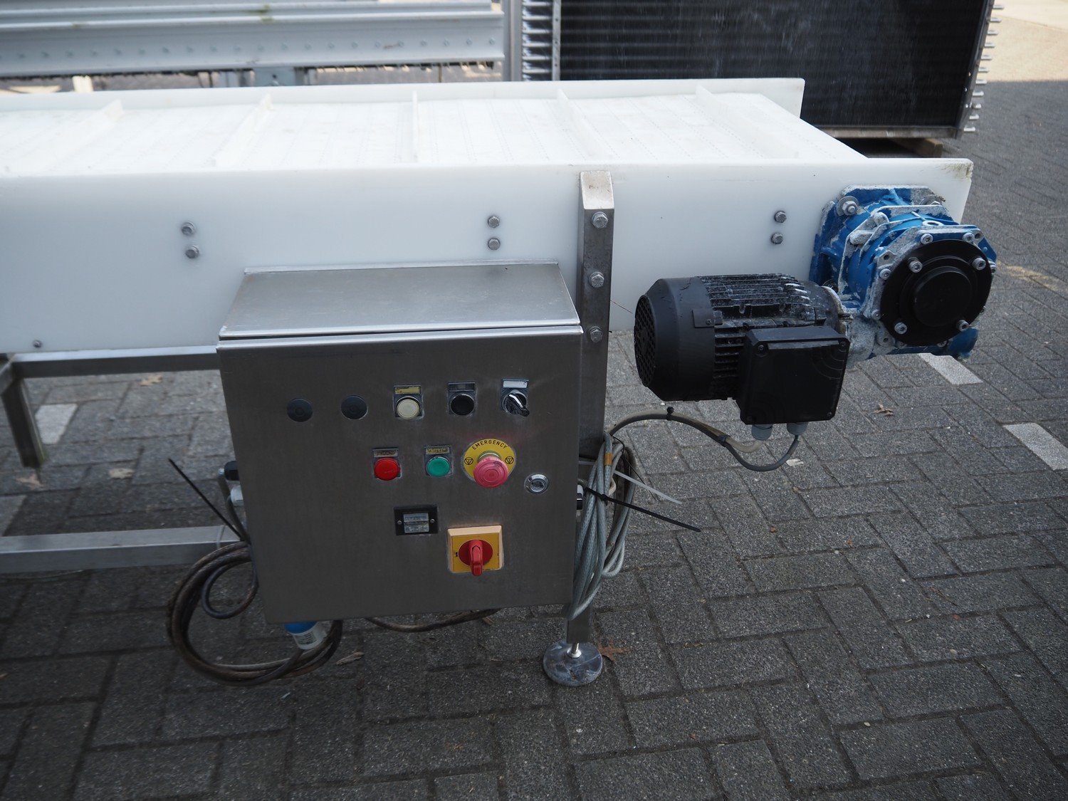 Transport belt, s/s frame, plastic belt with dividers, belt width: 550 mm, divider height: 25 mm, total dimensions: 260 mm, total dimensions: 6500 mm x 900 mm x 1000 mm. Kavel locatie: Looyenbeemd 11, 5652 BH Eindhoven, Nederland