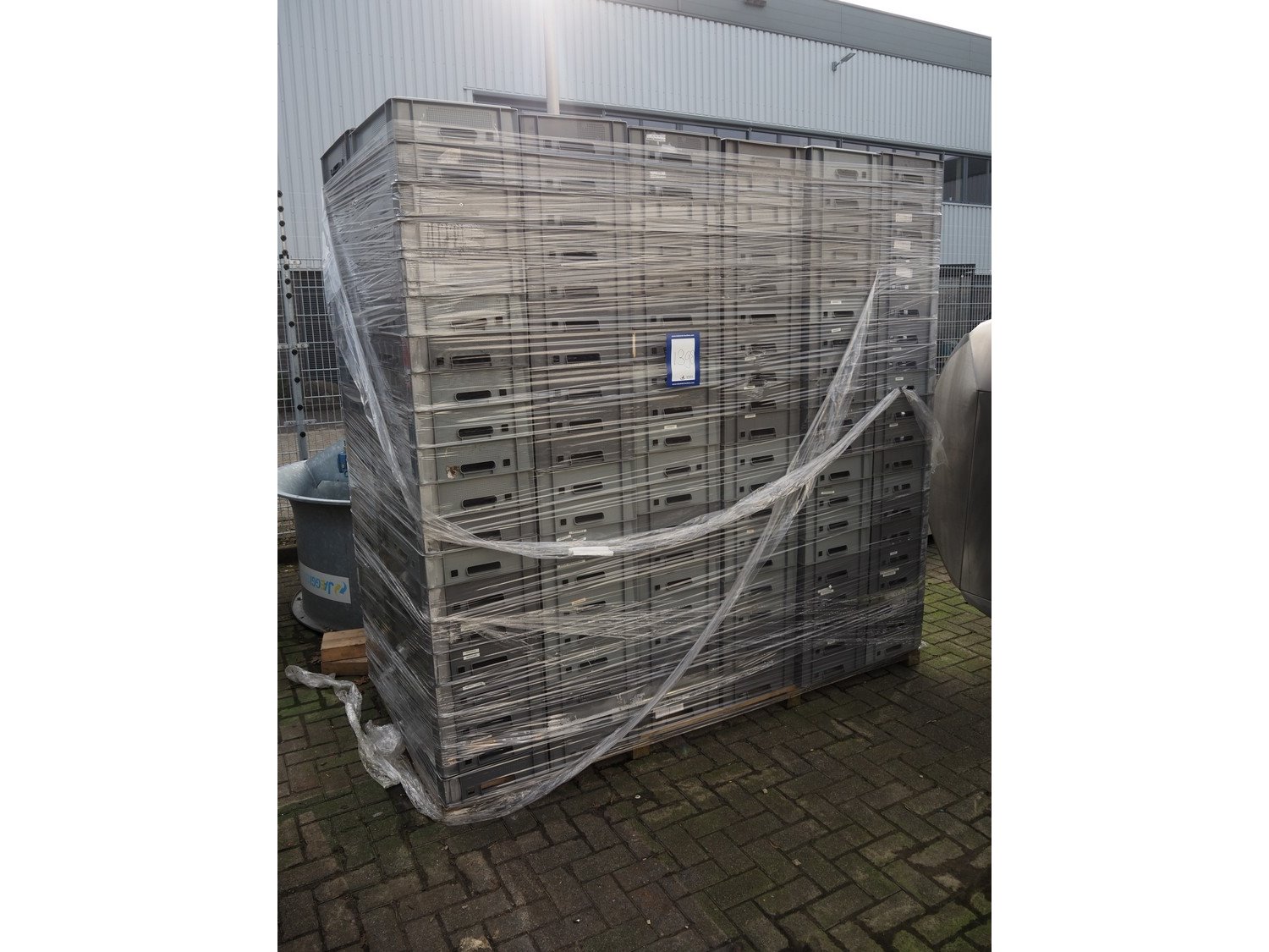 Pallet with 240 plastic crates, dimensions each crate: 600 mm x 400 mm x 110 mm, total dimensions: 2400 mm x 1200 mm x 2400 mm. Kavel locatie: Looyenbeemd 11, 5652 BH Eindhoven, Nederland