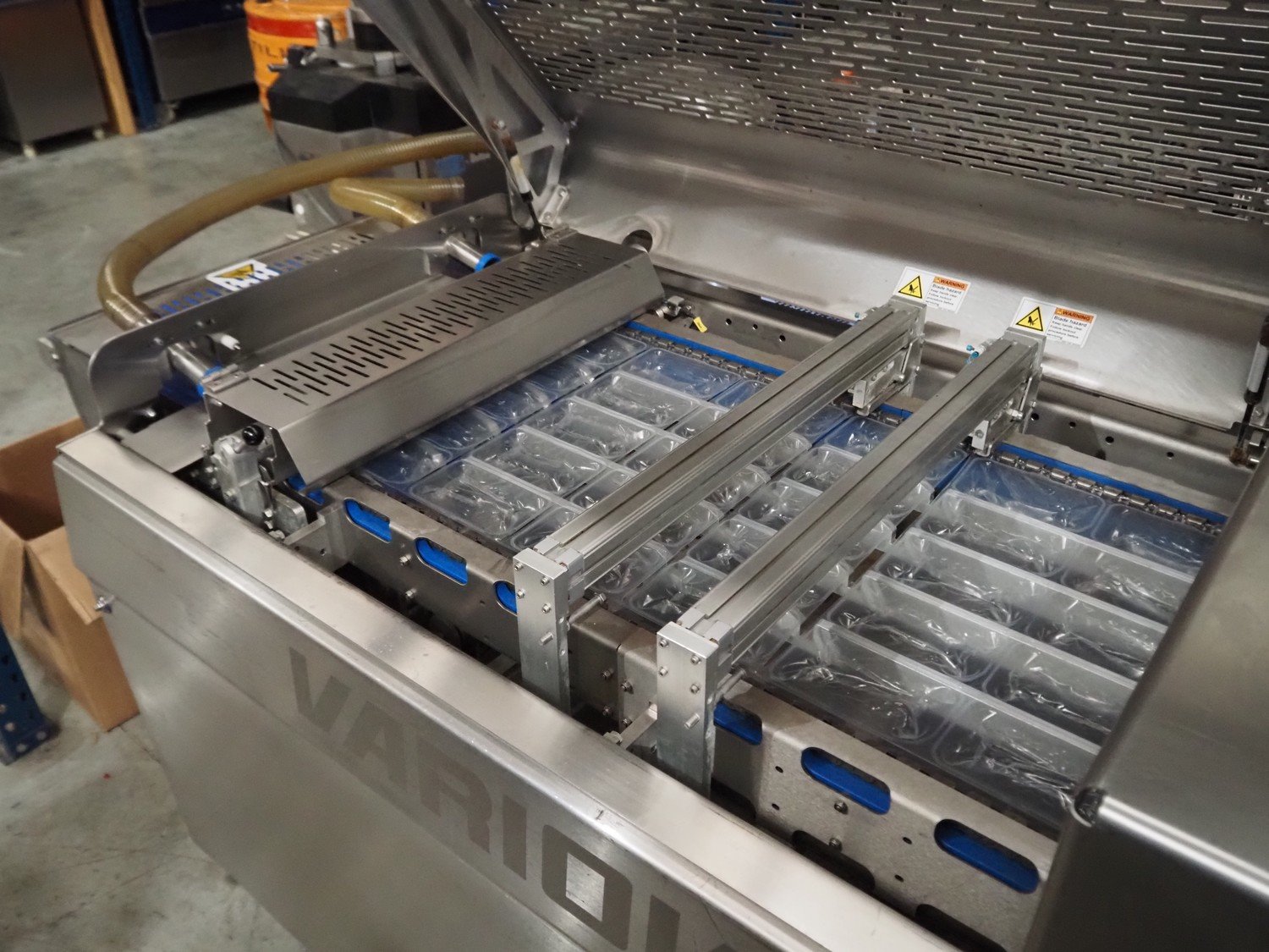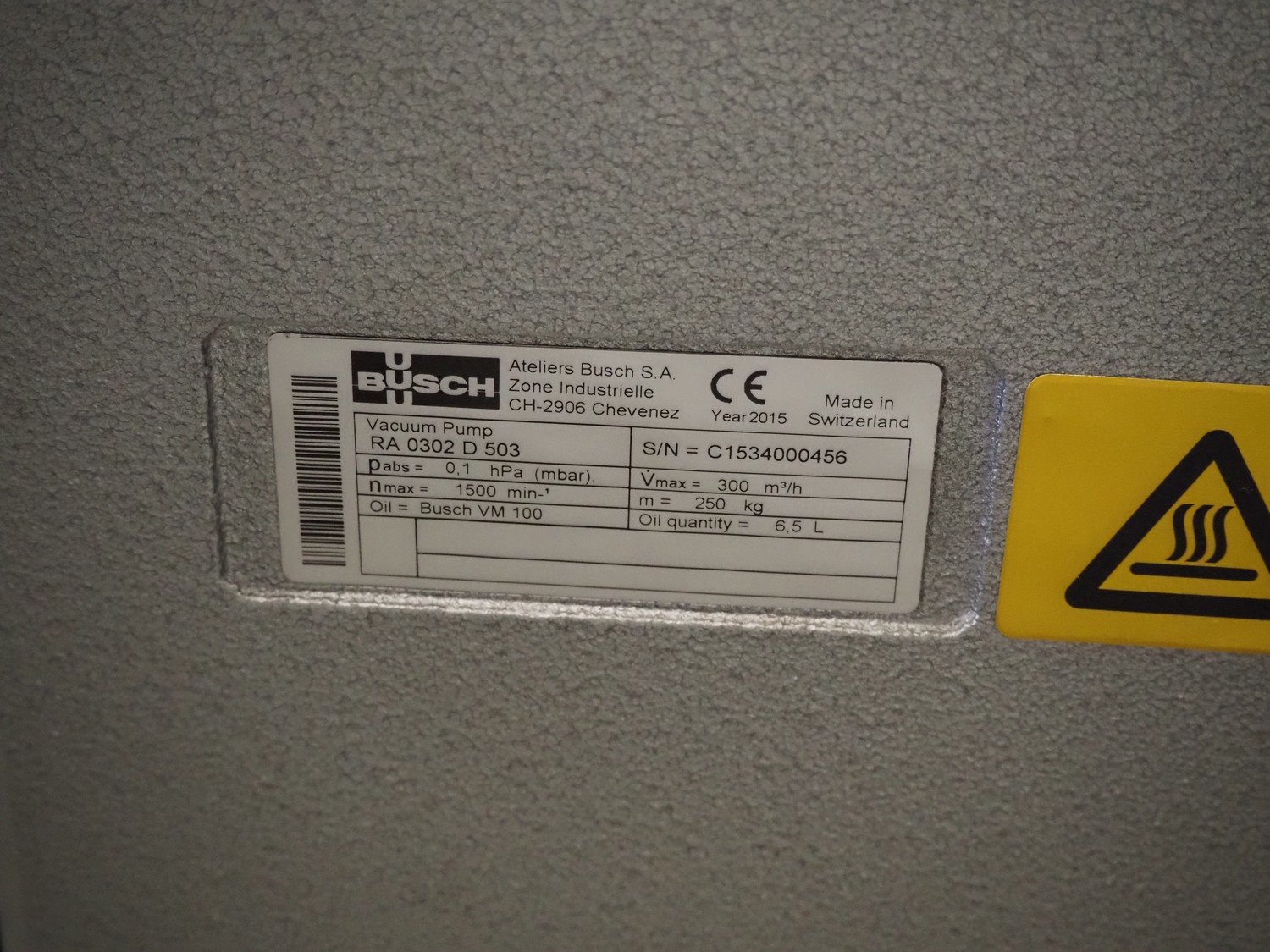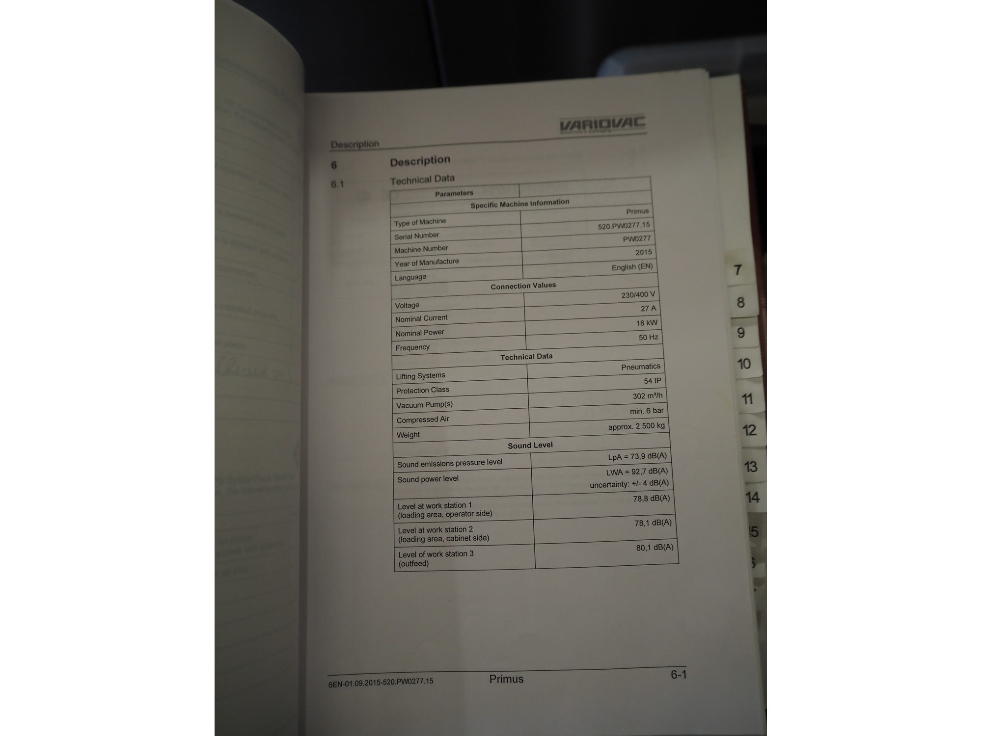 Variovac thermoformer, type: PRIMUS, serial number: PW0277, year of construction: 2015, 400 V, 50 Hz, 27 A, dye dimensions: (10x) 150 mm x 85 mm, index: 510 mm, including Busch vacuum pump, type: RA 0302 D 503, capacity: 300 m³ per hour, total dimensions: 8000 mm x 1300 mm x 1880 mm. Kavel locatie: Scottweg 23, 4462 GS Goes, Nederland